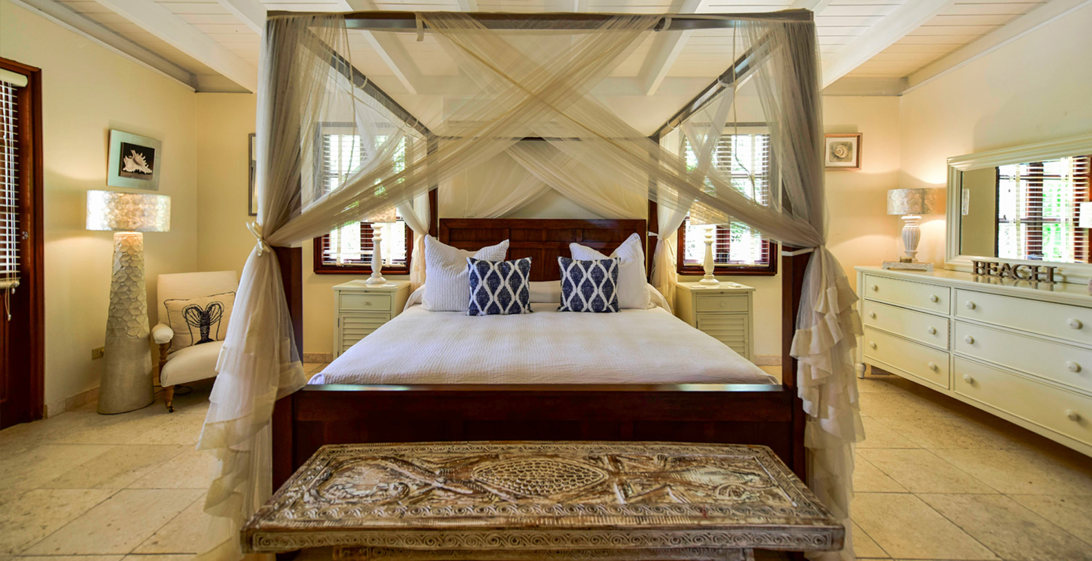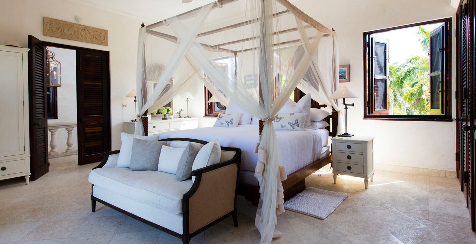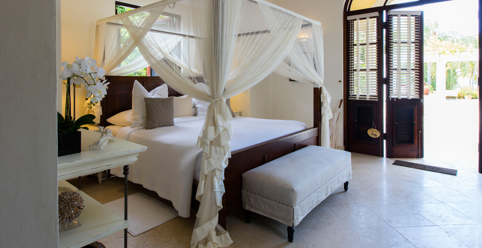 The master bedroom, located on the second floor, is beautifully decorated with bespoke furnishings and has an en suite bathroom with claw-foot soaking tub. This suite opens onto a furnished private balcony that overlooks the pool and beach. There are four additional bedrooms with king size beds and en suite bathrooms in the main house, as well as one children's bedroom with two twin beds. The bedrooms are situated within the main house and three private guest cottages.