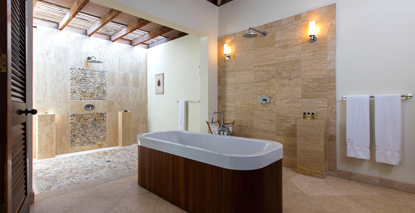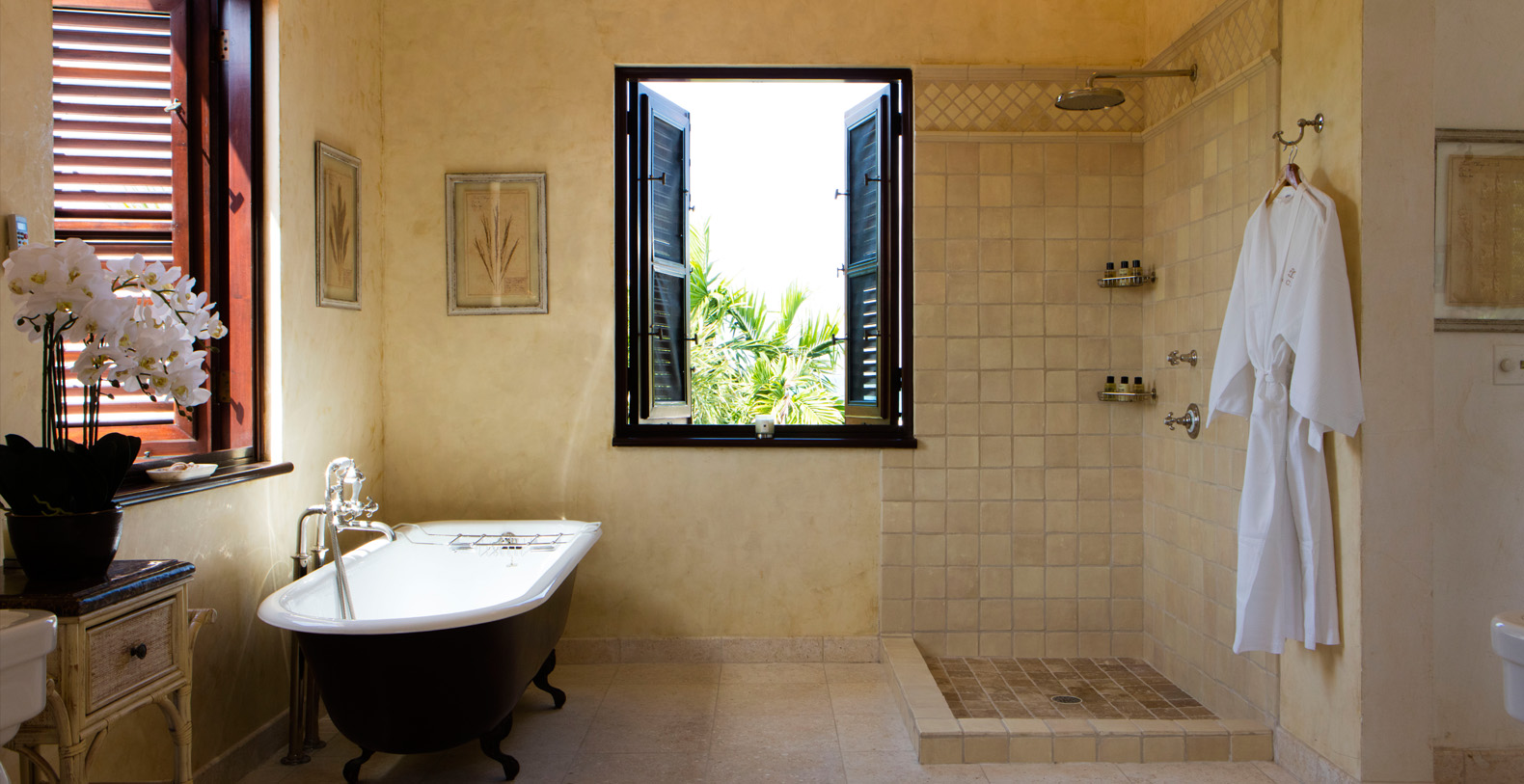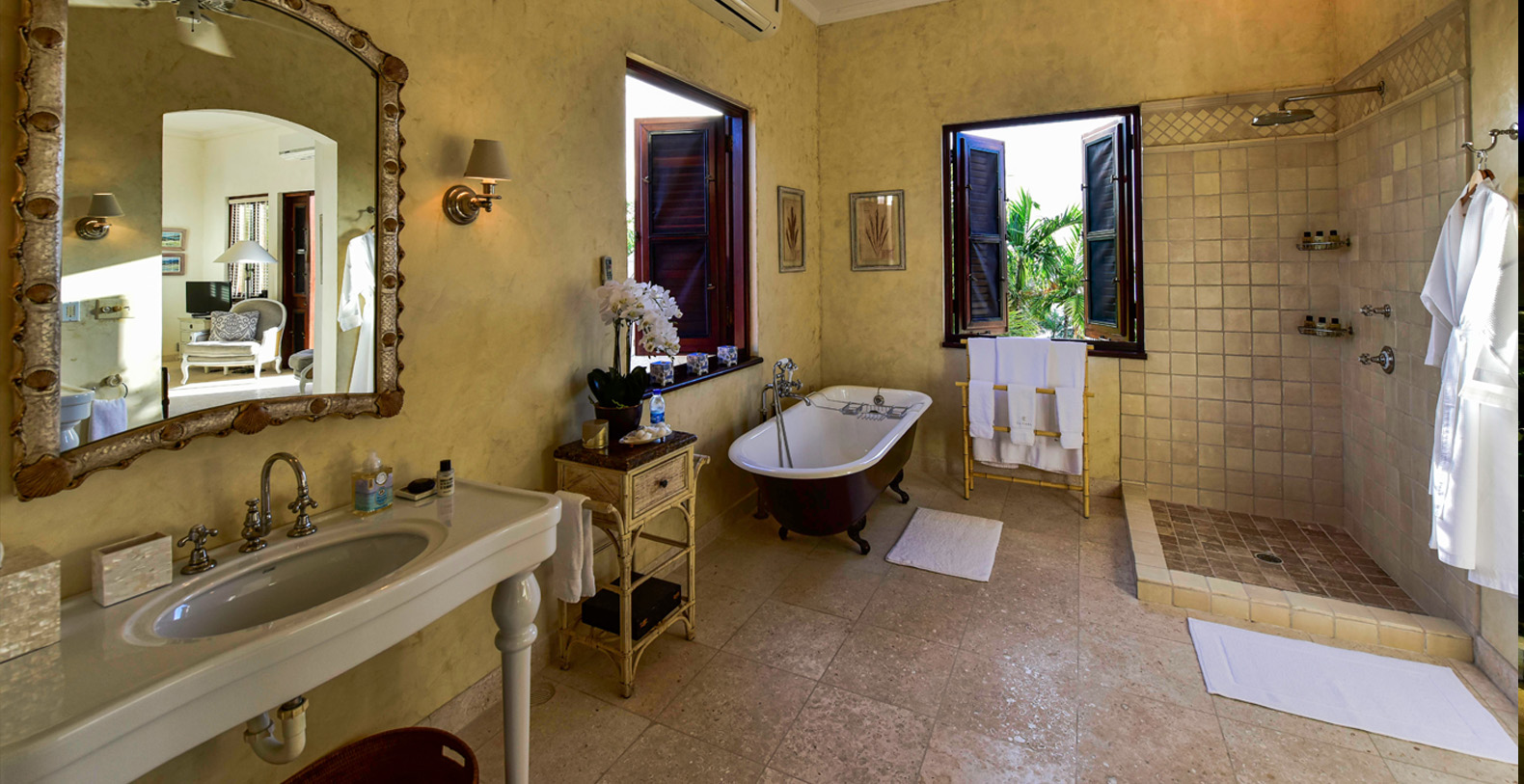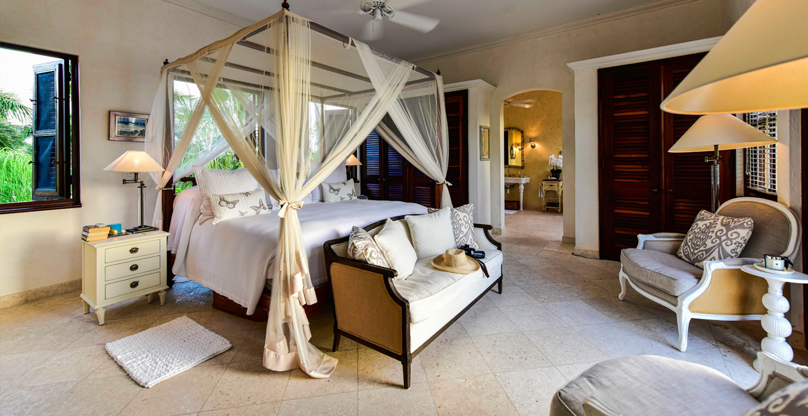 The master bedroom, located on the second floor, is beautifully decorated with bespoke furnishings and has an en suite bathroom with claw-foot soaking tub. This suite opens onto a furnished private balcony that overlooks the pool and beach. There are four additional bedrooms with king size beds and en suite bathrooms in the main house, as well as one children's bedroom with two twin beds. The bedrooms are situated within the main house and three private guest cottages.