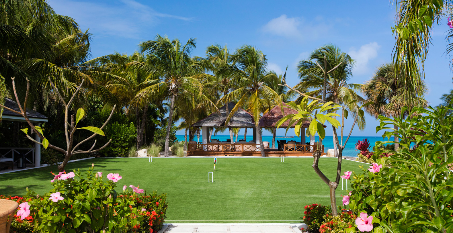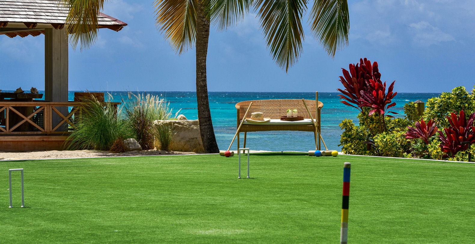 The property’s swimming pool and Jacuzzi are just steps from the beach. The spacious pool deck is furnished with chaise lounges and gorgeous flowering plants and vines that surround the pool. Swim or relax poolside under an umbrella and make use of the poolside bar. The property also boasts a private croquet lawn adjacent to the pool, and a flood-lit tennis court and gym.