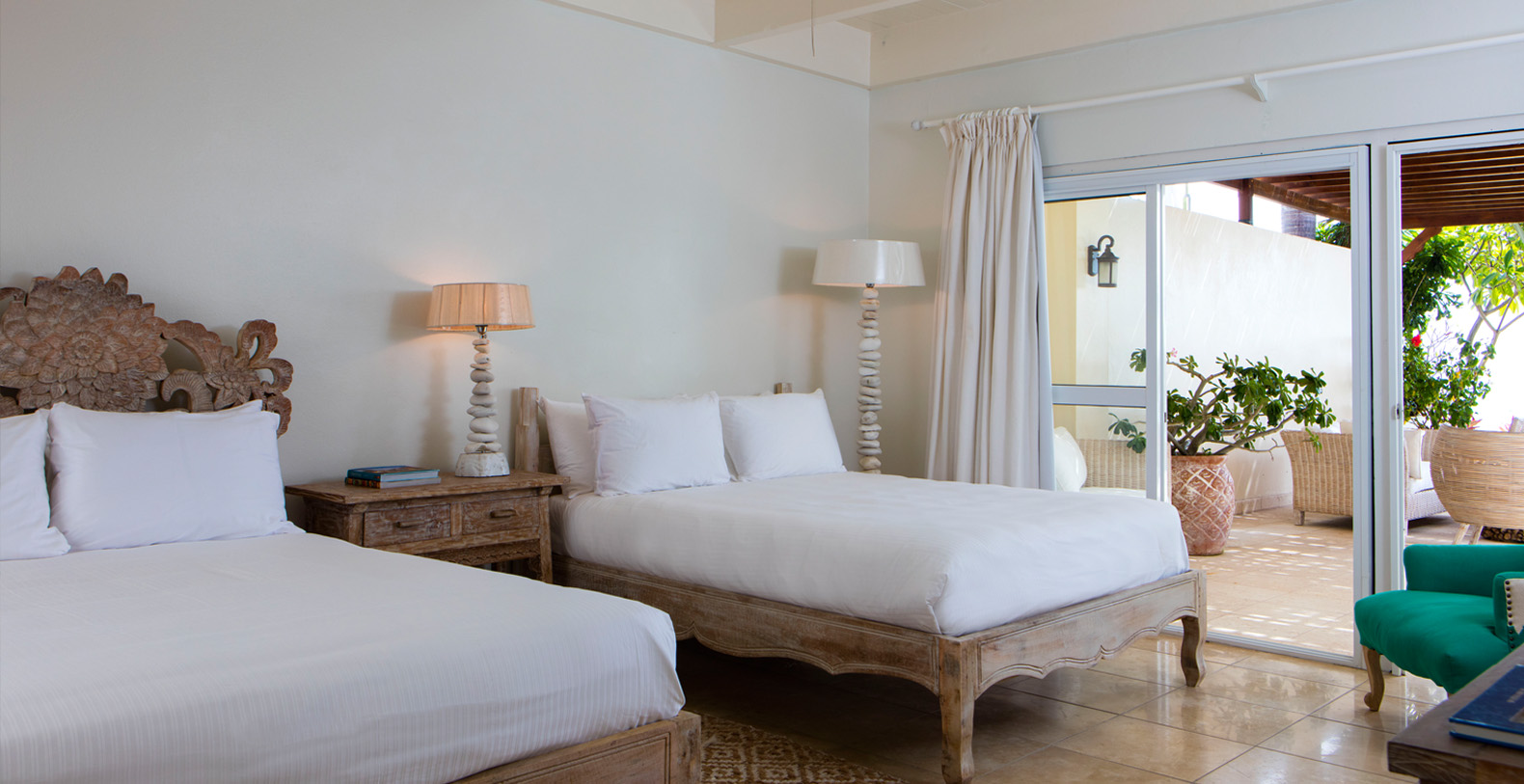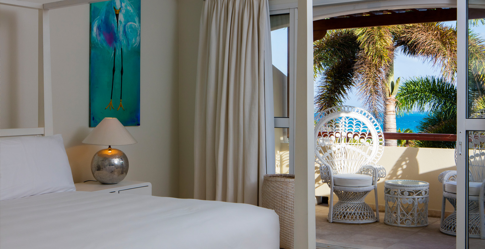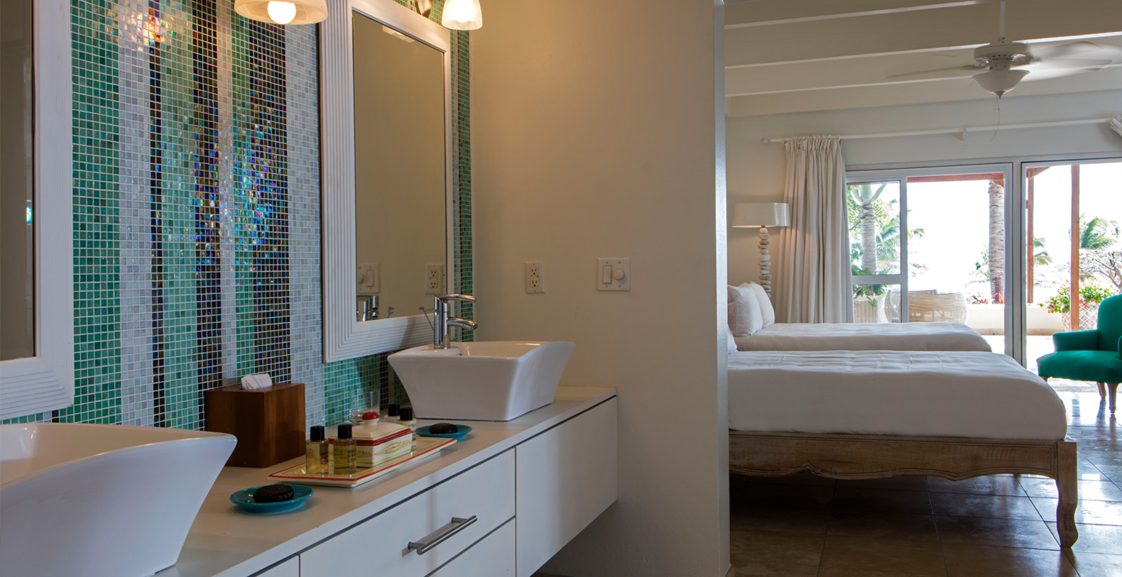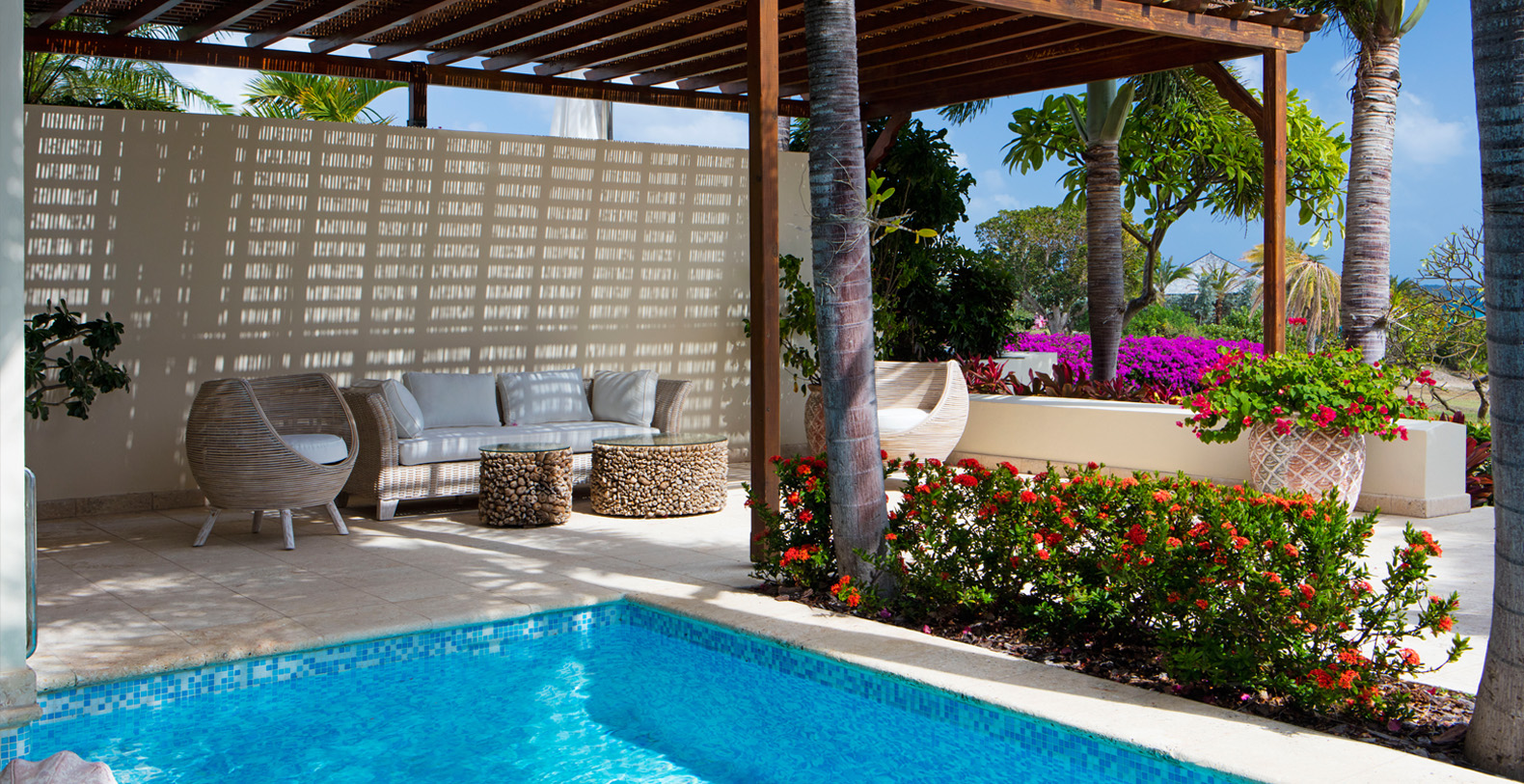 The two-bedroom private villa presents a large modern kitchen, dining area, family room with TV and spacious living area. An expansive outdoor terrace with lounge and dining areas offers views of Bird Island and several other uninhabited isles dotting the wide blue ocean. Rolling lawns flow from Poinciana’s refreshing pool area down to the sandy beach below.