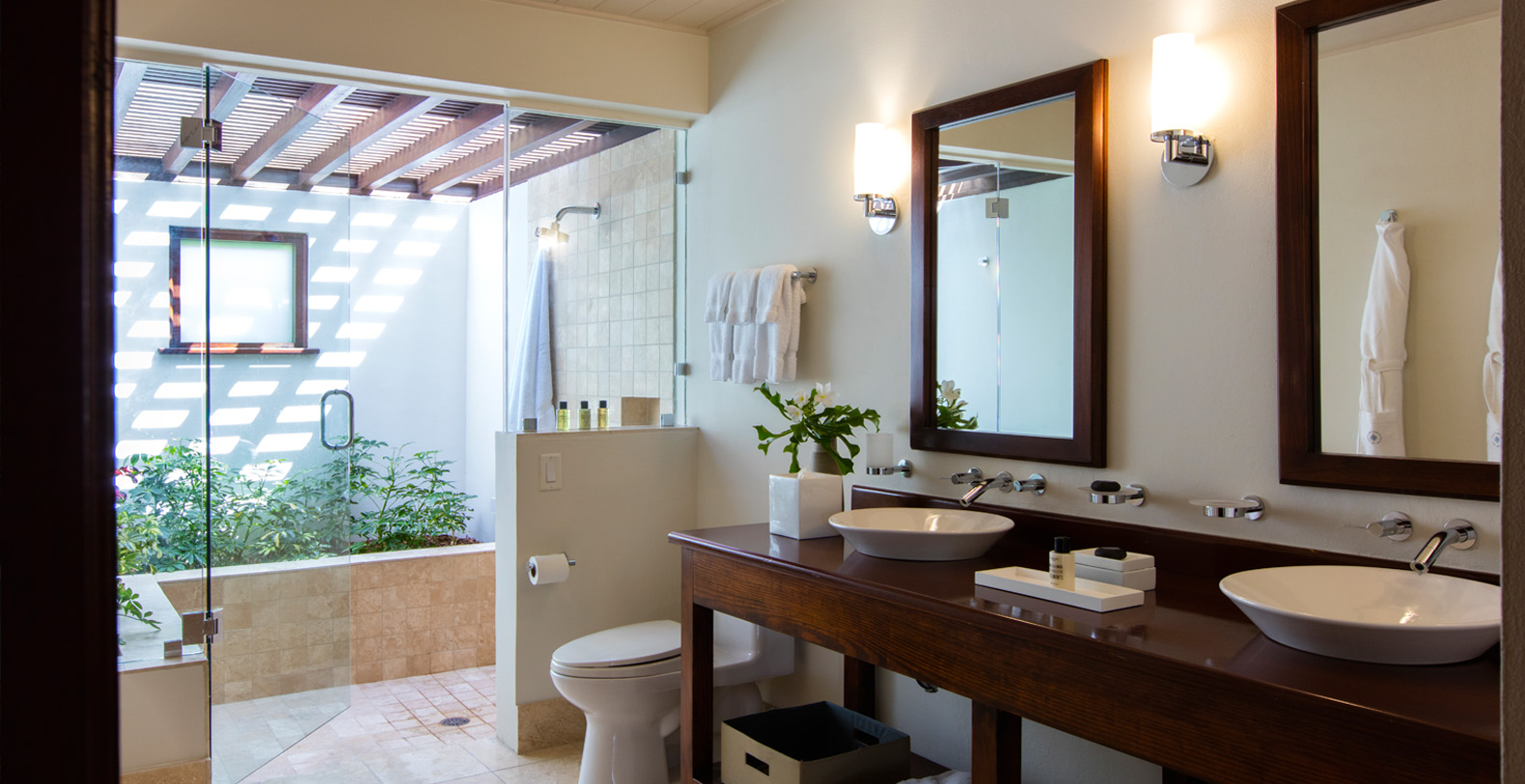 The king-bedded master suite features an inviting terrace overlooking the pool, sea and beautifully landscaped gardens with a luxurious bathroom and a refreshing outdoor shower. Located in a detached cottage, a second king-bedded master suite features a quiet terrace overlooking the gardens to the sea and a spacious bathroom with an outdoor courtyard shower. Two additional terraced cottages offer two bedrooms each, each with ensuite baths, one with a king bed and one with a set of double beds.