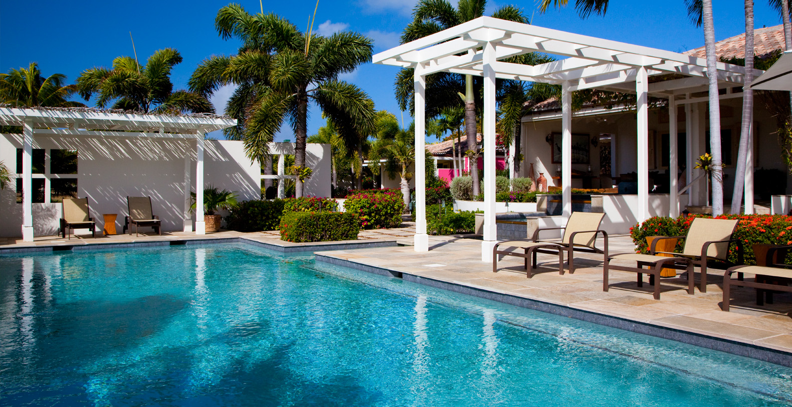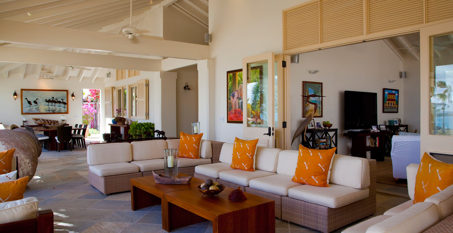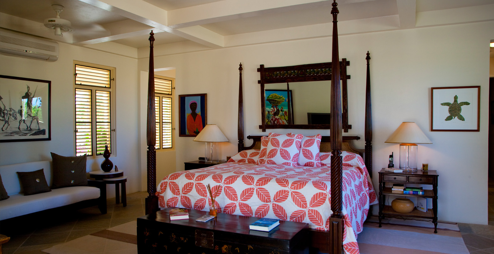 The seven-bedroom private estate exudes a welcoming residential feel. With interior spaces inspired by the spirit of travel and an unmistakably modern aesthetic, this beautiful home mixes eclectic furnishings with treasures and mementos collected from near and far. Unique local artwork and plush, vibrantly hued pillows accent the neutral shades of the home's elegantly made beds, chairs and sofas. A spacious master bedroom offers a private outer courtyard, while four of the guest rooms have balconies.