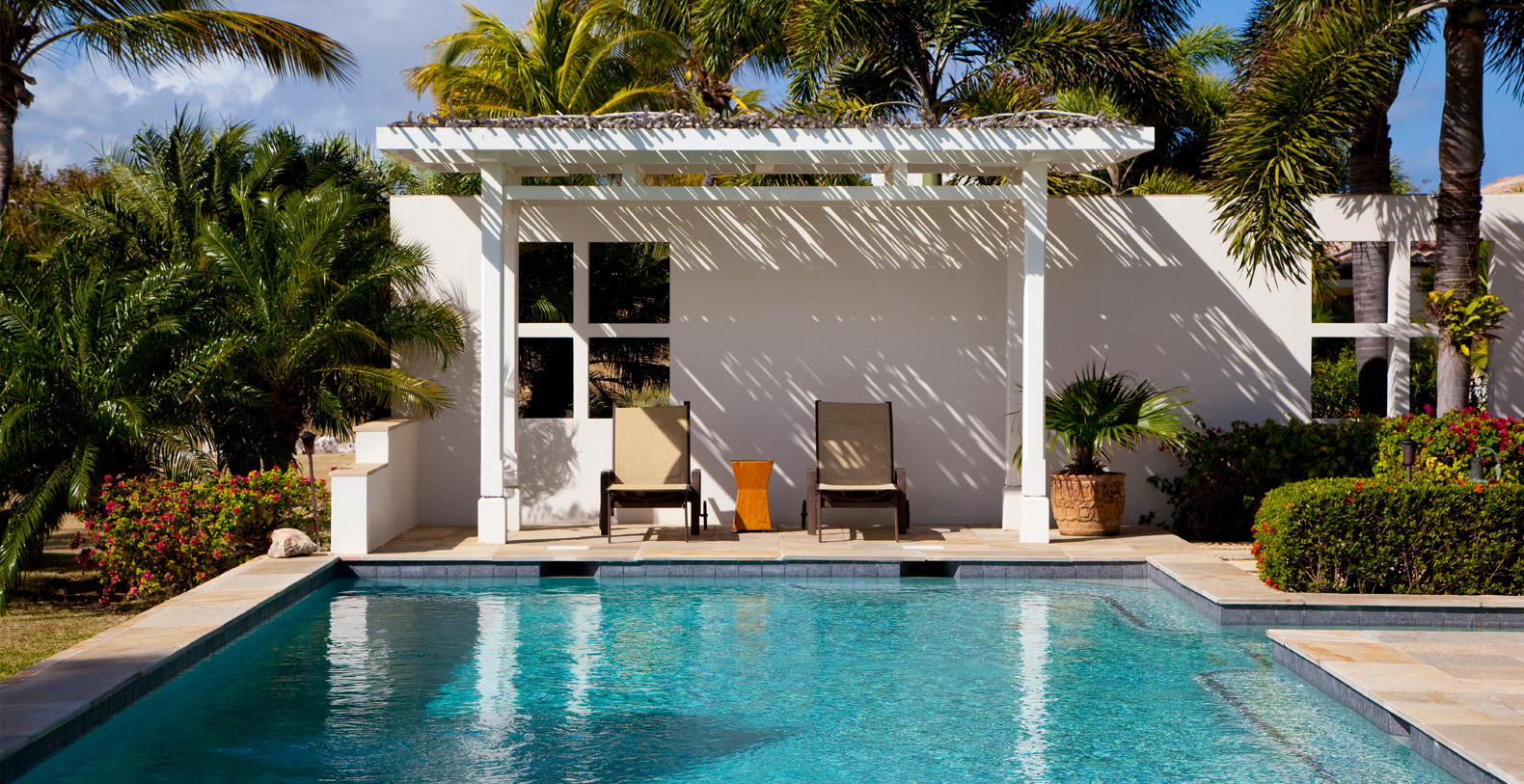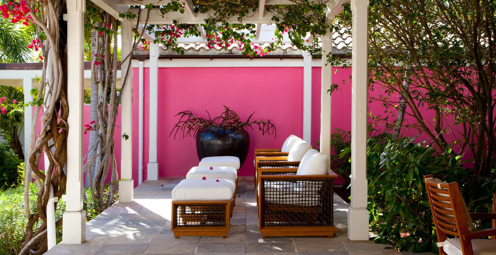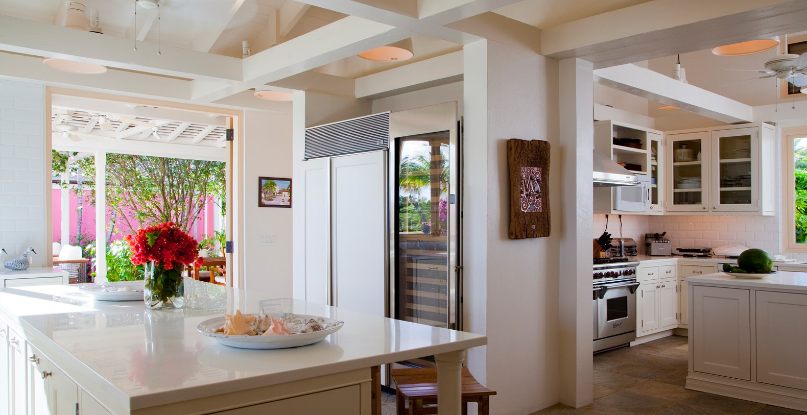 The seven-bedroom private estate exudes a welcoming residential feel. With interior spaces inspired by the spirit of travel and an unmistakably modern aesthetic, this beautiful home mixes eclectic furnishings with treasures and mementos collected from near and far. Unique local artwork and plush, vibrantly hued pillows accent the neutral shades of the home's elegantly made beds, chairs and sofas. A spacious master bedroom offers a private outer courtyard, while four of the guest rooms have balconies.