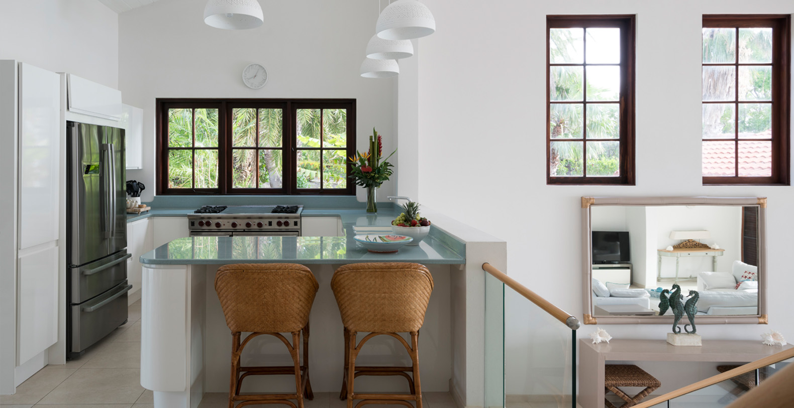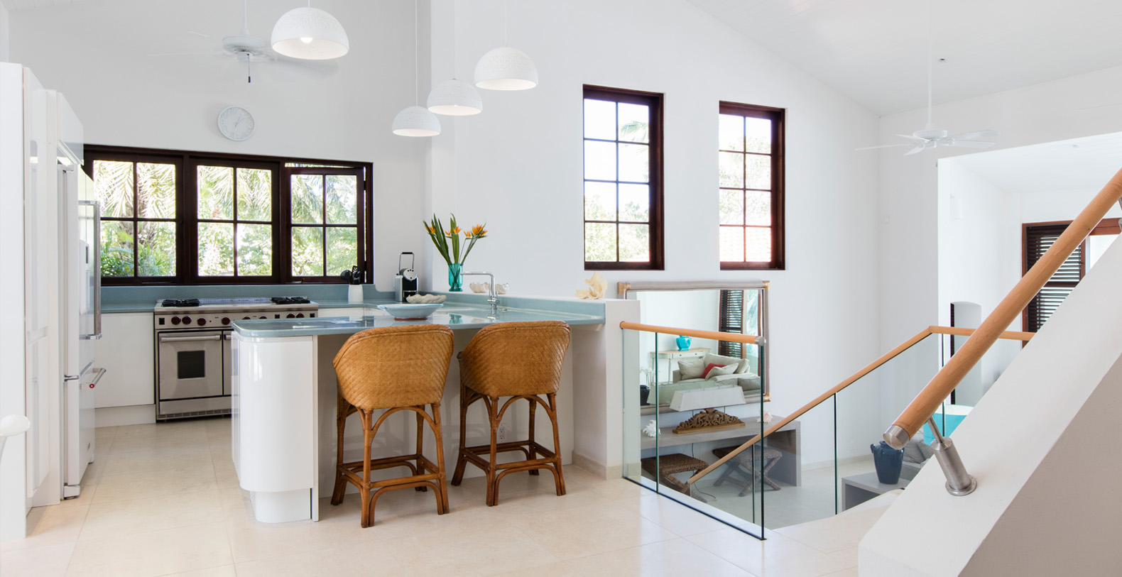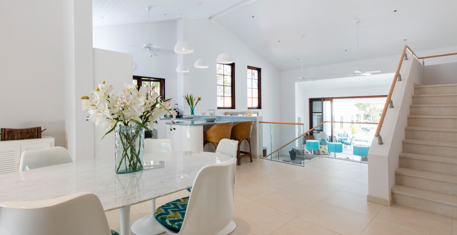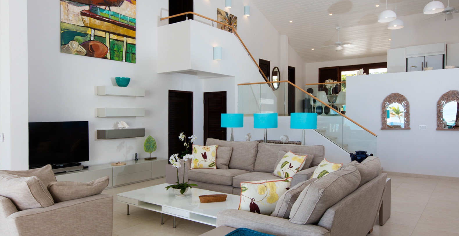 Decorated in a classic Caribbean style, Whispering Palms off-sets dark wood finishes and furnishings with a soothing neutral color palette accented with vibrant bursts of color. Offering cathedral ceilings and terracotta tiles throughout, the villa comprises four bedrooms, a modern state-of-the-art kitchen, a dining area with seating for eight, a family room with TV and a tiered living area with windows that capture the bright sunshine and open the home to a fantastic panorama dotted by Bird Island and several other uninhabited islets.