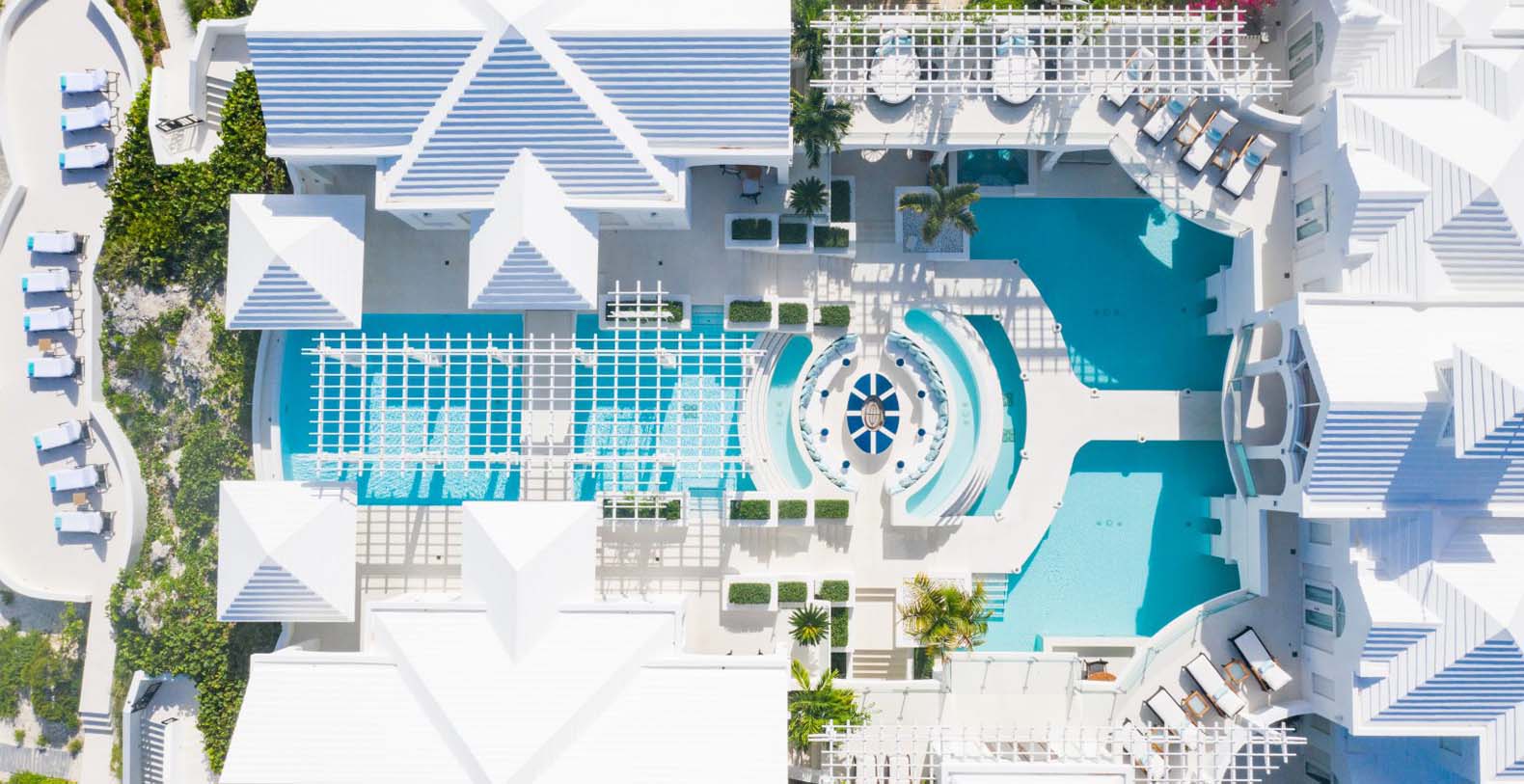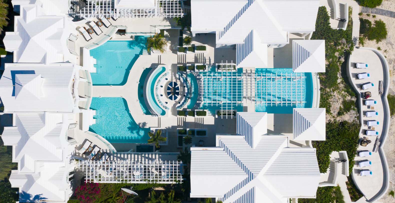 Mixing fire and water, at the center of this aquatic kingdom, an extravagant pool lounge is equipped with an ambient blue recycled-glass fire pit around which guests may enjoy an evening under celestial skies, mirrored down below by a dazzling light display from LED lights inconspicuously strewn throughout the pool.