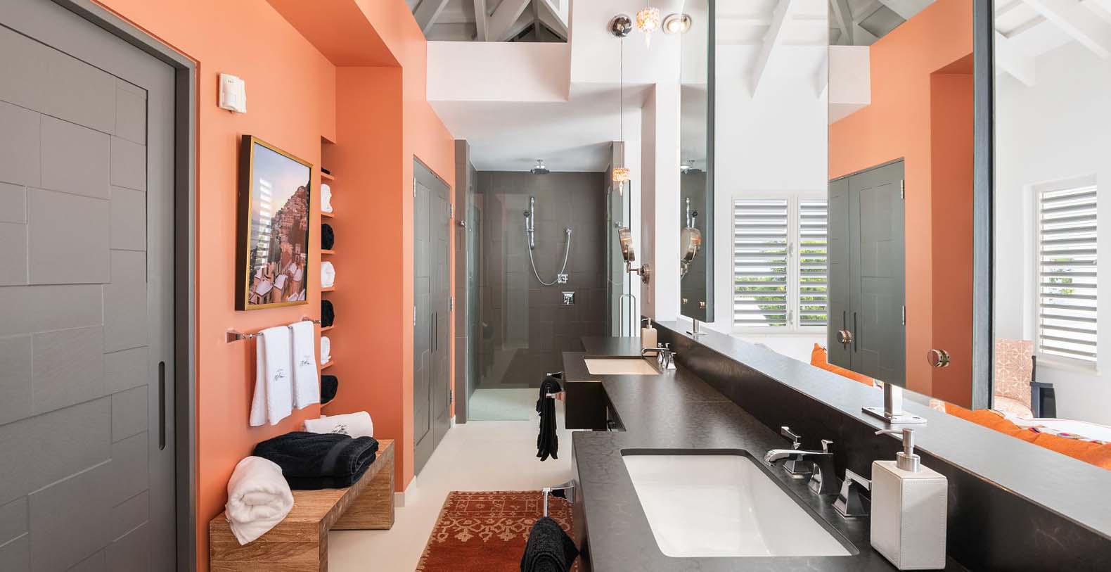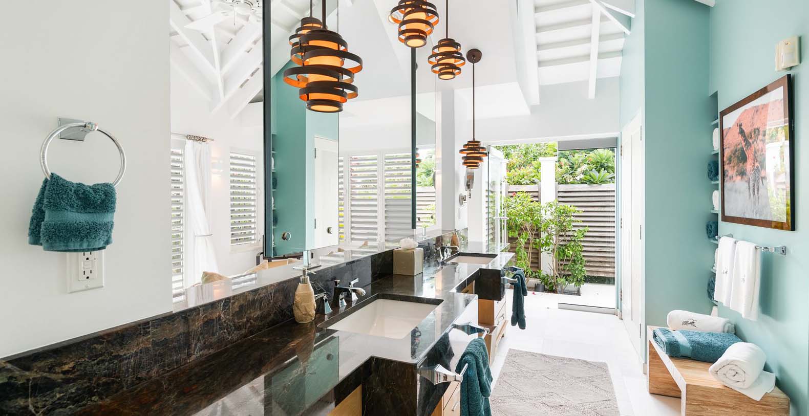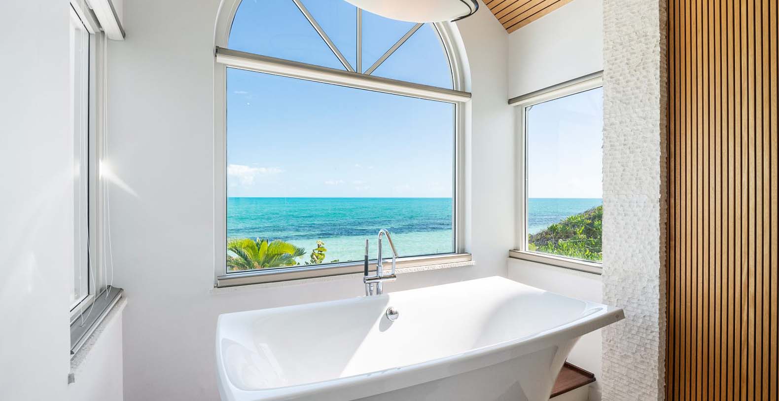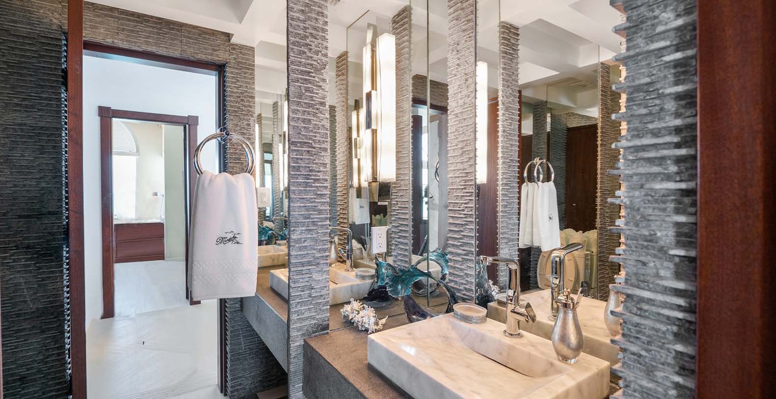 Every bedroom has an ensuite bathroom and is equipped with air conditioning, ceiling fan, flat screen TV, telephone and iPod dock. The master bathroom presents a double vanity, monogrammed bathroom accessories, free-standing bathtub overlooking the ocean and outdoor shower. There are four full ensuite bathrooms with double vanities; two of them with indoor showers and two with outdoor showers. In addition, there are two powder rooms.