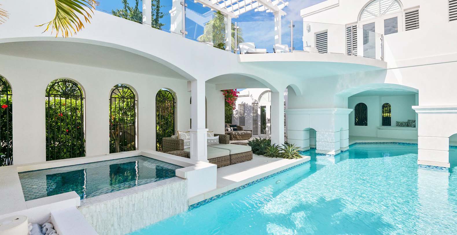 Just 40 feet from the ocean, a double staircase frames the furthest reaches of the pool winding up from the powder soft sands of the beach to the kitchen, formal living spaces and master bedroom.