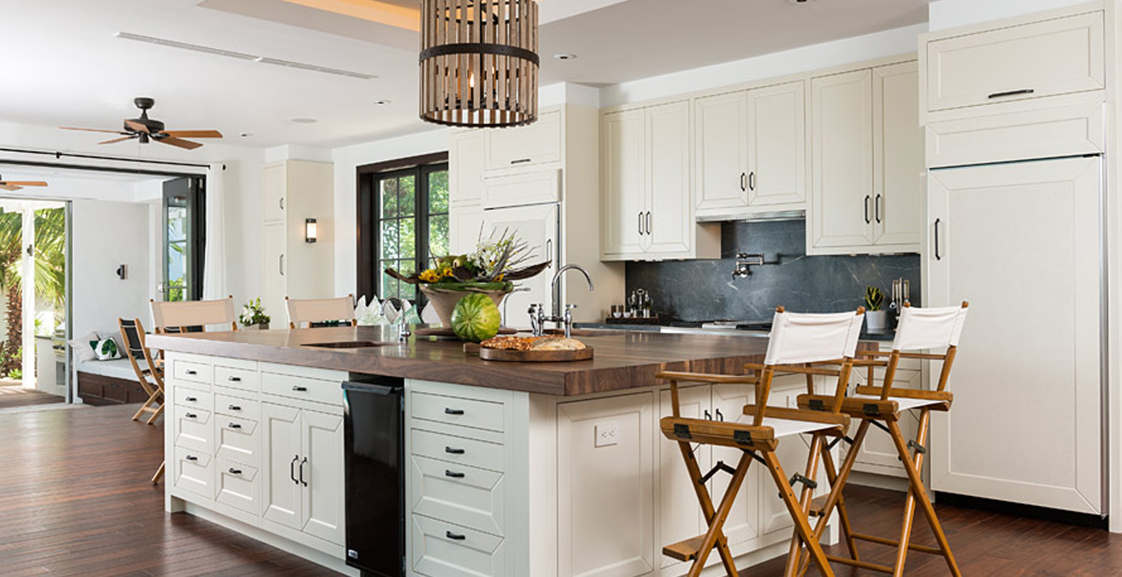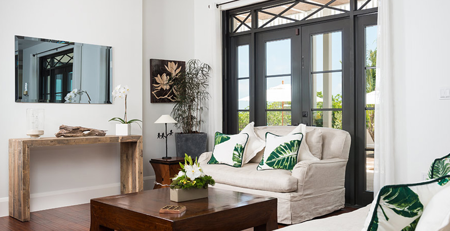 The furnishings are simple but spectacular. A stunning full-service cook’s kitchen is at its heart, where everyone comes together. The 16’ island features two sinks, trash compactor, ice machine, and enough space for large-scale or intimate entertaining. The kitchen and dining table overlook the pool and Grace Bay in its entire splendor, leading to the fully screened-in playroom with moveable tables for games and an oversized daybed.