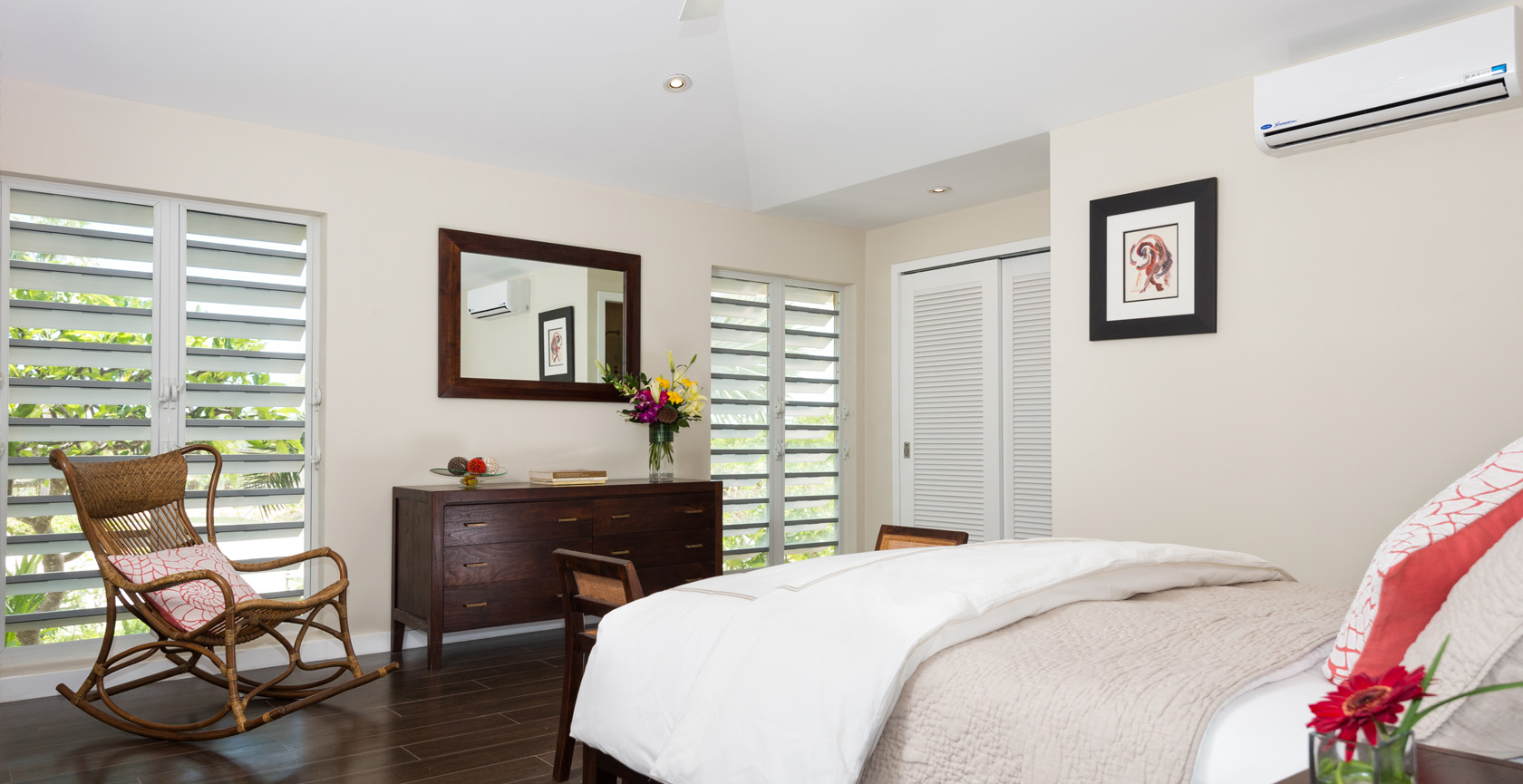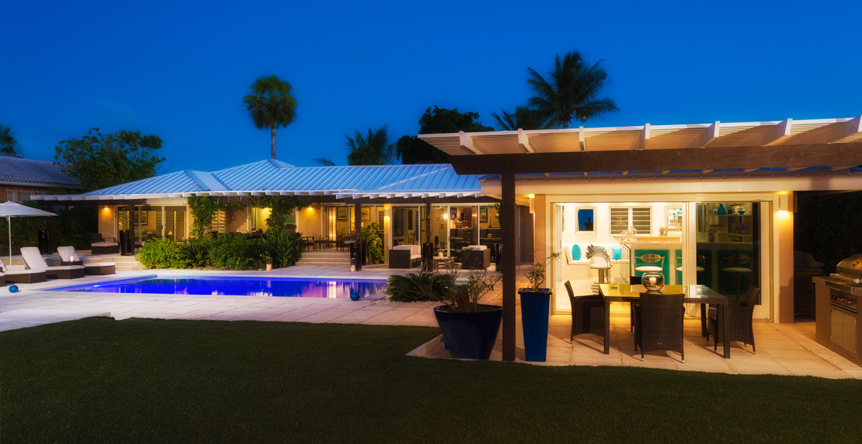 Sunsara opens to a terrace with sitting and dining areas and a large freshwater pool surrounded by chaise longues and a hammock. A stroll across the lush lawn brings you to a waterfront deck and a 100-foot stretch of beach. Stay safe in the water with the provided flotation devices, rinse off after a swim in the outdoor shower, have a game on the lawn with the croquet set, prep local seafood on the barbecue and enjoy cocktails in the air-conditioned bar area with iPod sync. For the evenings, the villa has indoor and outdoor TVs, a sound system, board games, Wi-Fi access and air conditioning.