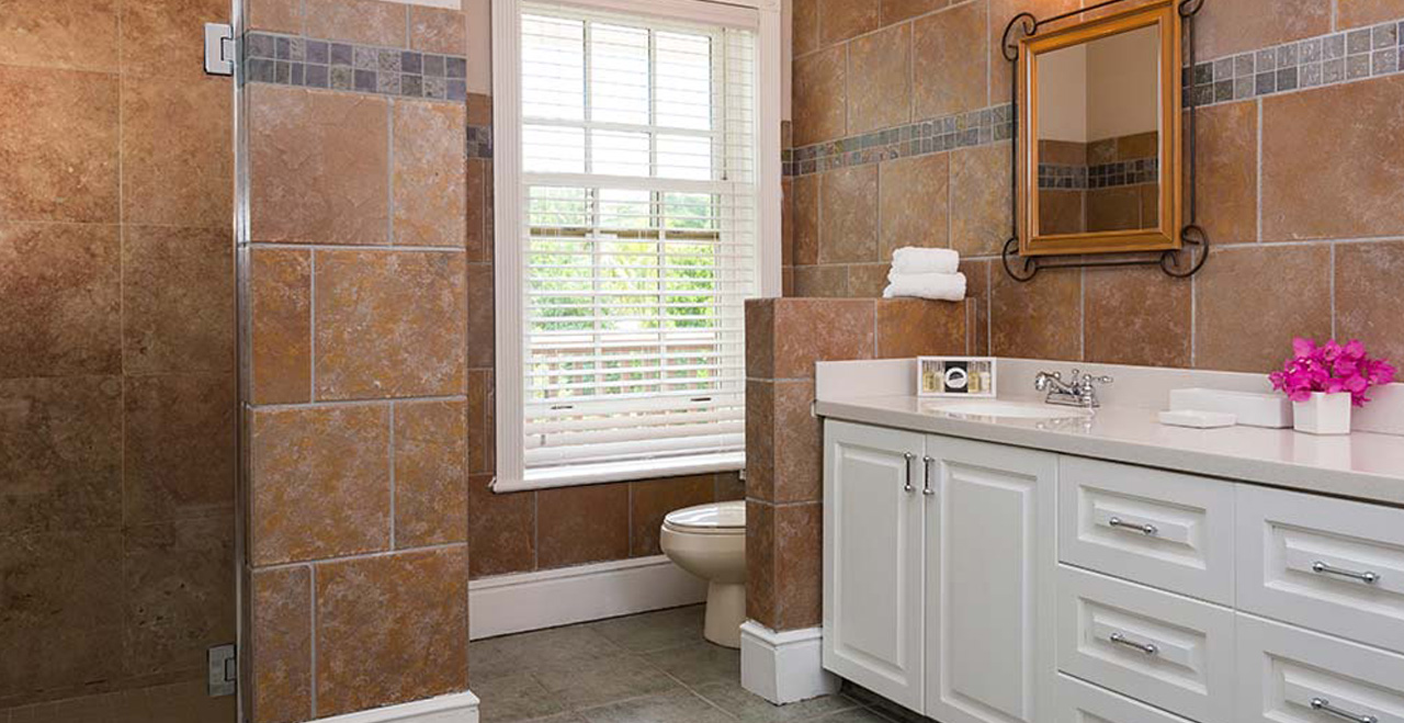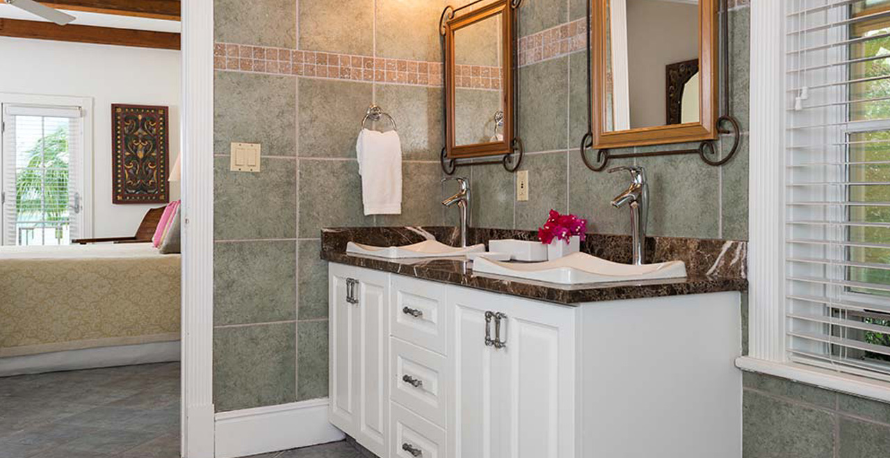 Two luxurious guest suites are available in addition to the main house to accommodate parties of up to 14 adults. Positioned on a lower level, approached by a private entrance with a gentle ramp access and opening onto the waterside, these beautiful suites are ideal for a little privacy. One suite benefits from discrete enhancements for guests who are less able bodied. The large walk in shower would be accessible to a wheelchair user. A small sitting area with a mini kitchen equipped with a microwave, refrigerator, kettle, toaster and coffee maker separates the two suites. A large deck area opens out from the suites affording ocean views. Please note that there are 2 steps into and out of the main villa and shallow steps into the pool.