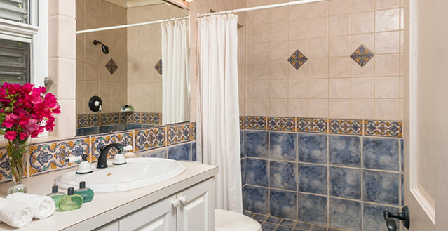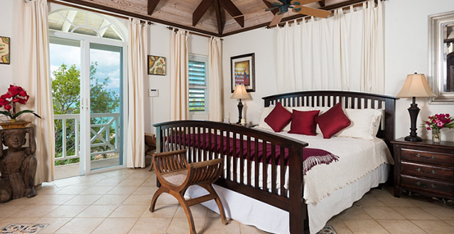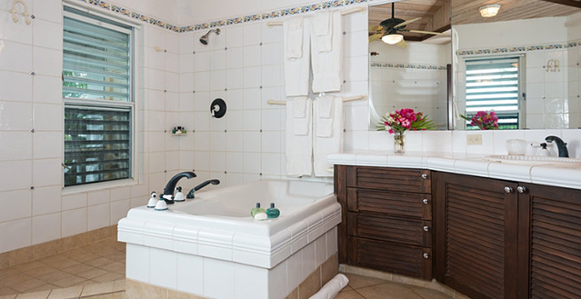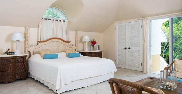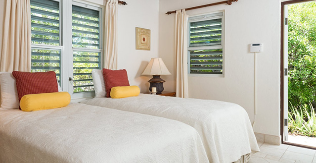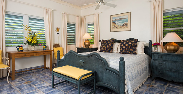 South Seas Villa features a master king bedroom suite and second king bedroom, both with attached bathrooms. The master bedroom houses a luxurious king-size bed and rich fabrics. The second bedroom also has a king bed and is decorated with cheerful country blues and yellows.