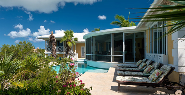 The private swimming pool is a sculptured work of art, winding around the curved exterior of the large Villa Sun Room. Enjoy a relaxing dip after a day of Turks and Caicos shopping, fishing, and beaches. Enjoy cocktails on the terrace, the very private Gazebo, or the screened in Sunroom with its amazing views of Caribbean sunsets and turquoise seas. Tennis privileges are included and are nearby.