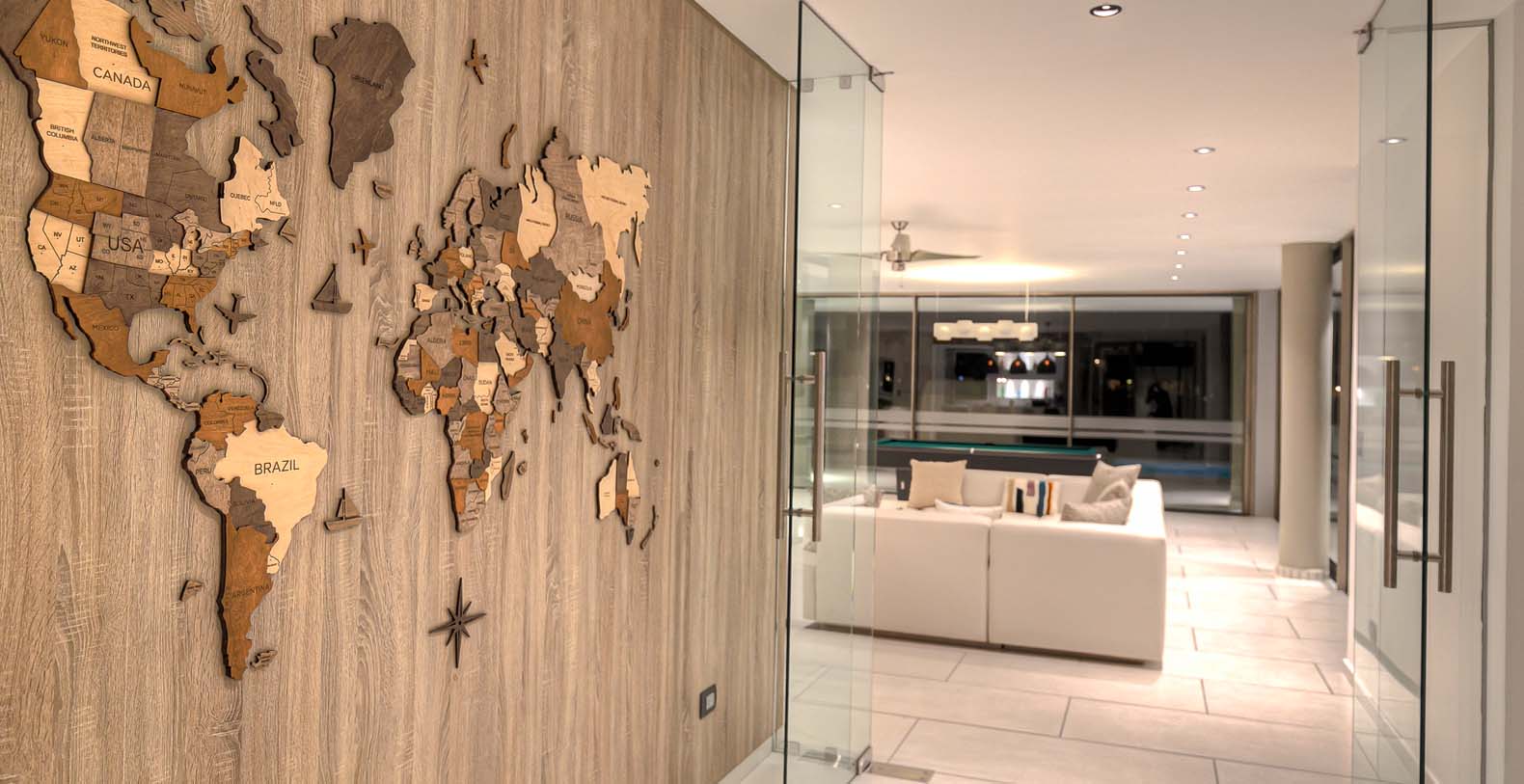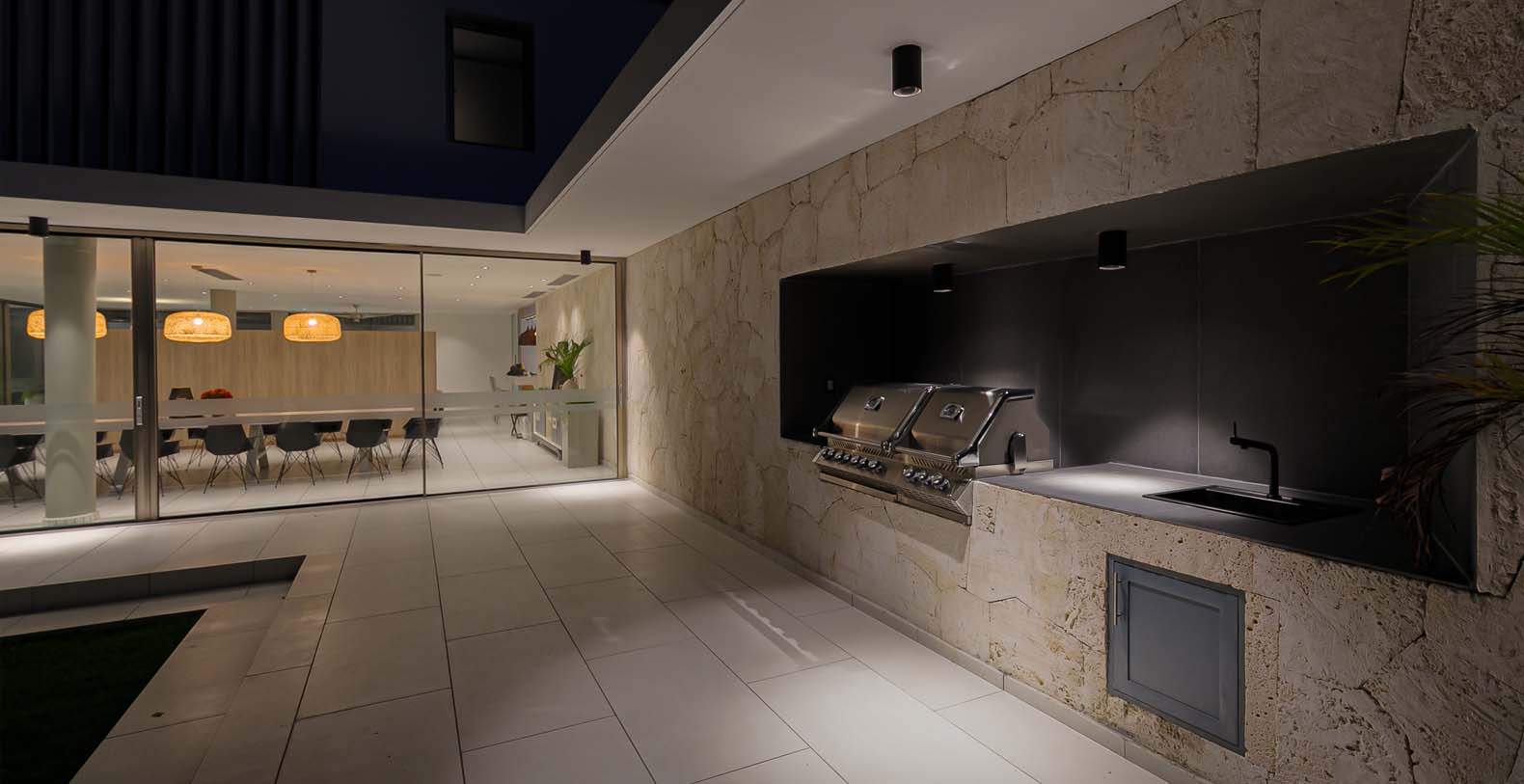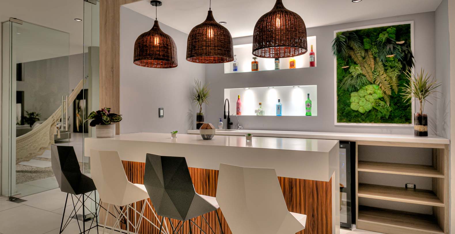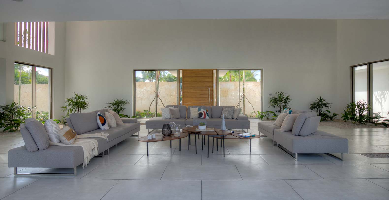 As you enter through the main entrance, a highed-ceiling with a gentle wind coming from the garden welcomes you to a large and sober foyer with modern touches and governed by a minimalistic outlook. The wooden panels on the main window sprinkle a fresh and natural touch to the villa.