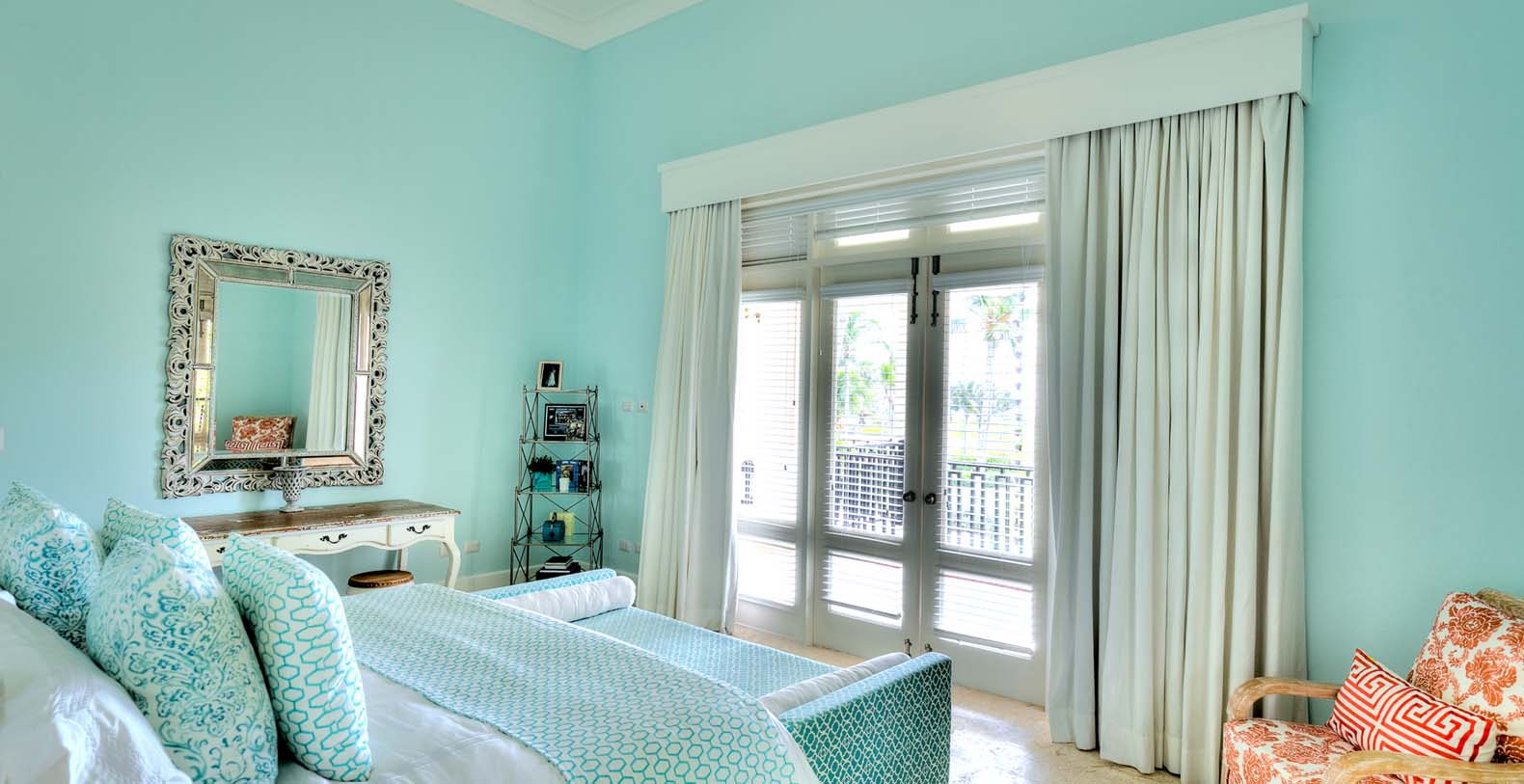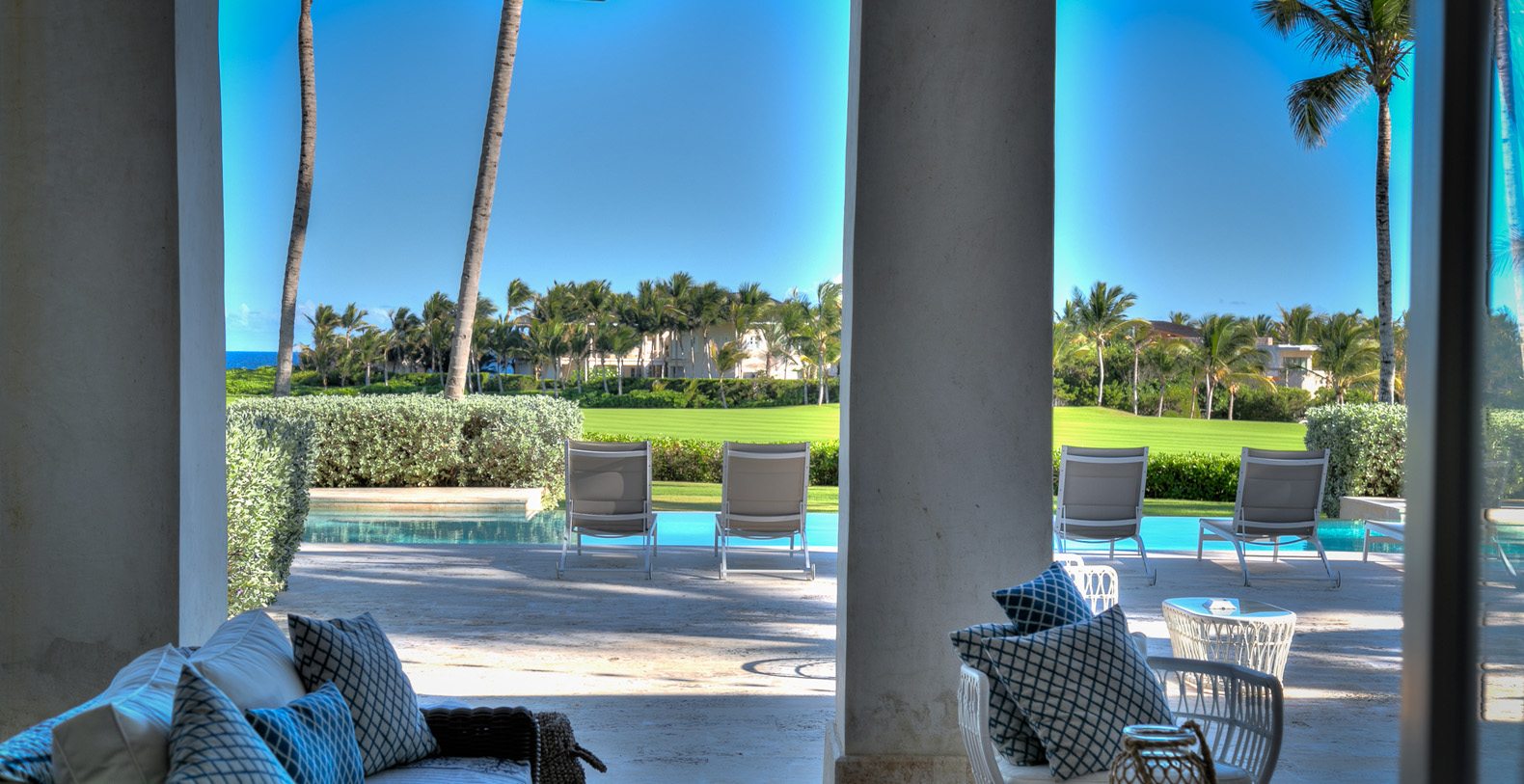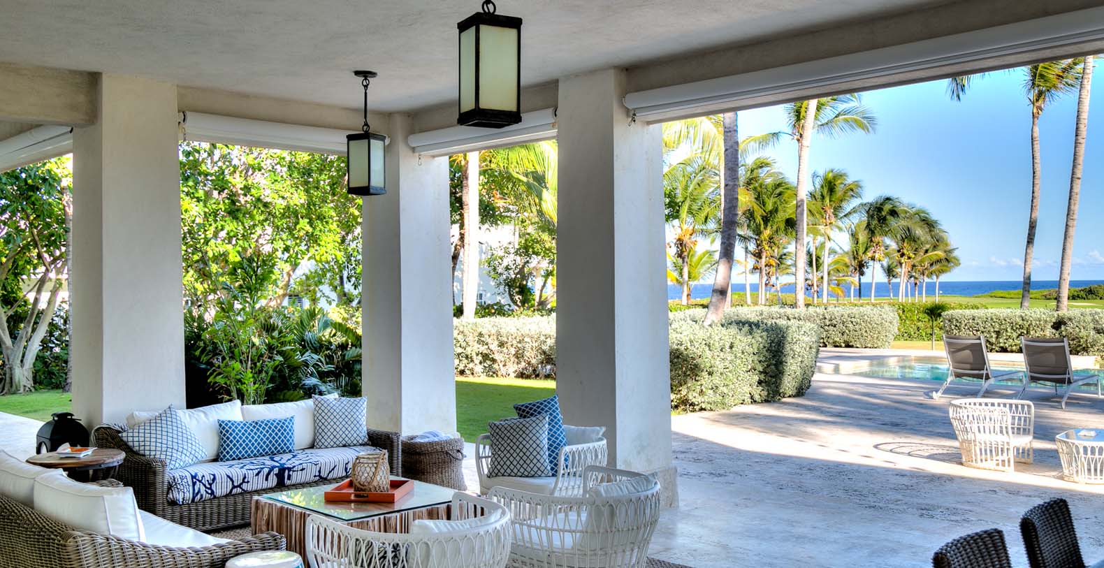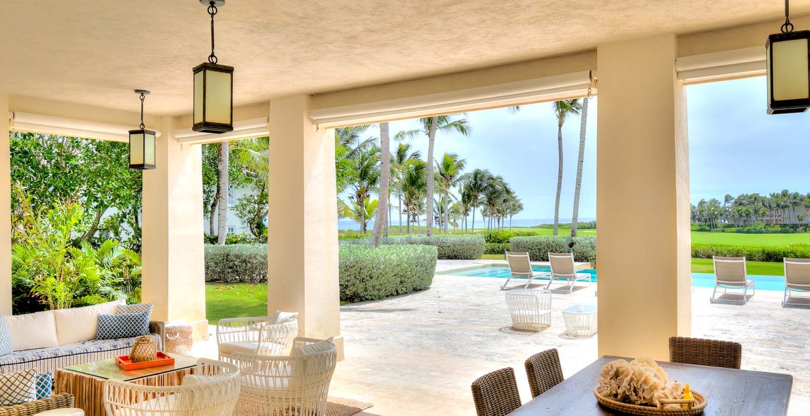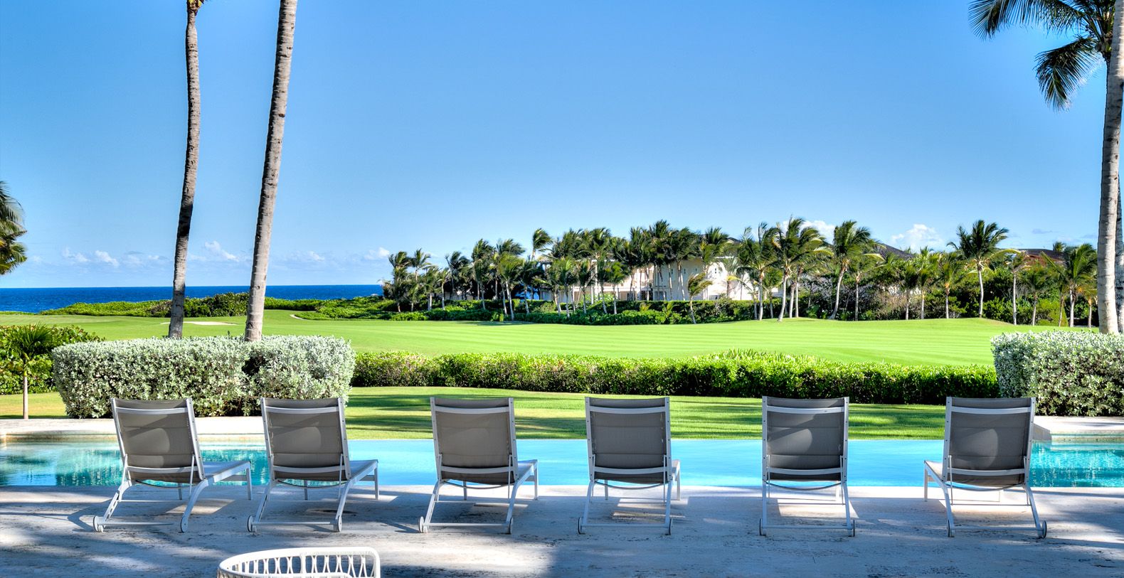 Amid mesmerizing ocean views, golf driveways and evergreen lawns and softly wobbling palm trees, stands Corales 50 with a cobbled entrance and a fountain showing guests the path the main house and the guesthouse. With an imponent facade, the main house beams a broad and open concept, held by two tall coralina columns. Two staircases on each side of the entrance guide to the second floor. On the main floor, with a flawless governant white and pastel blue, the living room invites to lay back in any of its cushy sofas and sophisticated rattan chairs while enjoying the golf and ocean views. The dining room also invokes again a reigning pastel blue, with a large hardwood table with seats for 12 guests and enlighted by a modern and minimalistic chandelier. The fully equipped kitchens with marble countertops, double-door fridge and island/breakfast bar has all appliances and cookware needed to prepare whatever the guest wants.