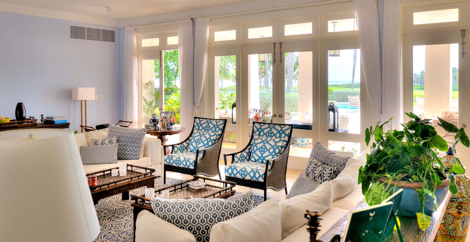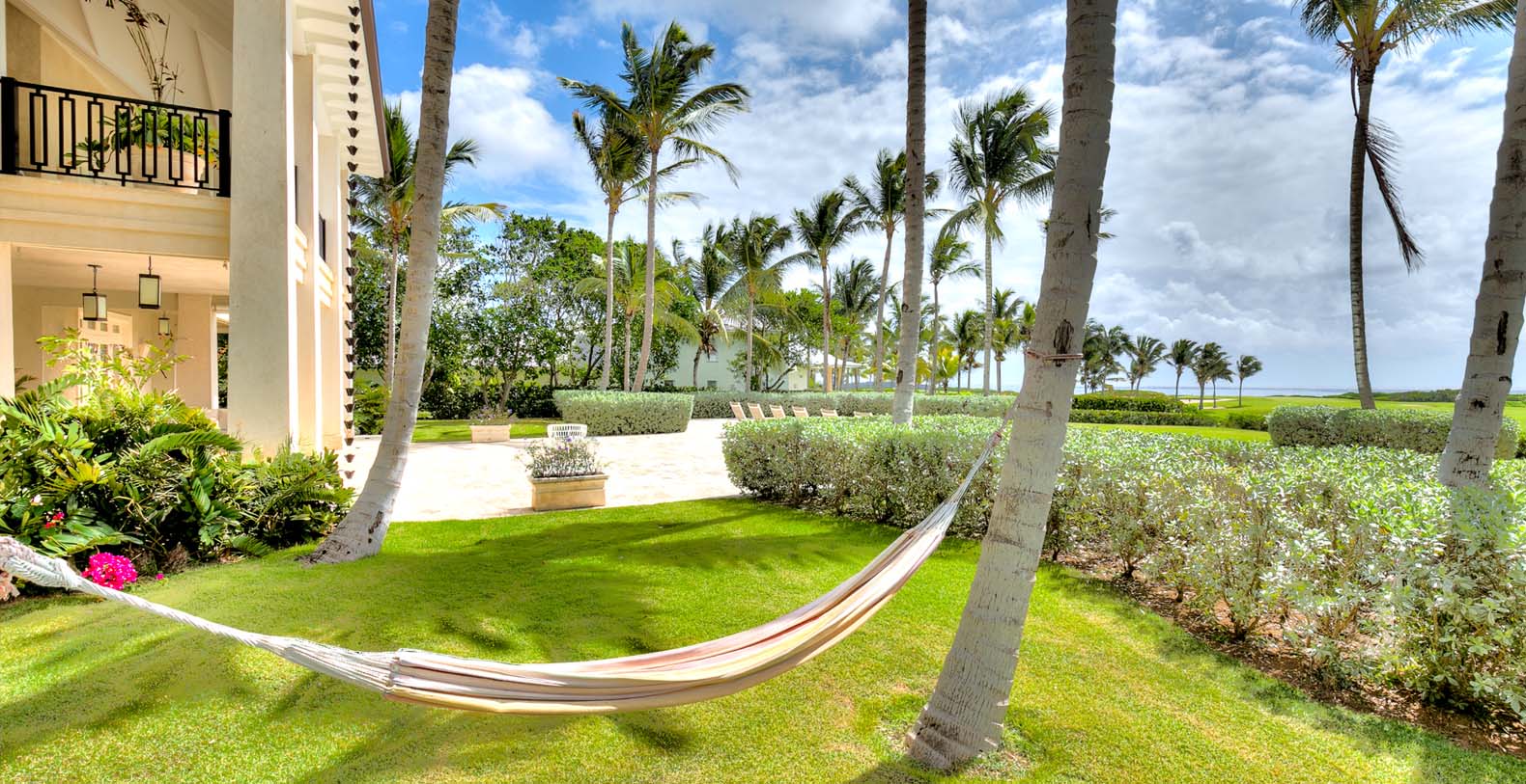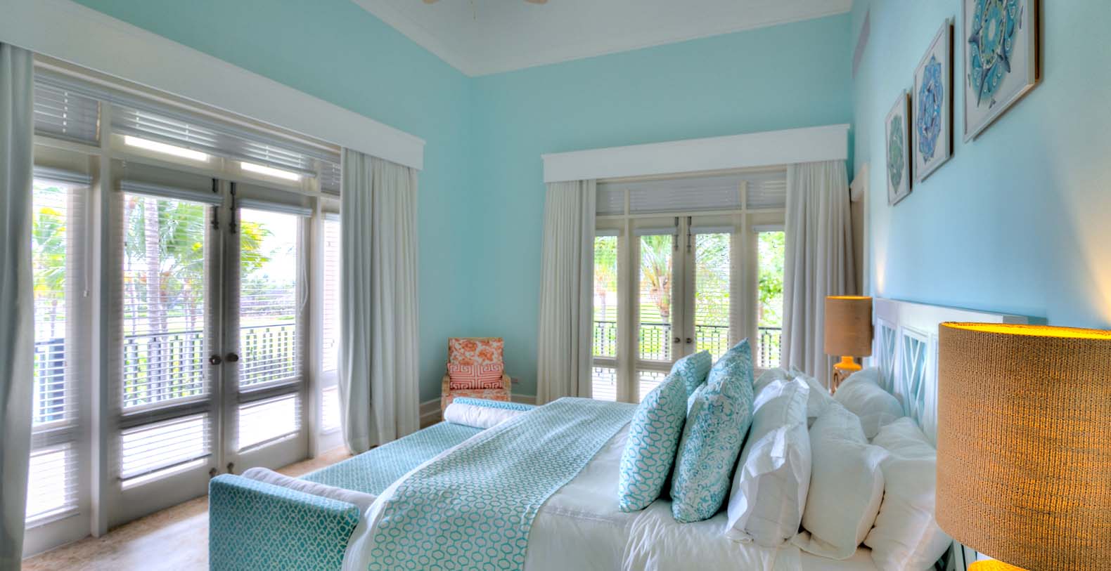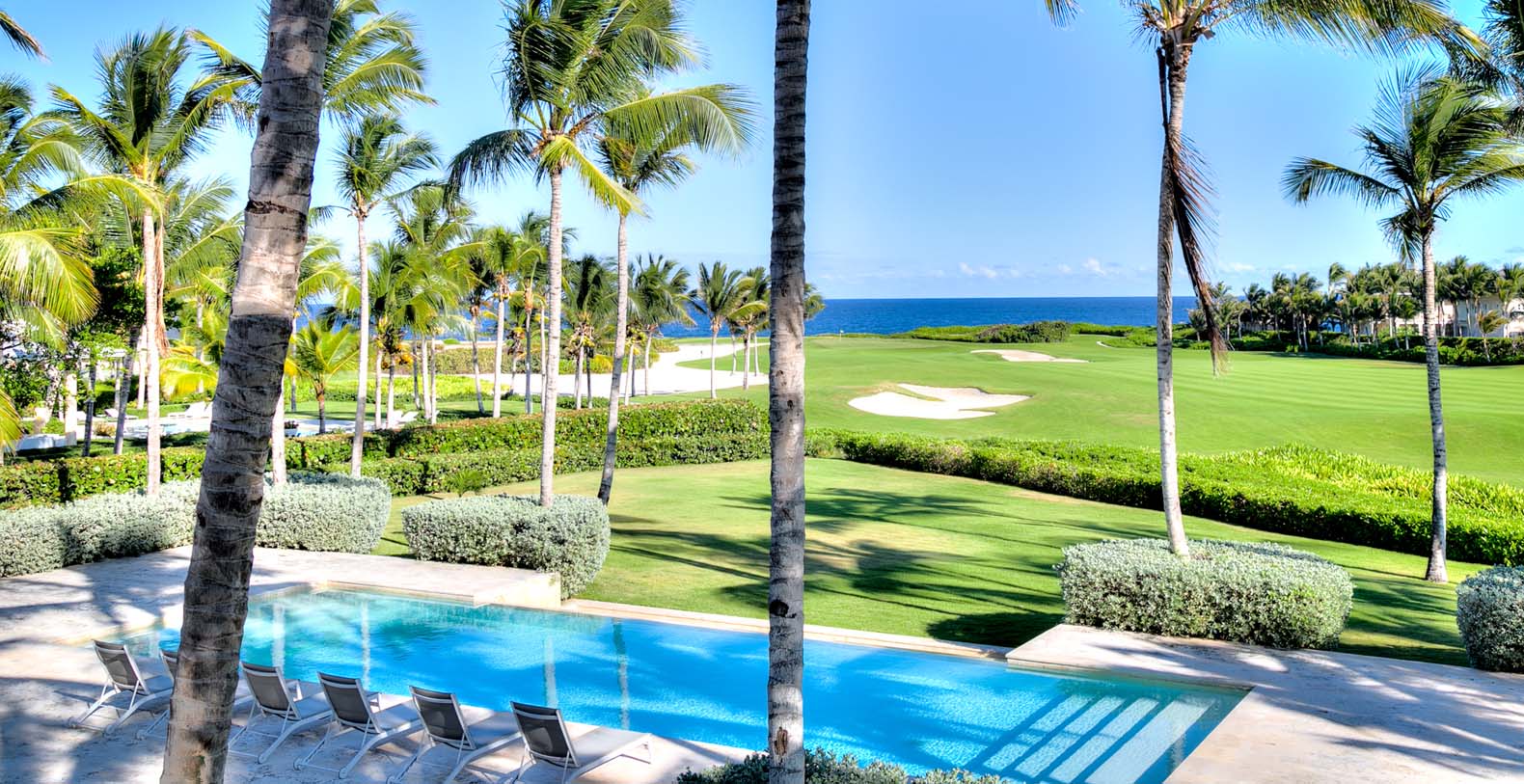 Amid mesmerizing ocean views, golf driveways and evergreen lawns and softly wobbling palm trees, stands Corales 50 with a cobbled entrance and a fountain showing guests the path the main house and the guesthouse. With an imponent facade, the main house beams a broad and open concept, held by two tall coralina columns. Two staircases on each side of the entrance guide to the second floor. On the main floor, with a flawless governant white and pastel blue, the living room invites to lay back in any of its cushy sofas and sophisticated rattan chairs while enjoying the golf and ocean views. The dining room also invokes again a reigning pastel blue, with a large hardwood table with seats for 12 guests and enlighted by a modern and minimalistic chandelier. The fully equipped kitchens with marble countertops, double-door fridge and island/breakfast bar has all appliances and cookware needed to prepare whatever the guest wants.