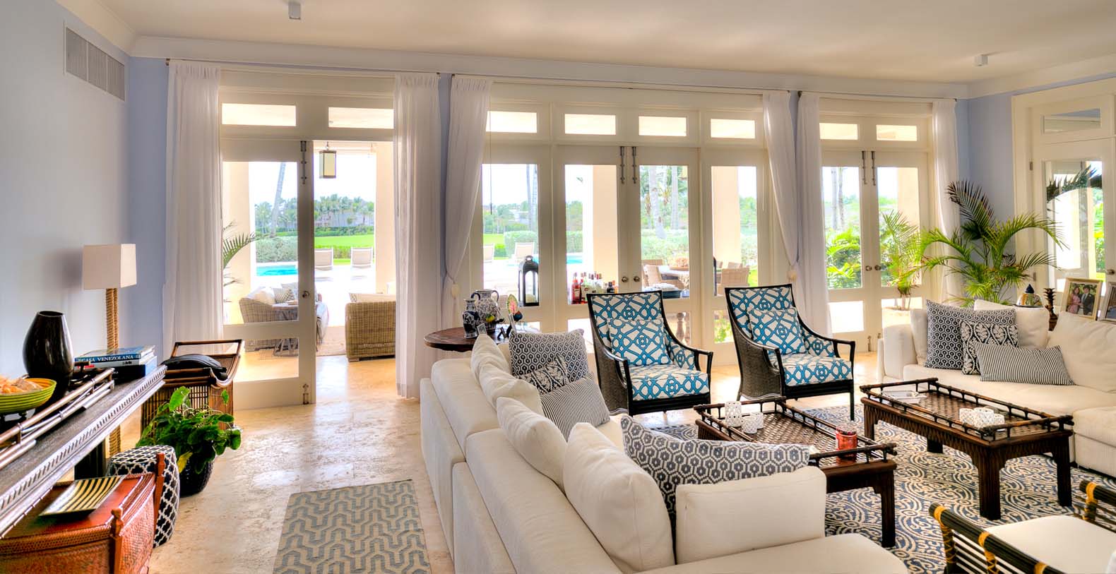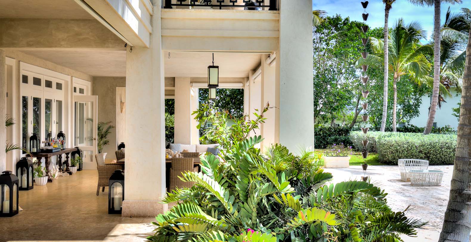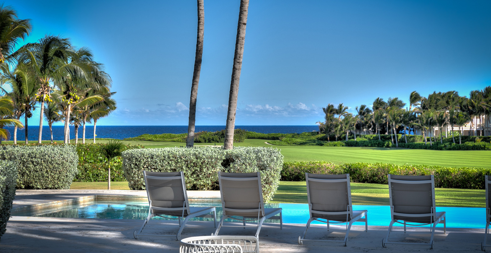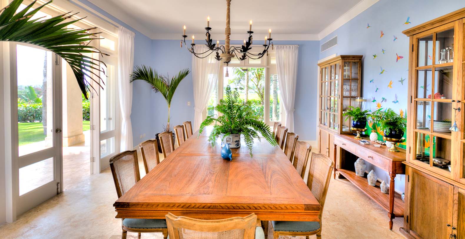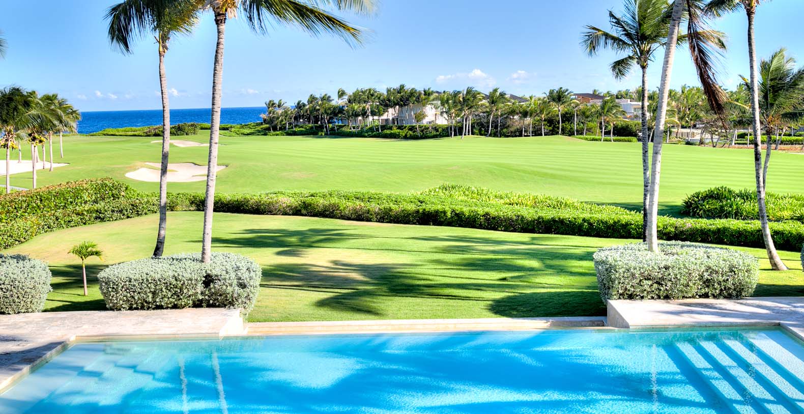 Amid mesmerizing ocean views, golf driveways and evergreen lawns and softly wobbling palm trees, stands Corales 50 with a cobbled entrance and a fountain showing guests the path the main house and the guesthouse. With an imponent facade, the main house beams a broad and open concept, held by two tall coralina columns. Two staircases on each side of the entrance guide to the second floor. On the main floor, with a flawless governant white and pastel blue, the living room invites to lay back in any of its cushy sofas and sophisticated rattan chairs while enjoying the golf and ocean views. The dining room also invokes again a reigning pastel blue, with a large hardwood table with seats for 12 guests and enlighted by a modern and minimalistic chandelier. The fully equipped kitchens with marble countertops, double-door fridge and island/breakfast bar has all appliances and cookware needed to prepare whatever the guest wants.