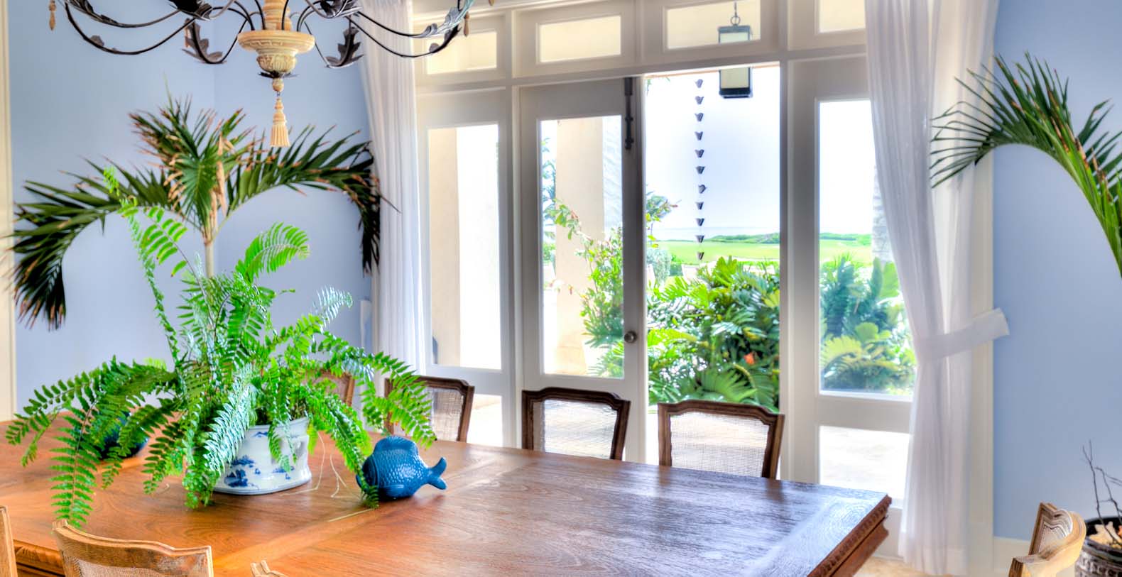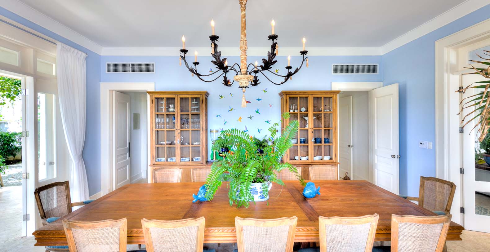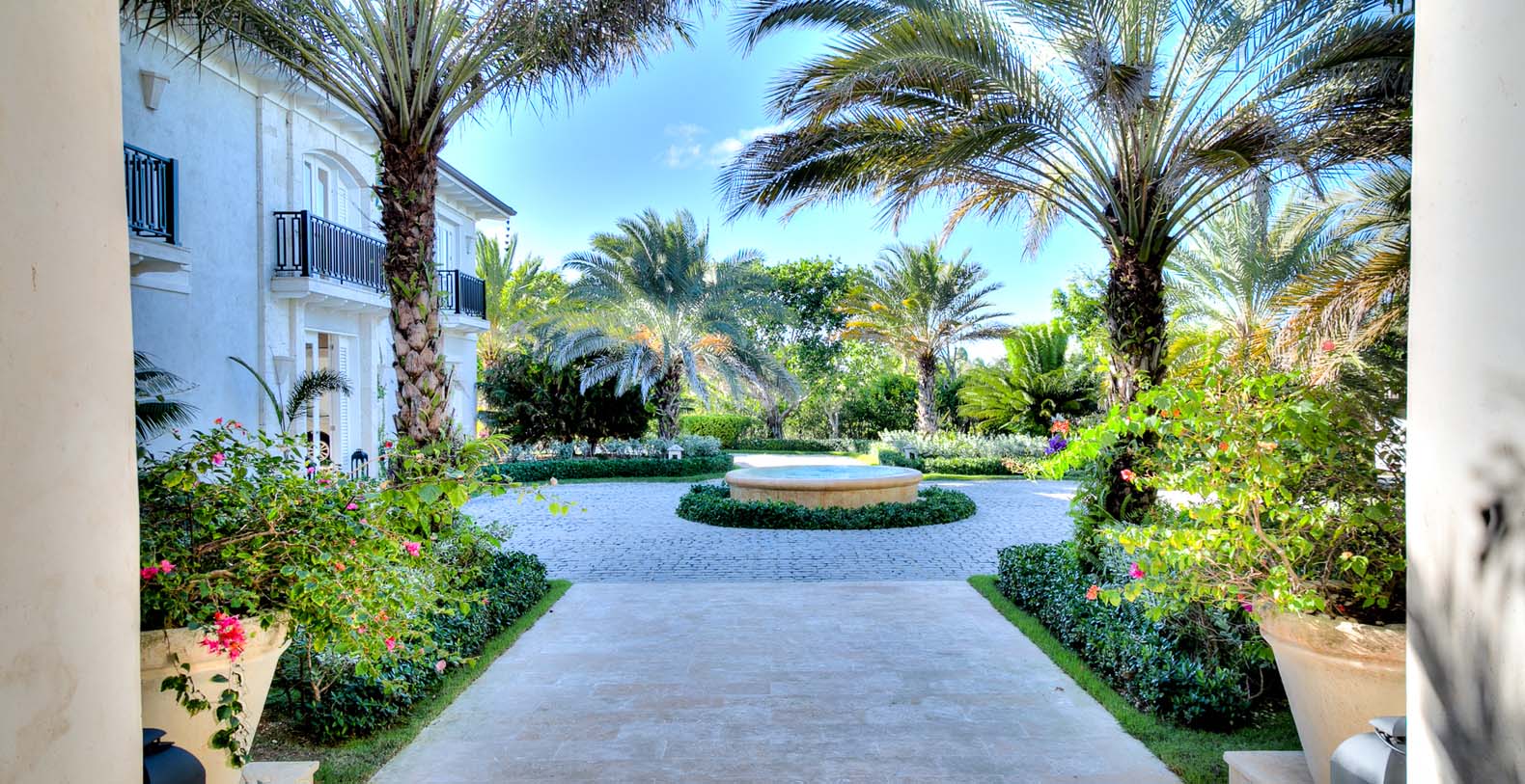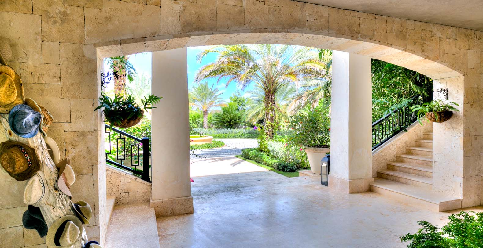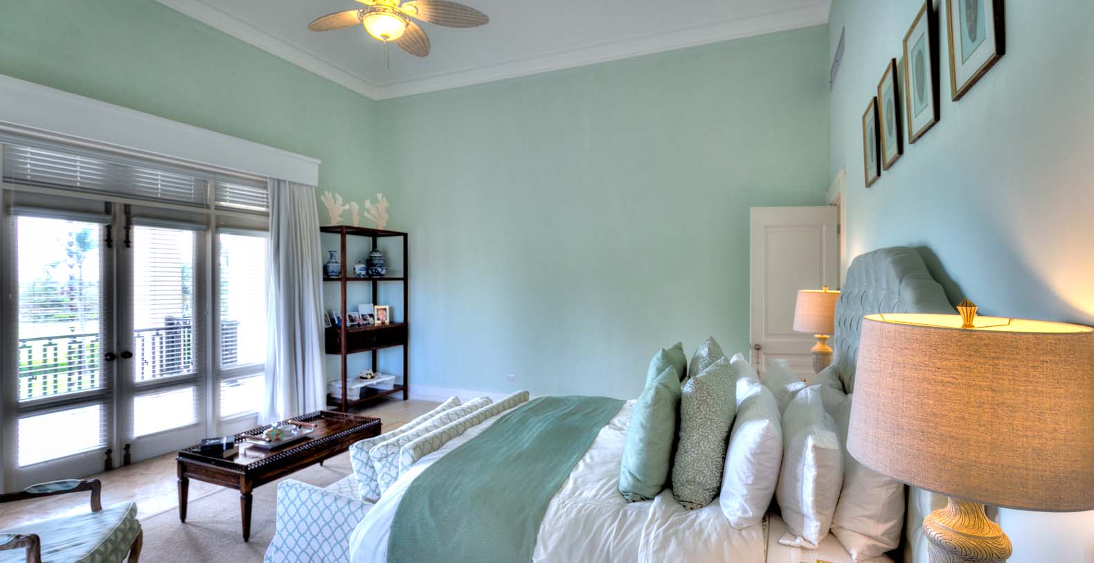 Amid mesmerizing ocean views, golf driveways and evergreen lawns and softly wobbling palm trees, stands Corales 50 with a cobbled entrance and a fountain showing guests the path the main house and the guesthouse. With an imponent facade, the main house beams a broad and open concept, held by two tall coralina columns. Two staircases on each side of the entrance guide to the second floor. On the main floor, with a flawless governant white and pastel blue, the living room invites to lay back in any of its cushy sofas and sophisticated rattan chairs while enjoying the golf and ocean views. The dining room also invokes again a reigning pastel blue, with a large hardwood table with seats for 12 guests and enlighted by a modern and minimalistic chandelier. The fully equipped kitchens with marble countertops, double-door fridge and island/breakfast bar has all appliances and cookware needed to prepare whatever the guest wants.