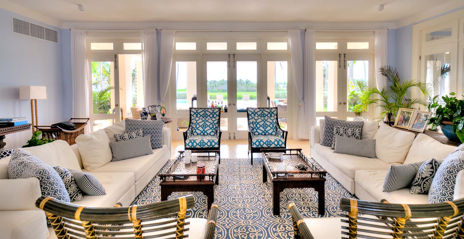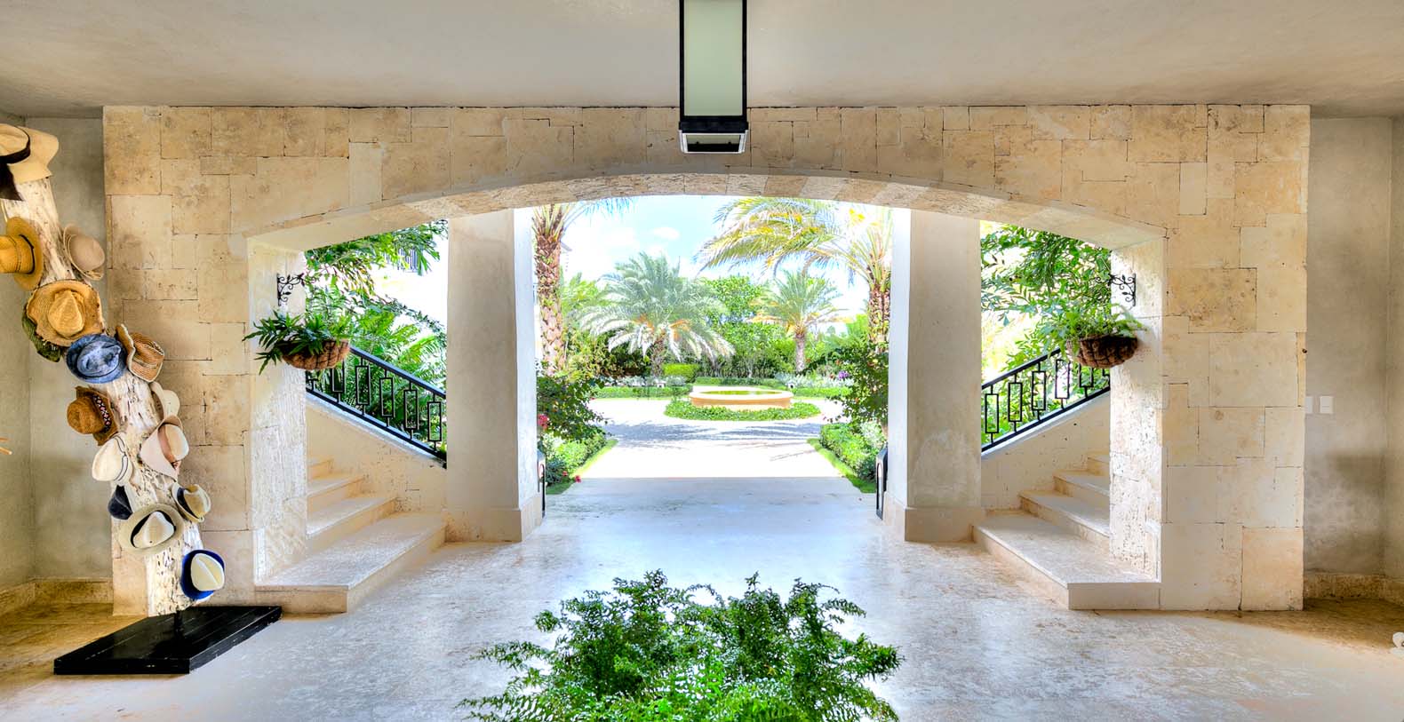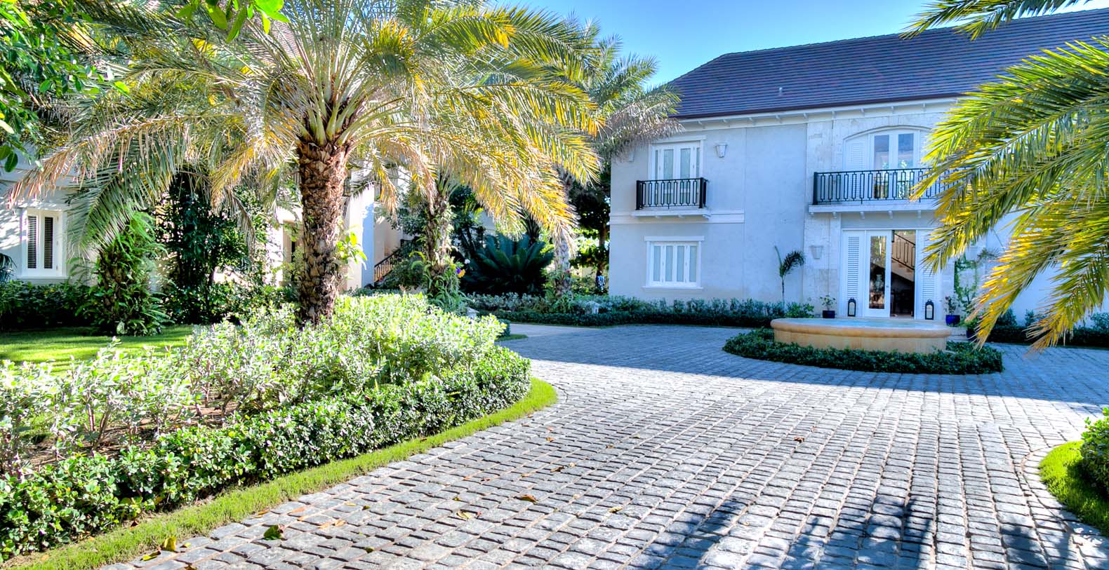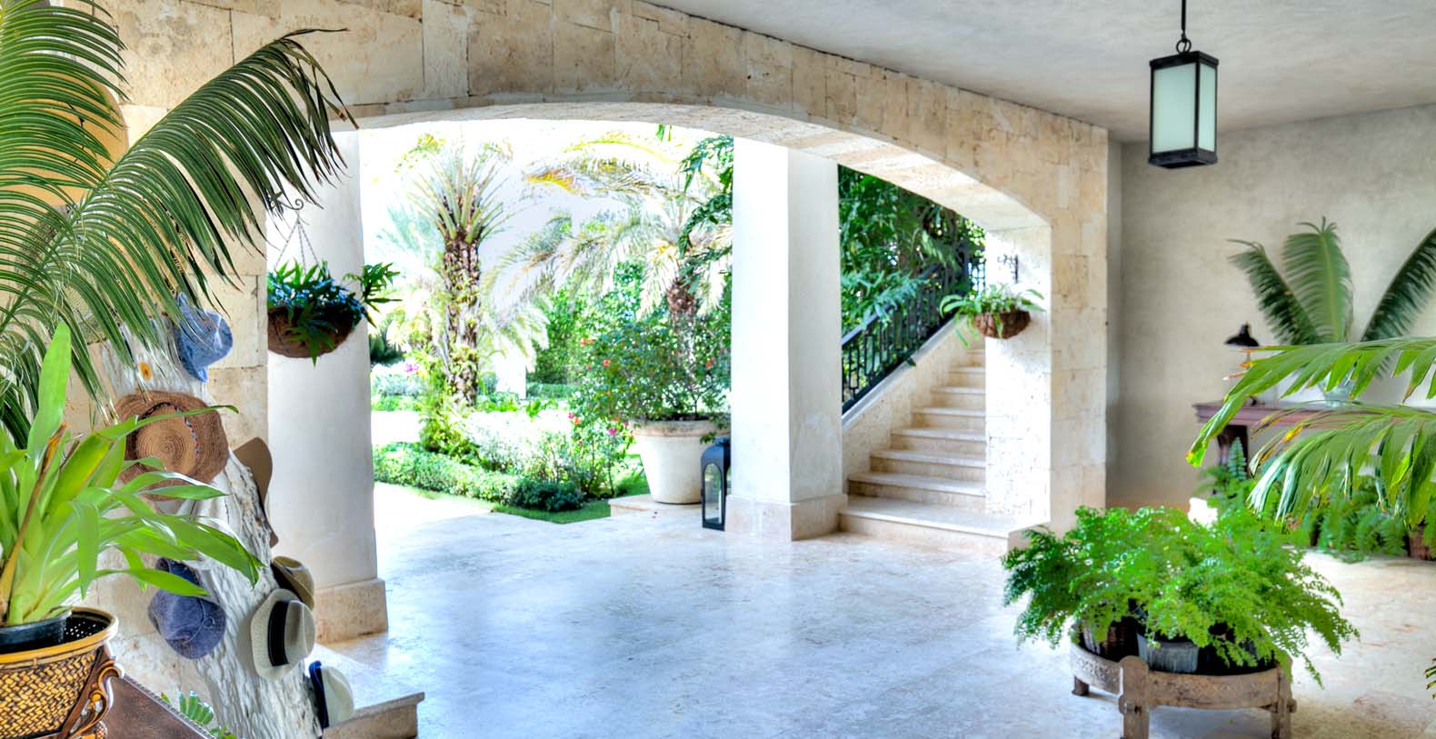 Amid mesmerizing ocean views, golf driveways and evergreen lawns and softly wobbling palm trees, stands Corales 50 with a cobbled entrance and a fountain showing guests the path the main house and the guesthouse. With an imponent facade, the main house beams a broad and open concept, held by two tall coralina columns. Two staircases on each side of the entrance guide to the second floor. On the main floor, with a flawless governant white and pastel blue, the living room invites to lay back in any of its cushy sofas and sophisticated rattan chairs while enjoying the golf and ocean views. The dining room also invokes again a reigning pastel blue, with a large hardwood table with seats for 12 guests and enlighted by a modern and minimalistic chandelier. The fully equipped kitchens with marble countertops, double-door fridge and island/breakfast bar has all appliances and cookware needed to prepare whatever the guest wants.