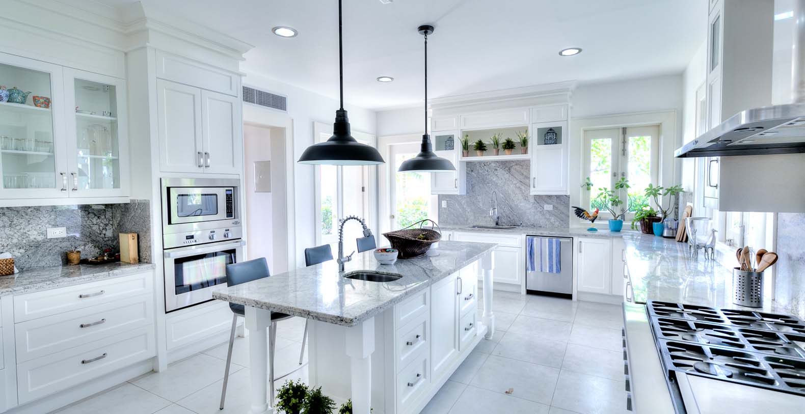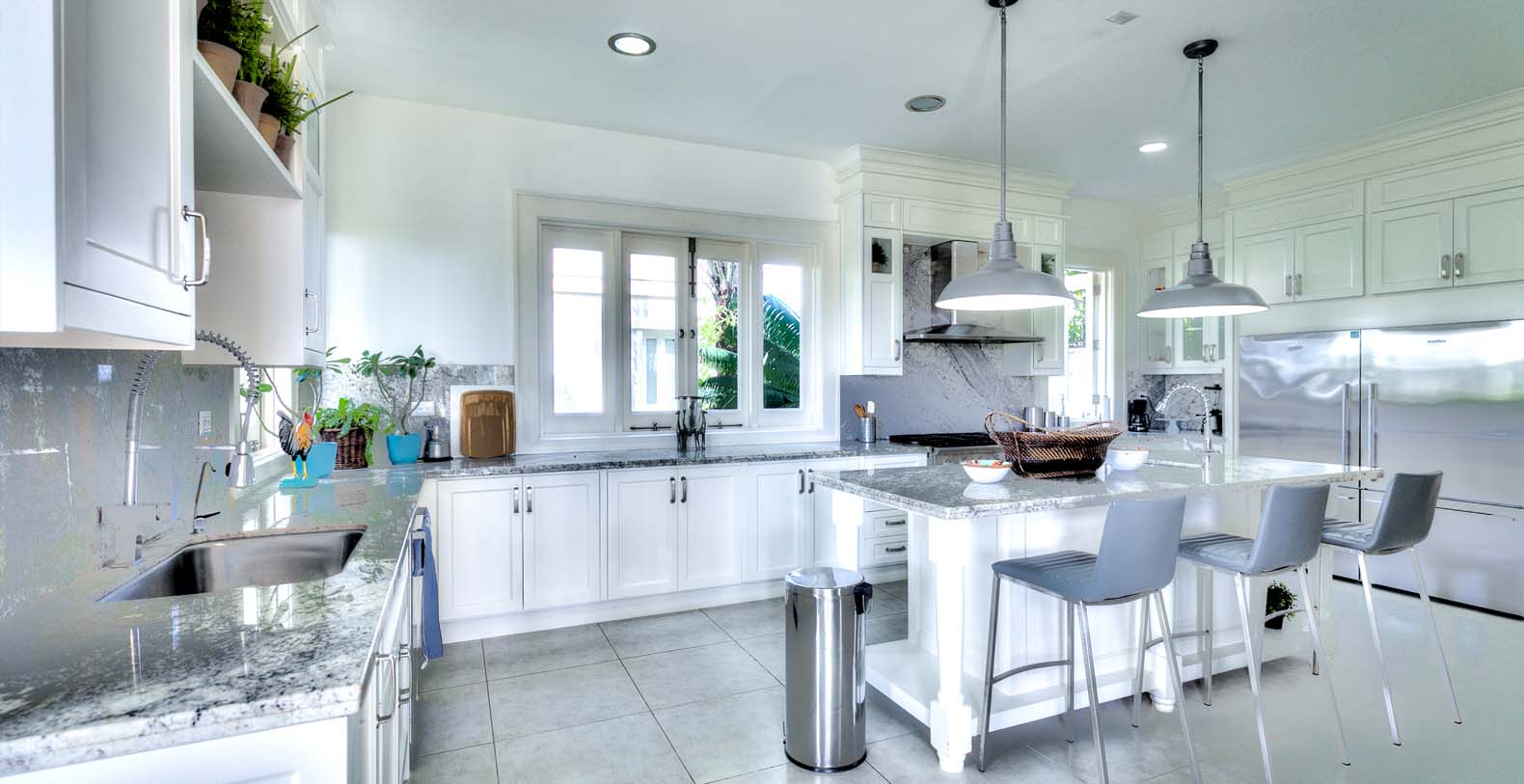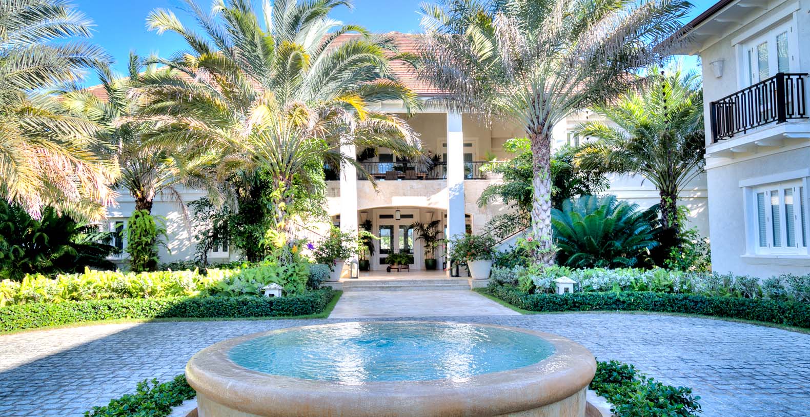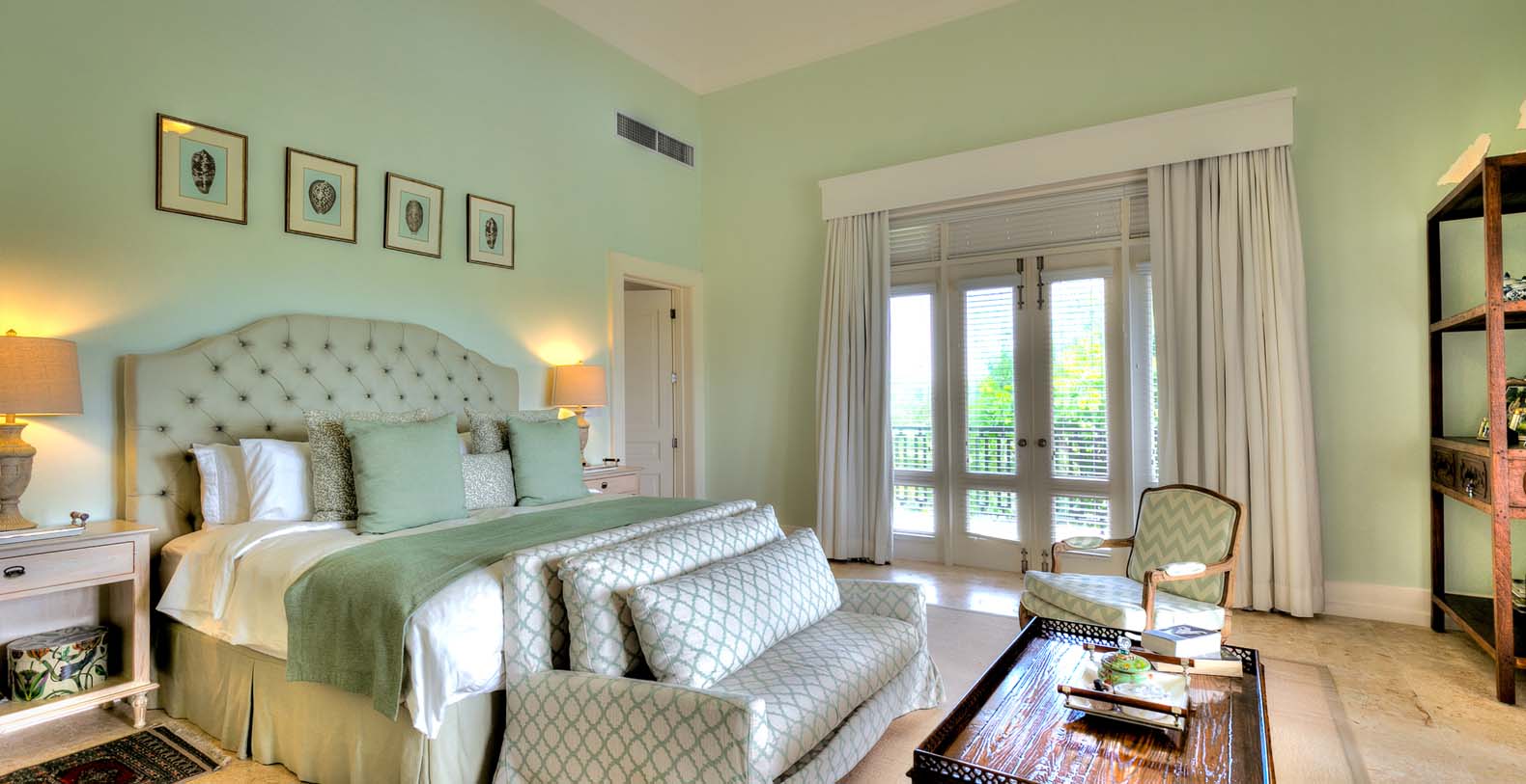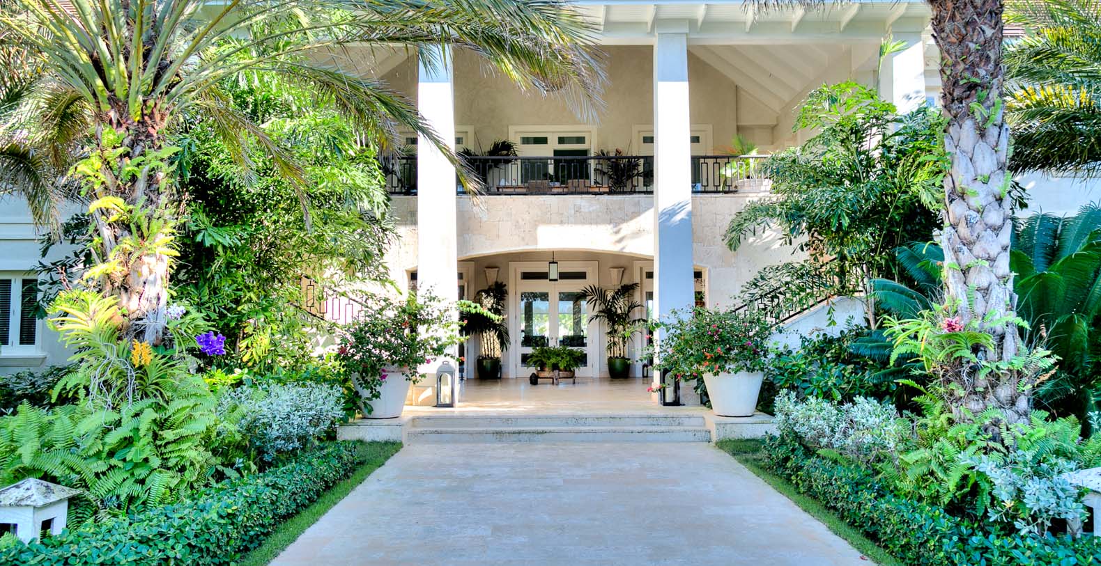 Amid mesmerizing ocean views, golf driveways and evergreen lawns and softly wobbling palm trees, stands Corales 50 with a cobbled entrance and a fountain showing guests the path the main house and the guesthouse. With an imponent facade, the main house beams a broad and open concept, held by two tall coralina columns. Two staircases on each side of the entrance guide to the second floor. On the main floor, with a flawless governant white and pastel blue, the living room invites to lay back in any of its cushy sofas and sophisticated rattan chairs while enjoying the golf and ocean views. The dining room also invokes again a reigning pastel blue, with a large hardwood table with seats for 12 guests and enlighted by a modern and minimalistic chandelier. The fully equipped kitchens with marble countertops, double-door fridge and island/breakfast bar has all appliances and cookware needed to prepare whatever the guest wants.