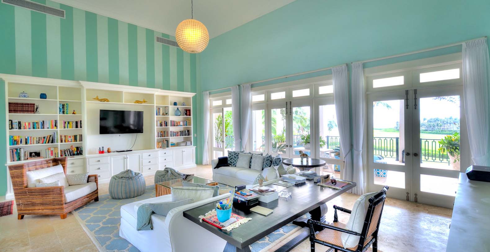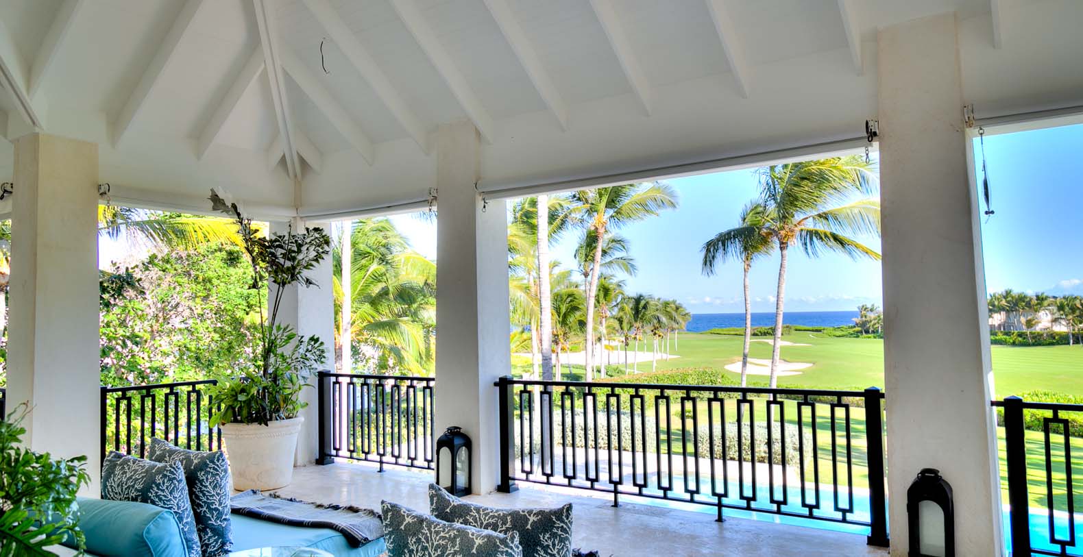 On the second floor, the high-ceiled media room is the perfect spot to watch cable TV, sitting on any of its comfortable sofas. From there, the great balcony offers splendid views to the Corales golf course and the Caribbean ocean.