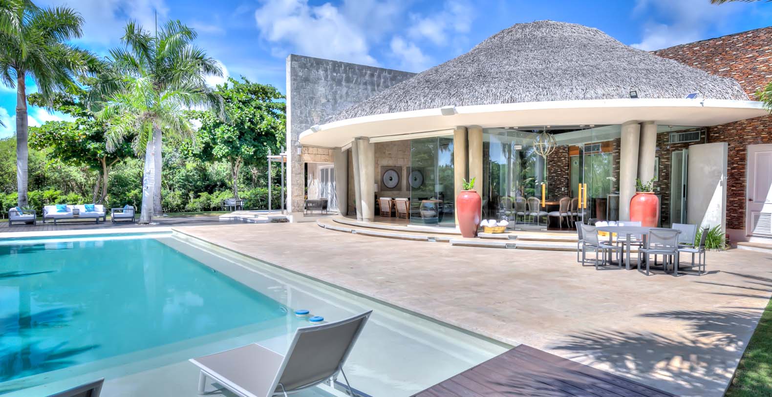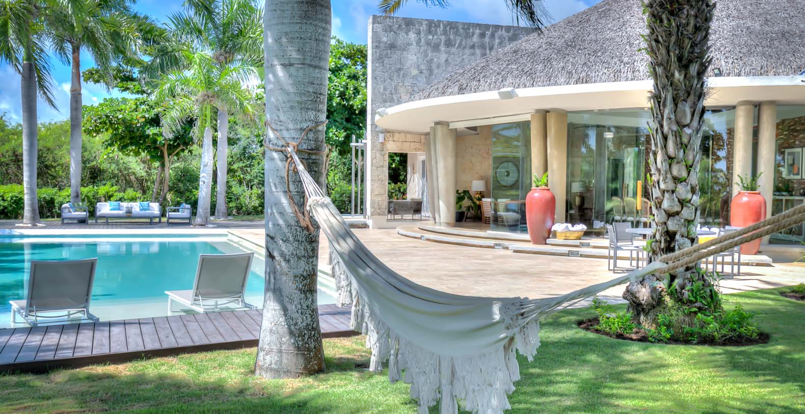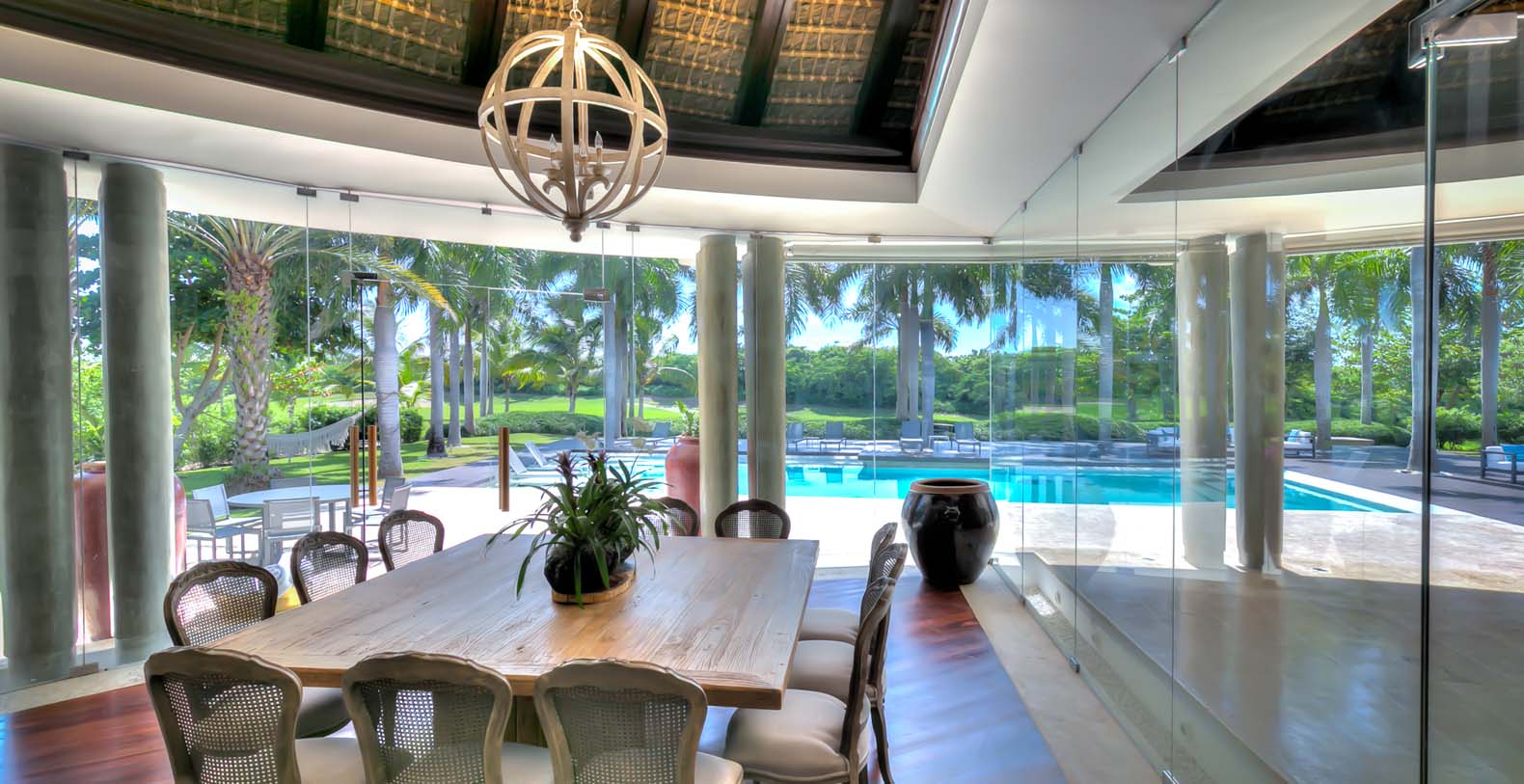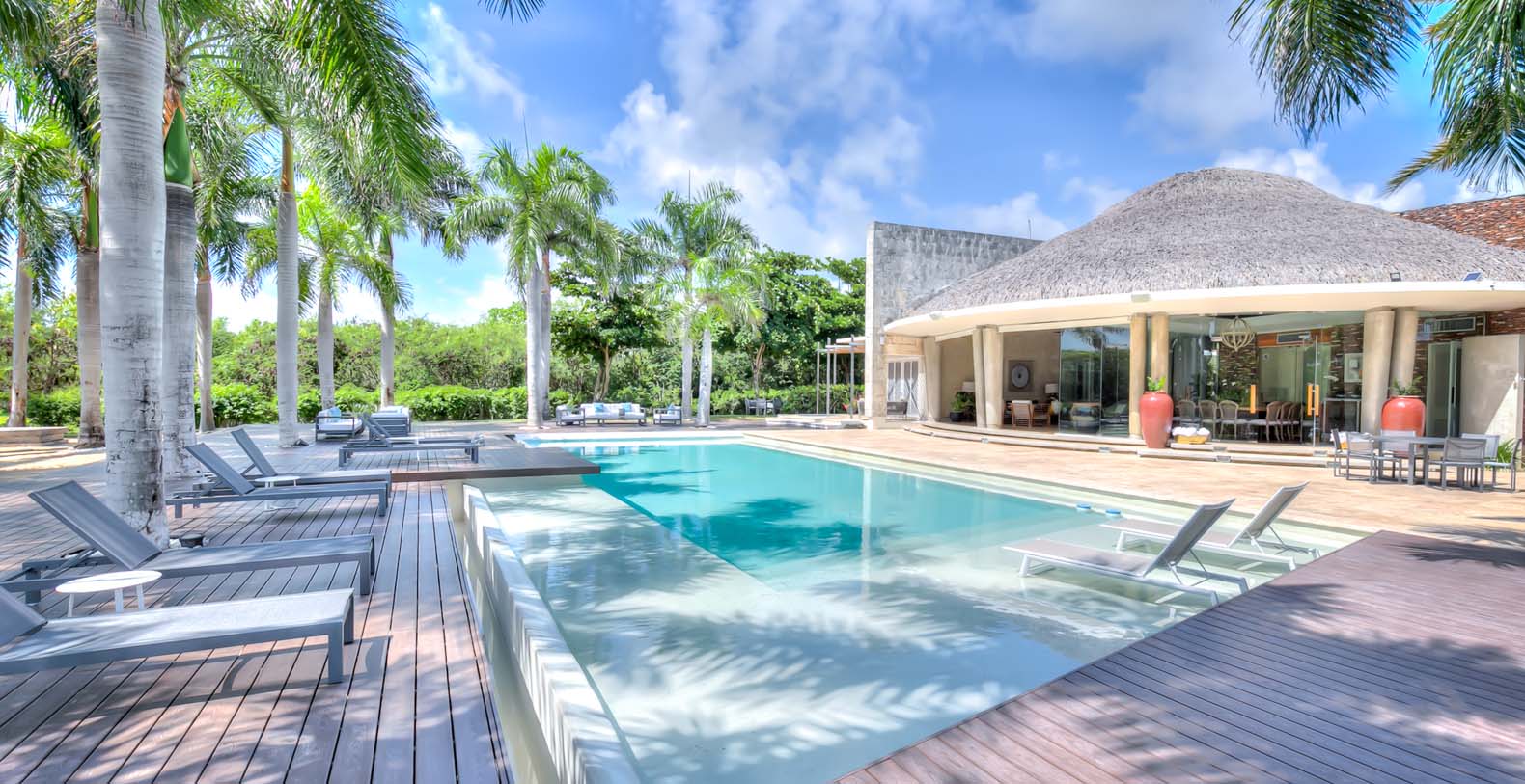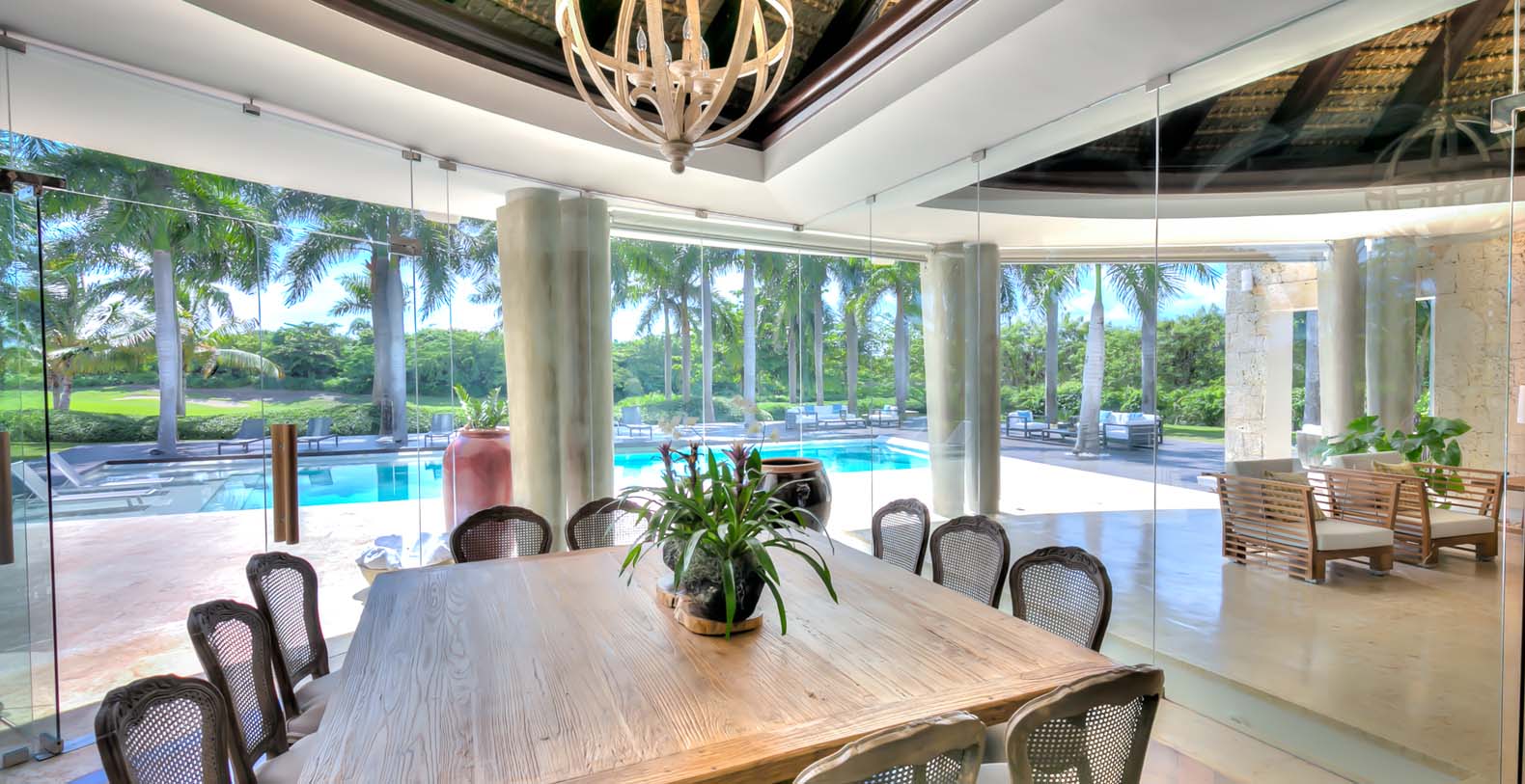Steering through the main entrance, a long way enhanced with striking stainless pergola guides visitors to the circle-shaped main building. Along the way, each individual bedroom cottage awaits its guests fretfully. The villa offers a fresh decor with penny-farthing bikes in the media room and strident paintings. Most walls have natural stones or coralina slabs, giving an elegant look with the hay ceiling and the wooden beams. The dining room and living room are governed by large glass windows and doors, giving the guests ample views from the villa to the garden and the golf course. The dining room has a hardwood floor, a 12-seats table, and access to the garden. Next is the living room connected to the outdoor living with an open concept with two giant red vases. The wooden deck with sun loungers surrounds the pool and giving a genuine and onliest touch to the garden. The hot tub is the ultimate spot to lay back and enjoy the bluffing views or to gently swing on the hammock while prizing the Caribbean breeze.