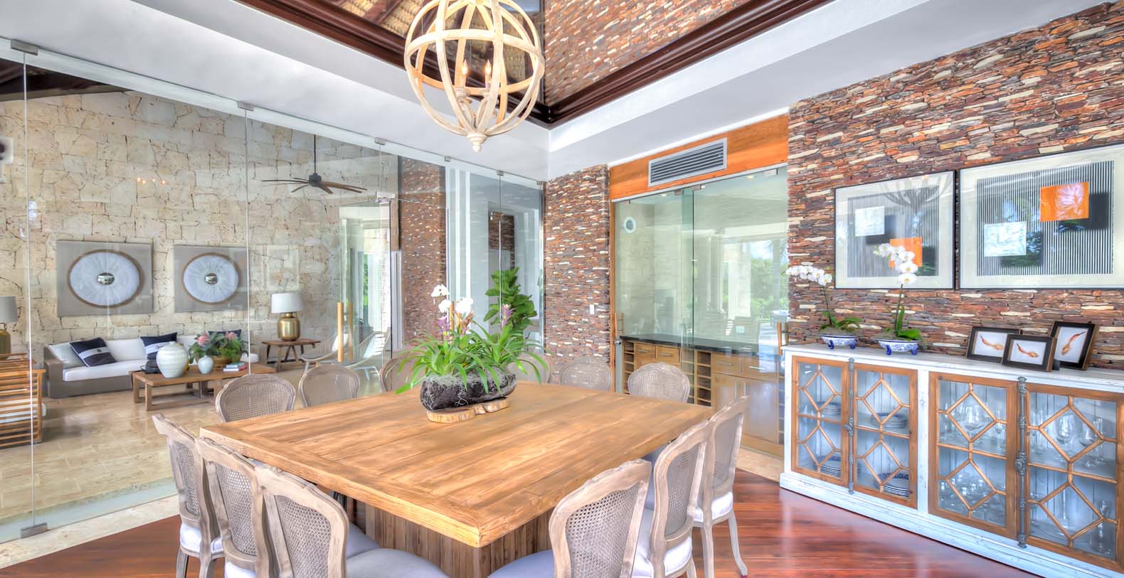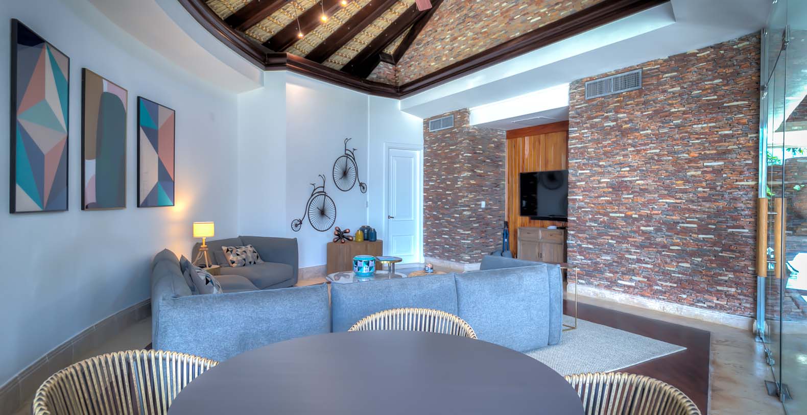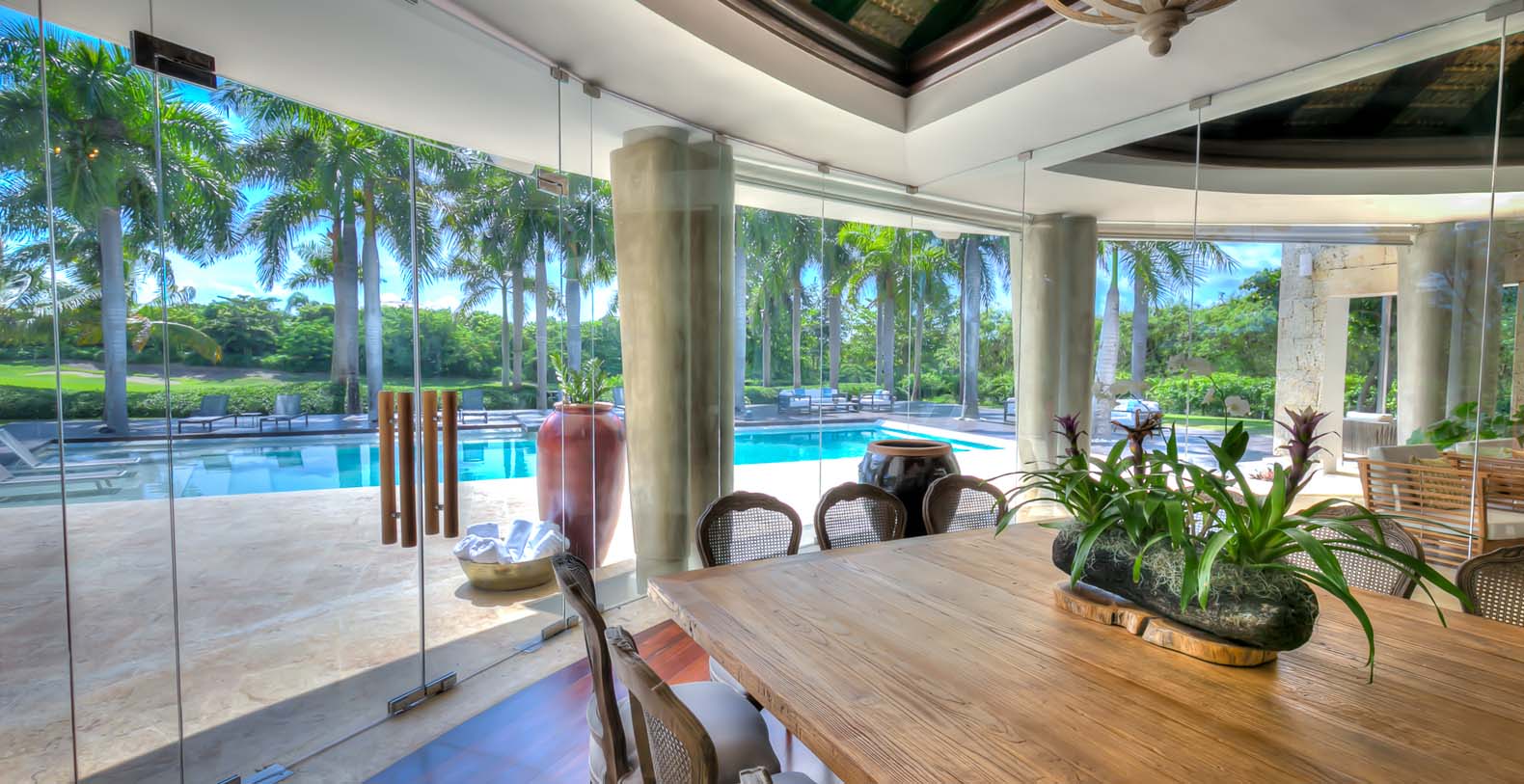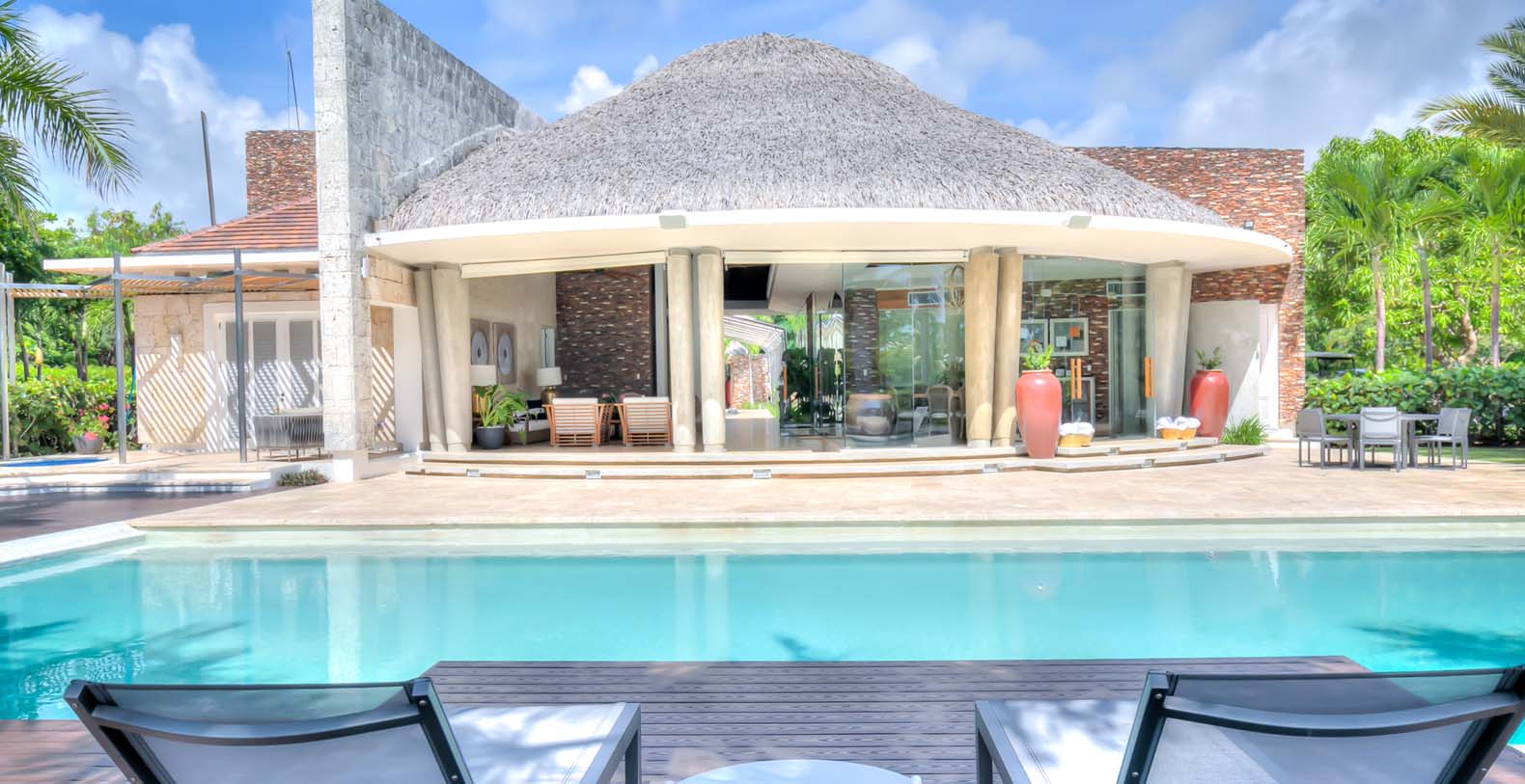 Steering through the main entrance, a long way enhanced with striking stainless pergola guides visitors to the circle-shaped main building. Along the way, each individual bedroom cottage awaits its guests fretfully. The villa offers a fresh decor with penny-farthing bikes in the media room and strident paintings. Most walls have natural stones or coralina slabs, giving an elegant look with the hay ceiling and the wooden beams. The dining room and living room are governed by large glass windows and doors, giving the guests ample views from the villa to the garden and the golf course. The dining room has a hardwood floor, a 12-seats table, and access to the garden. Next is the living room connected to the outdoor living with an open concept with two giant red vases. The wooden deck with sun loungers surrounds the pool and giving a genuine and onliest touch to the garden. The hot tub is the ultimate spot to lay back and enjoy the bluffing views or to gently swing on the hammock while prizing the Caribbean breeze.