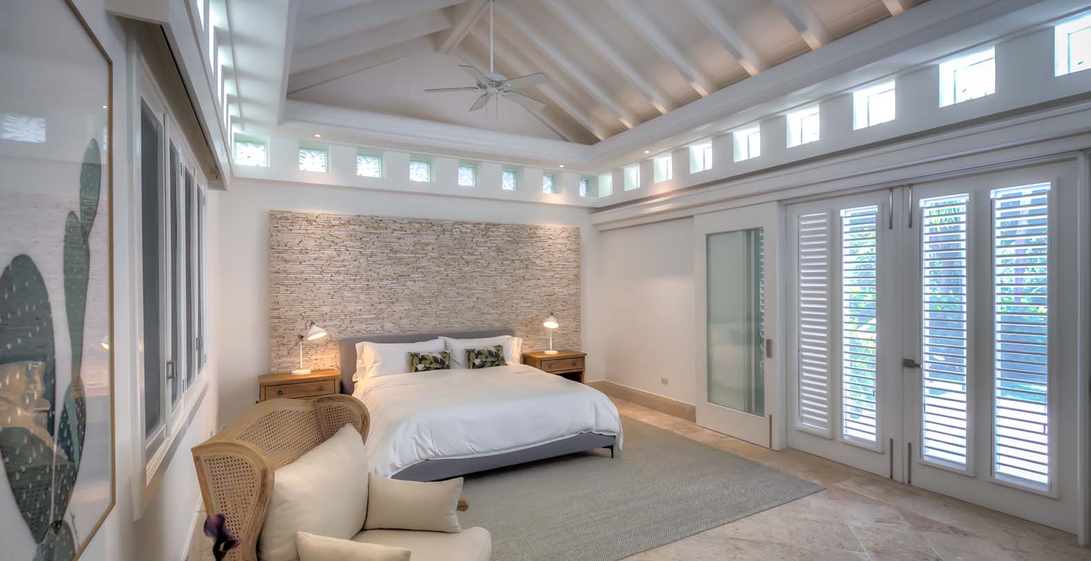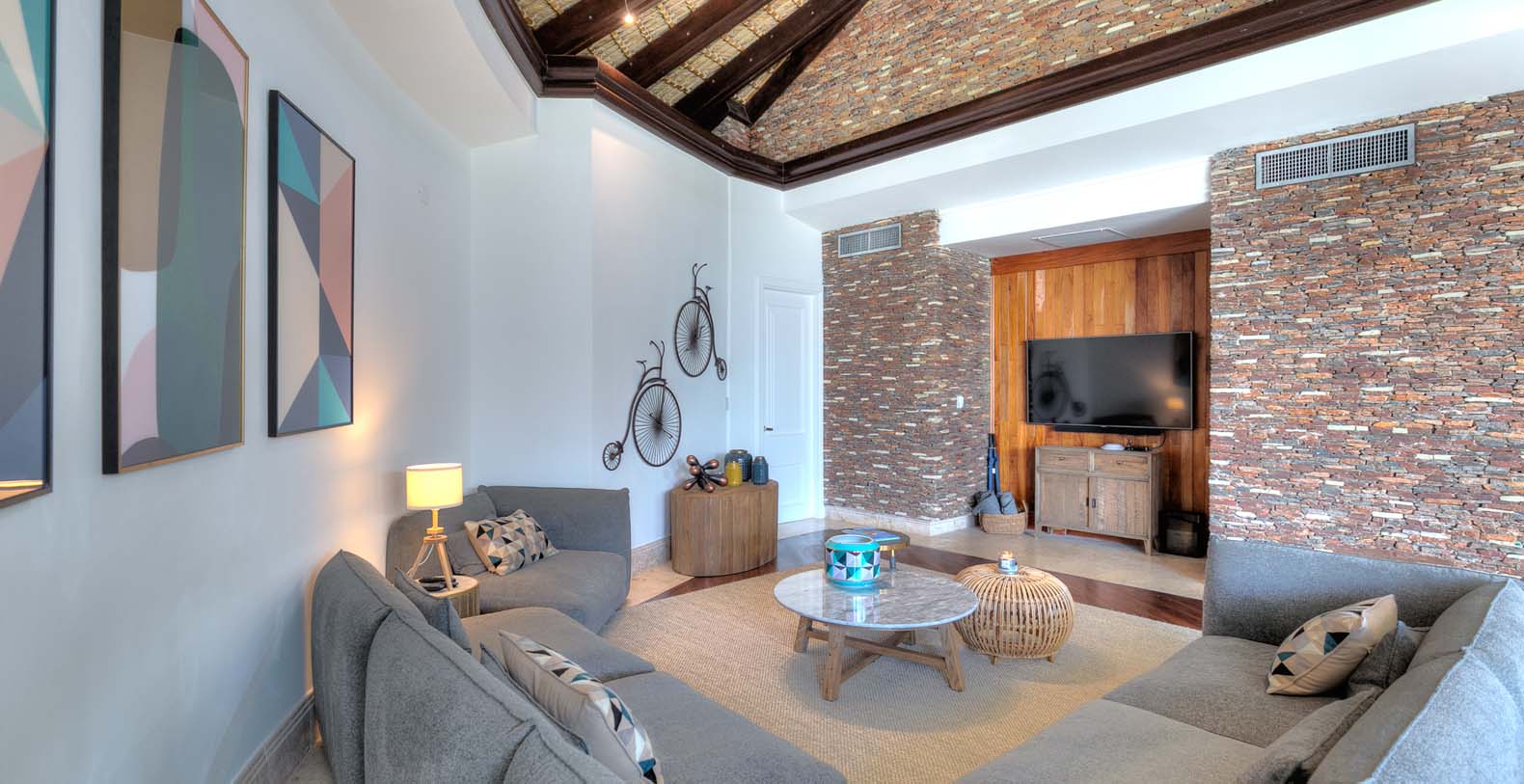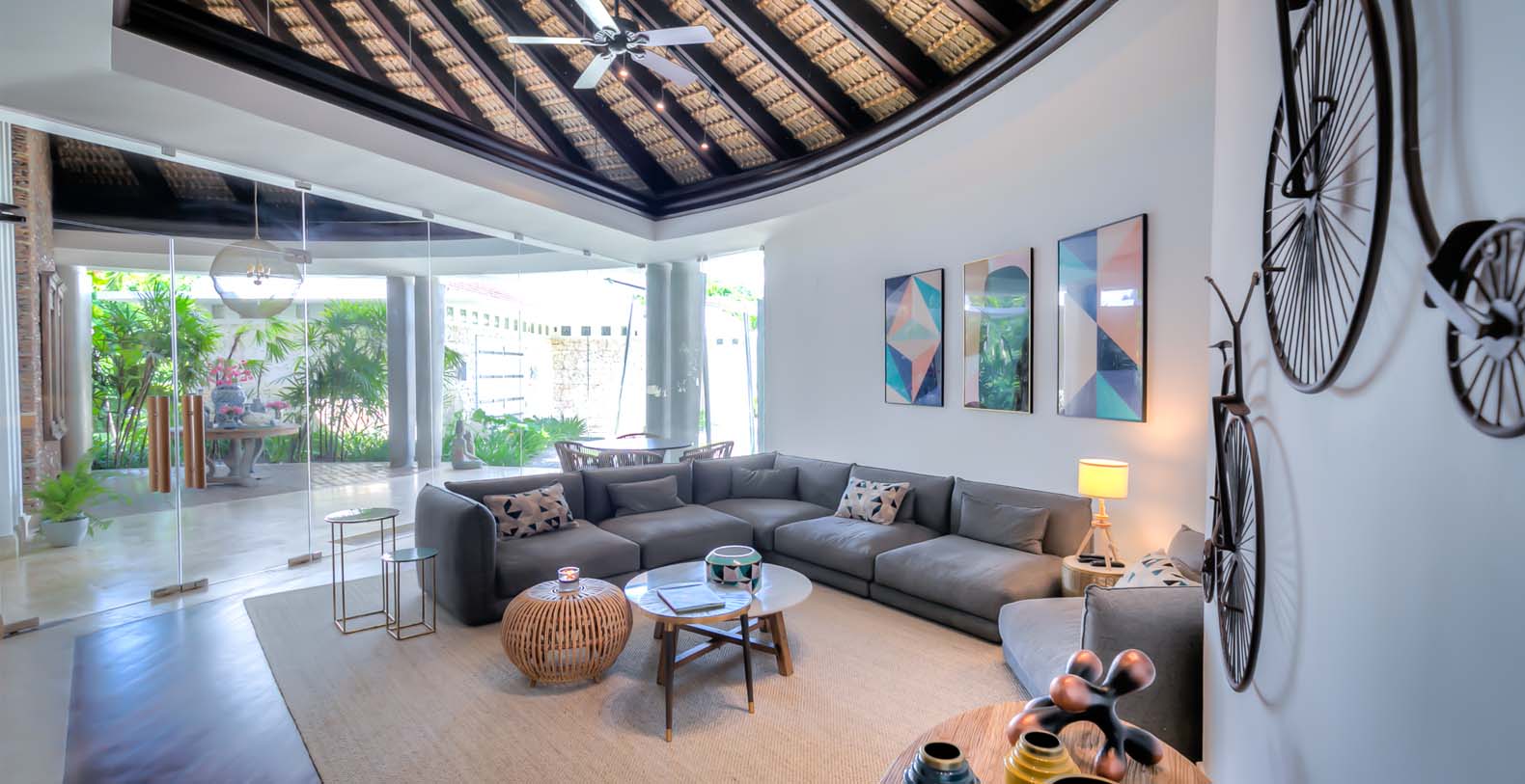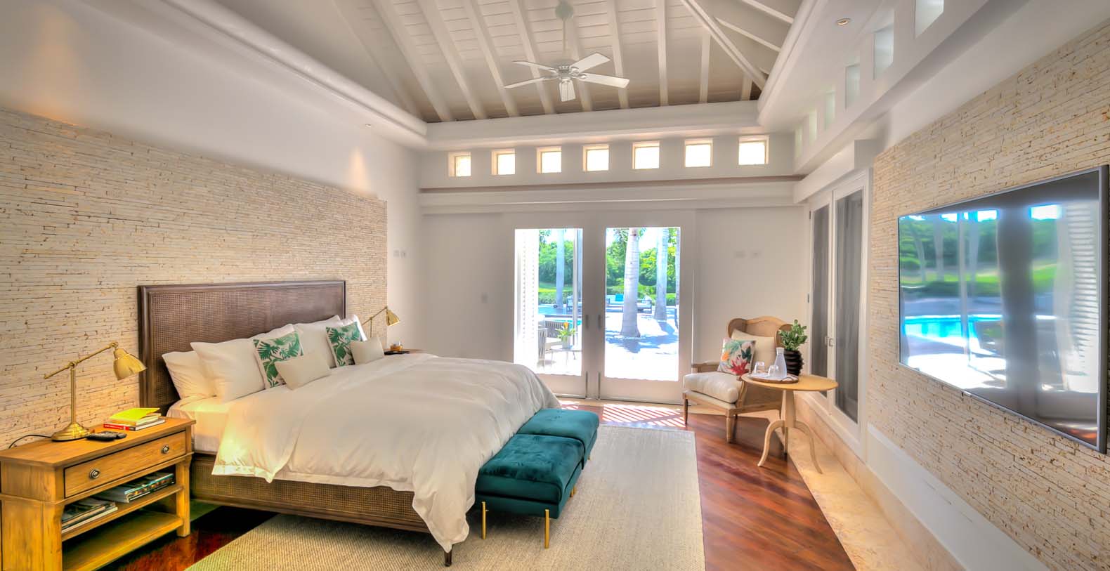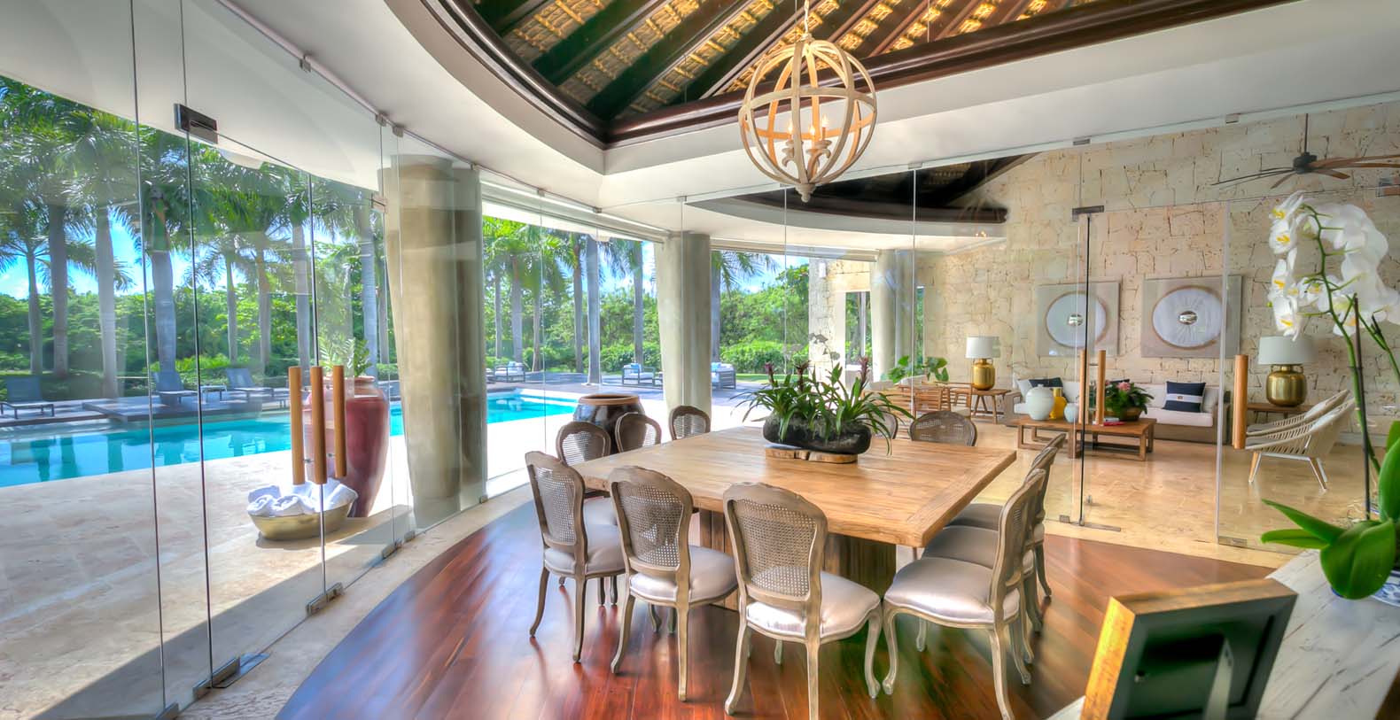 Steering through the main entrance, a long way enhanced with striking stainless pergola guides visitors to the circle-shaped main building. Along the way, each individual bedroom cottage awaits its guests fretfully. The villa offers a fresh decor with penny-farthing bikes in the media room and strident paintings. Most walls have natural stones or coralina slabs, giving an elegant look with the hay ceiling and the wooden beams. The dining room and living room are governed by large glass windows and doors, giving the guests ample views from the villa to the garden and the golf course. The dining room has a hardwood floor, a 12-seats table, and access to the garden. Next is the living room connected to the outdoor living with an open concept with two giant red vases. The wooden deck with sun loungers surrounds the pool and giving a genuine and onliest touch to the garden. The hot tub is the ultimate spot to lay back and enjoy the bluffing views or to gently swing on the hammock while prizing the Caribbean breeze.