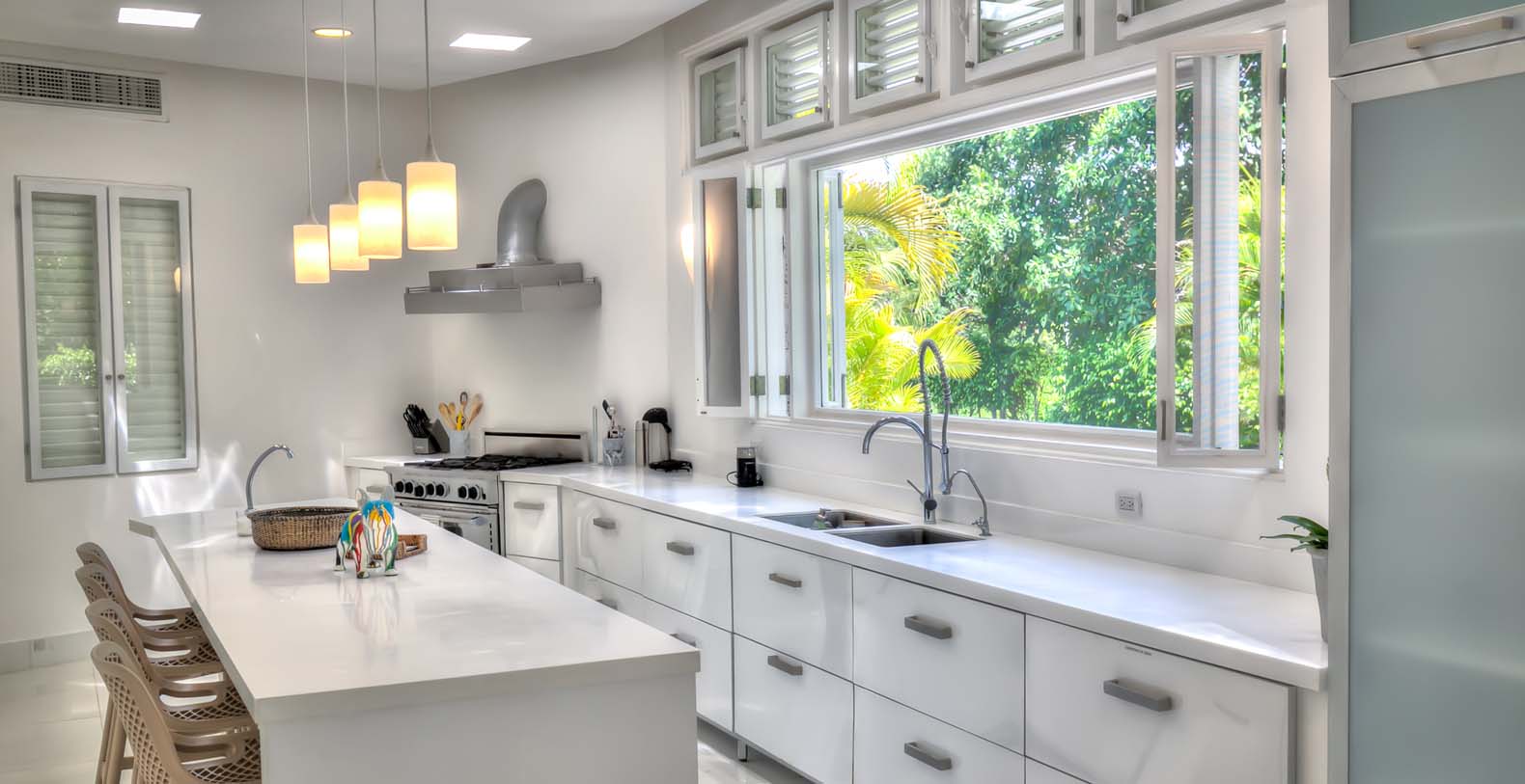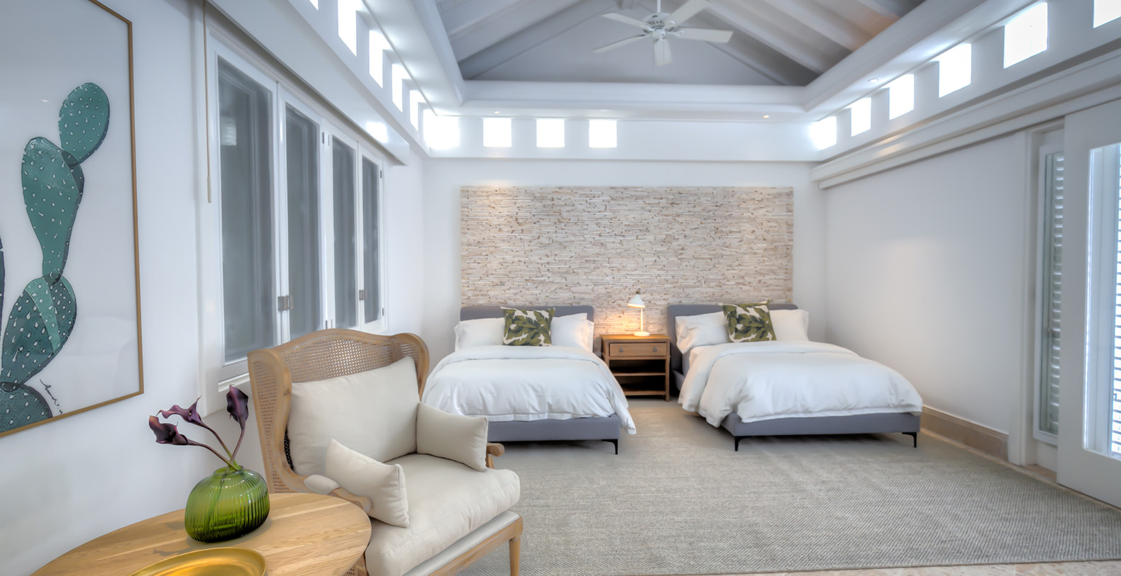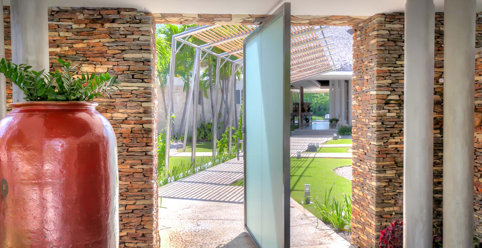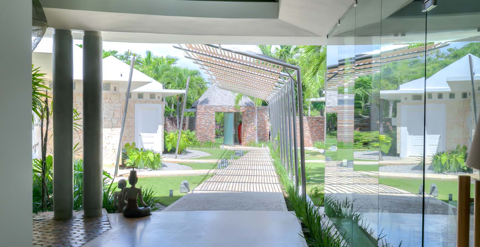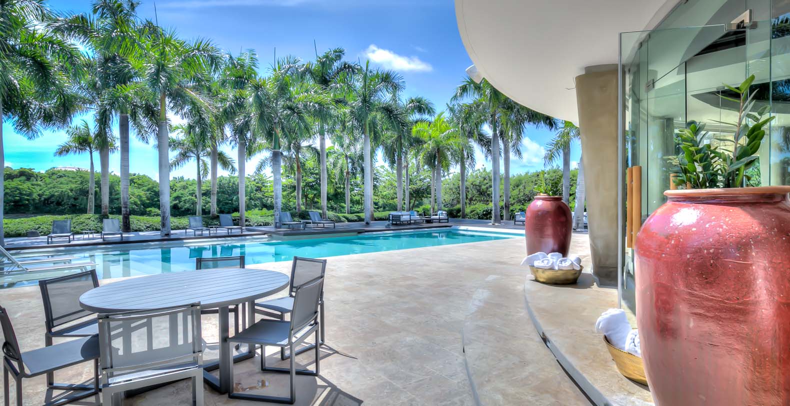 Steering through the main entrance, a long way enhanced with striking stainless pergola guides visitors to the circle-shaped main building. Along the way, each individual bedroom cottage awaits its guests fretfully. The villa offers a fresh decor with penny-farthing bikes in the media room and strident paintings. Most walls have natural stones or coralina slabs, giving an elegant look with the hay ceiling and the wooden beams. The dining room and living room are governed by large glass windows and doors, giving the guests ample views from the villa to the garden and the golf course. The dining room has a hardwood floor, a 12-seats table, and access to the garden. Next is the living room connected to the outdoor living with an open concept with two giant red vases. The wooden deck with sun loungers surrounds the pool and giving a genuine and onliest touch to the garden. The hot tub is the ultimate spot to lay back and enjoy the bluffing views or to gently swing on the hammock while prizing the Caribbean breeze.