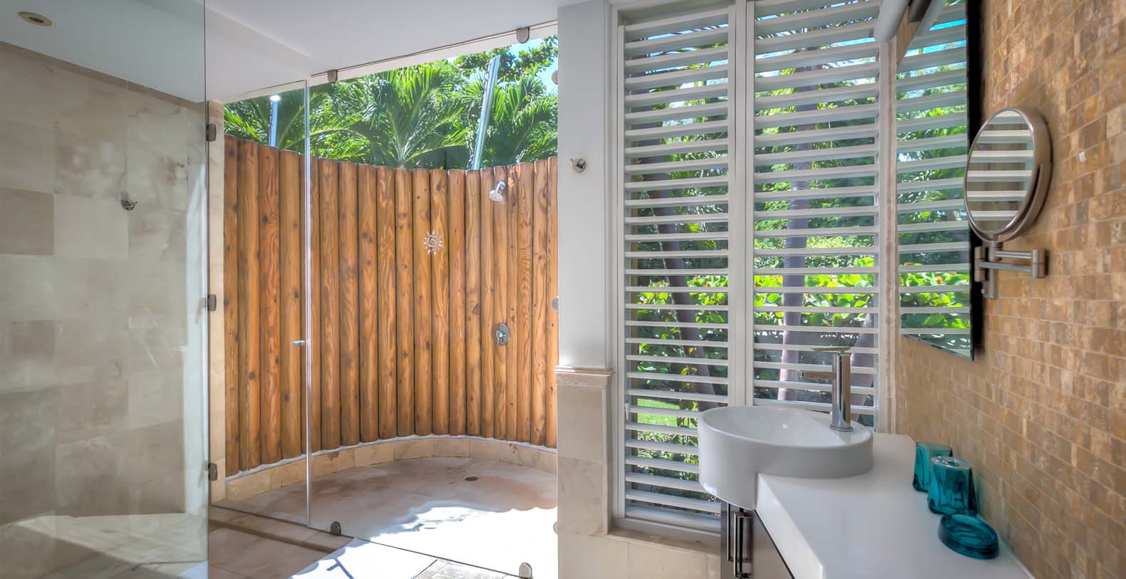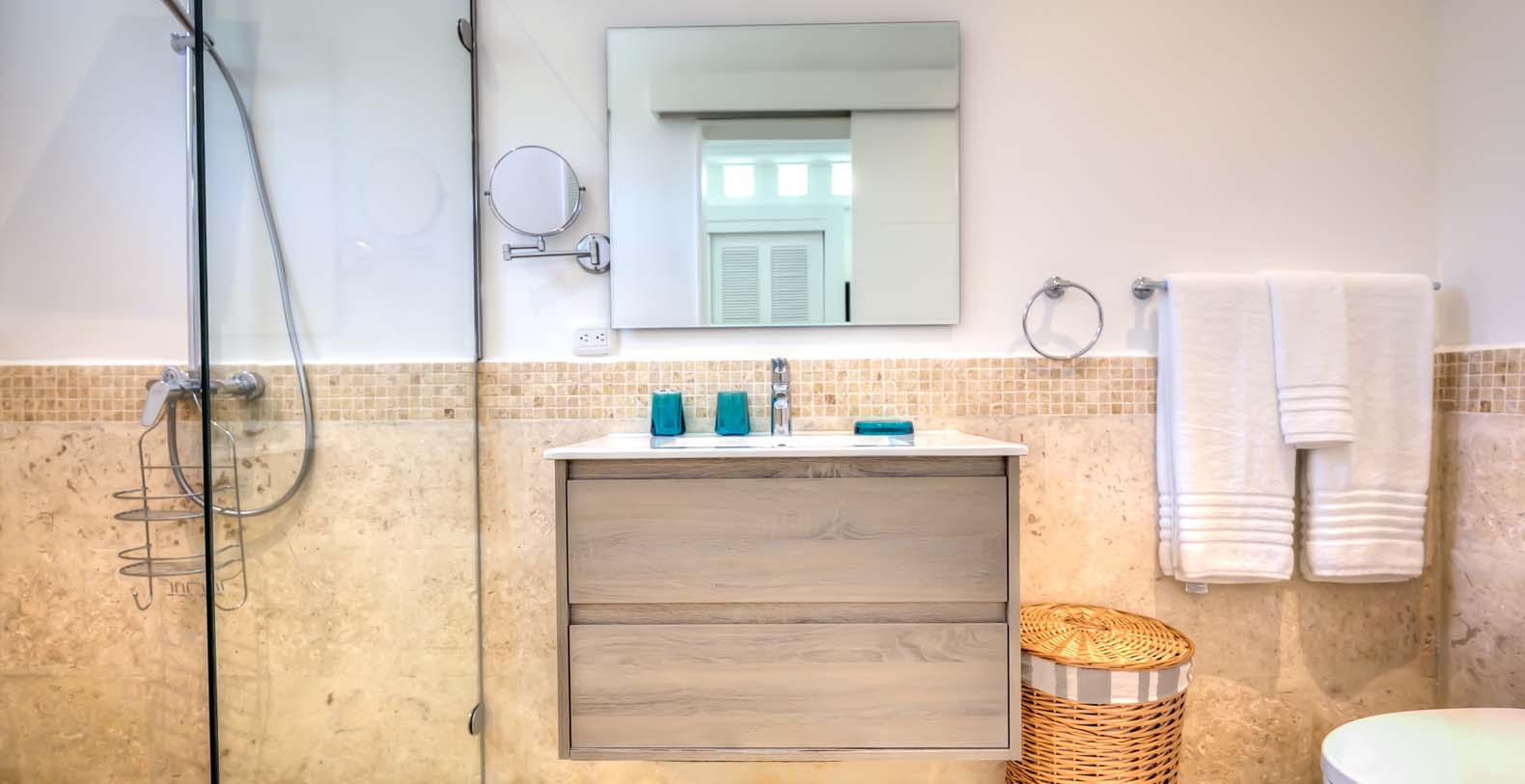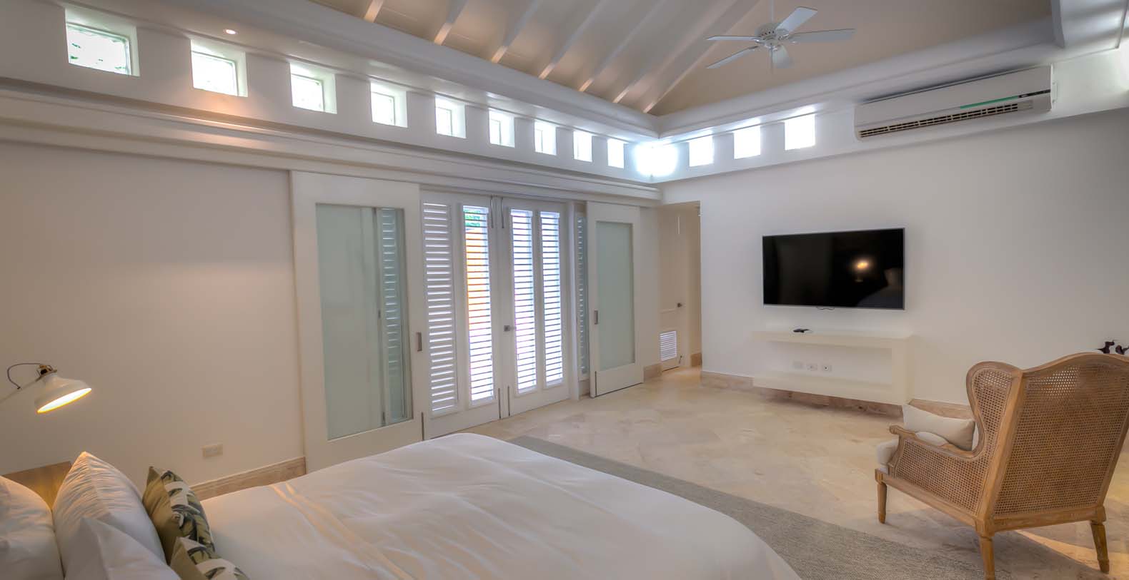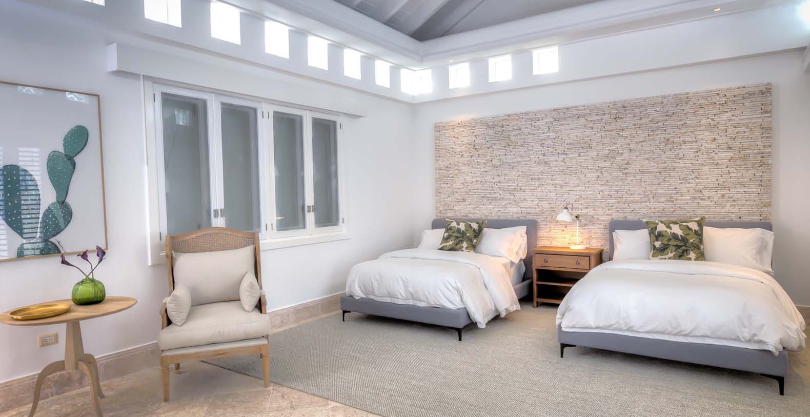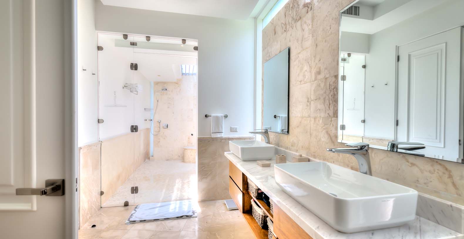 Corales 60 contributes with its 6 unconnected and private bedroom cottages. The master bedroom has a king bed, ensuite bathroom, TV, exterior and interior shower. The second bedroom and third bedroom have a king bed, TV, ensuite bathroom, walk-in closet, outdoor and indoor shower each. The fourth bedroom and fifth bedroom have 2 queen beds, TV, ensuite bathroom, walk-in closet, outdoor and indoor shower each. The sixth bedroom has a TV, closet, and bathroom with shower.