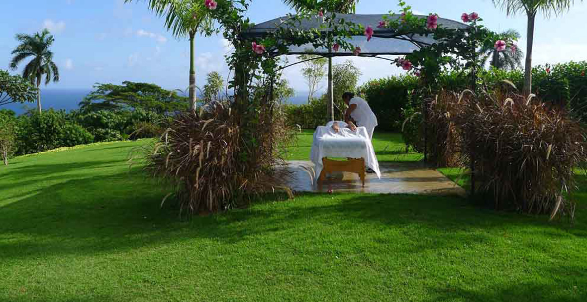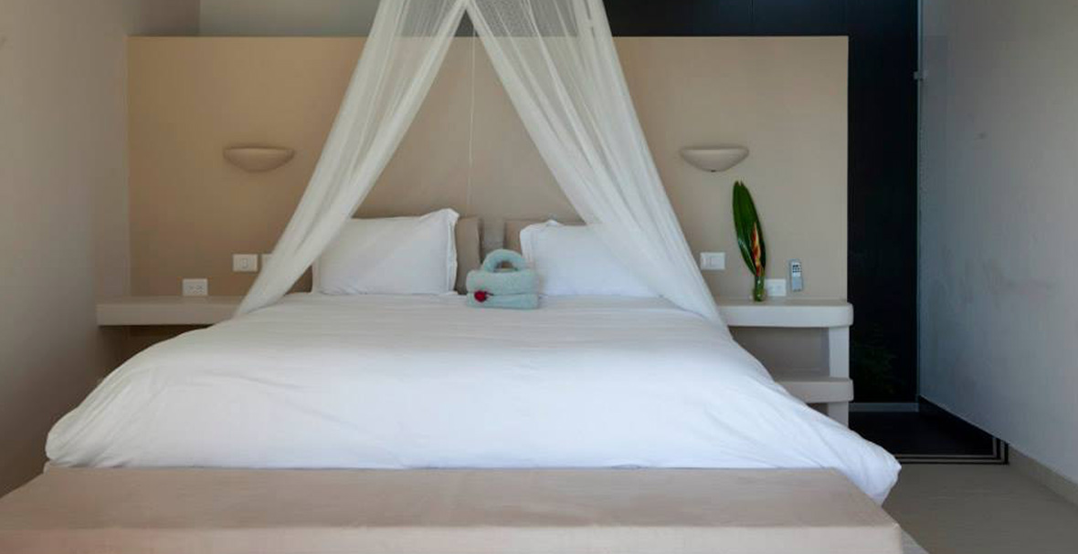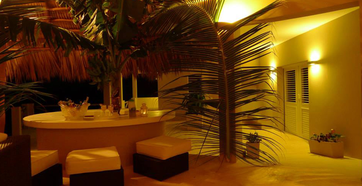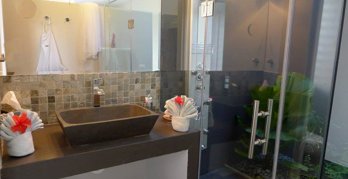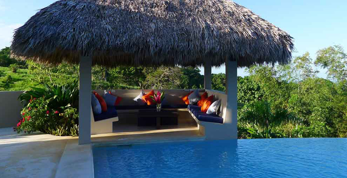 Climb the spiral staircase to relax in the shade or sun on the elegant roof terrace, complete with a 360-degree view of the sea and verdant hills of the tropical forest. Along with the lounge beds, oversized cushions are available for your comfort. Enjoy an evening cocktail as you watch the sun setting behind the palm trees on the hill.Cool off in the spectacular infinity pool on the main level or in the shade of the poolside gazebo. Bask in the sun on the poolside lounge bed or one of the lounge chairs on the terrace. Need some pampering? Enjoy a massage in the garden pavilion cooled by the sea breeze, or take advantage of the Jacuzzi nestled in the tropical garden below the pool.