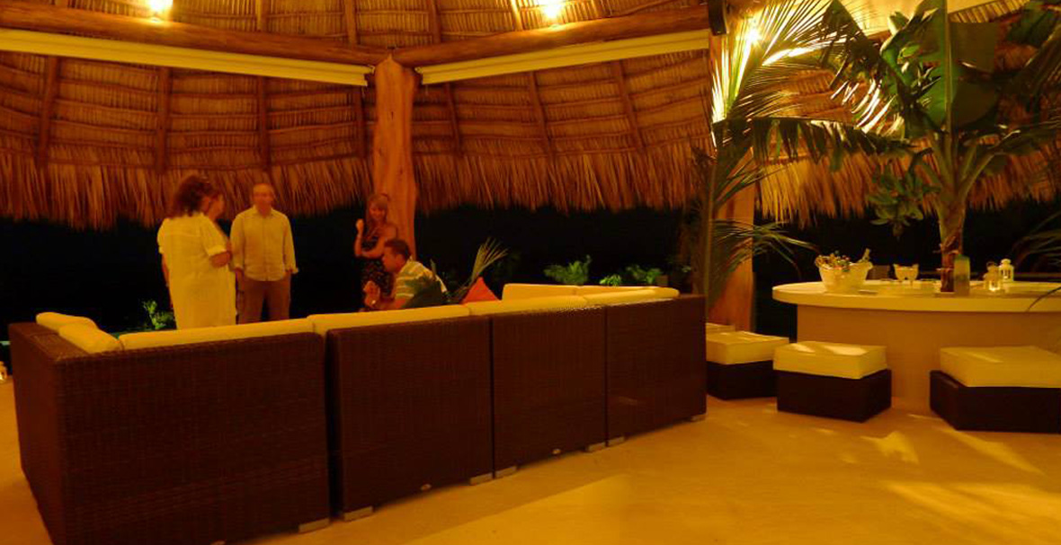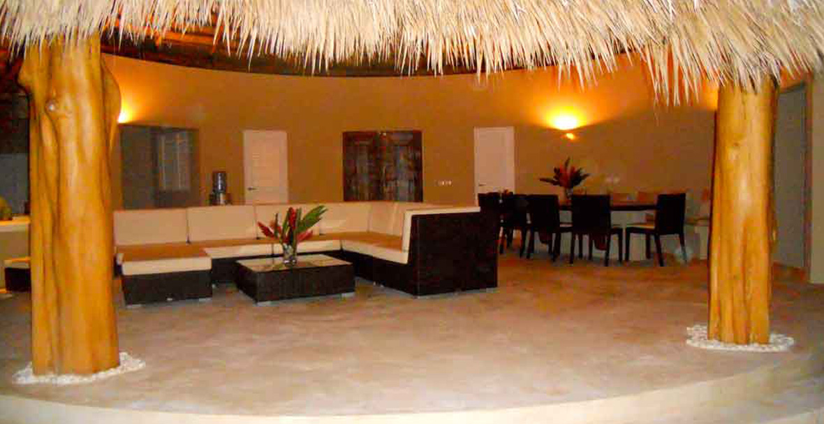 The elegant open-air living space under the traditional Cana roof includes a dining area with seating for 14. In the TV room, you will find a large flat screen TV, a hard disc filled with movies and TV series, an iPod cable connected to speakers surrounding the public areas, a lending library, and a supply of board games; there is also a working space and Wi-Fi connection.?