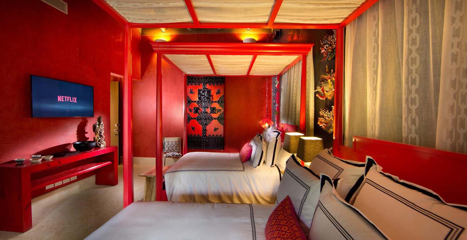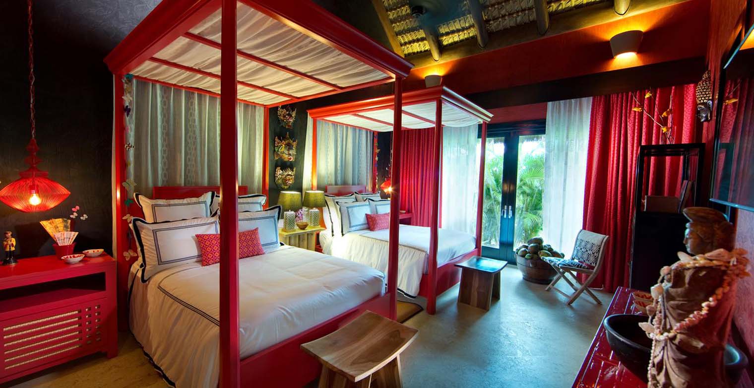 Another bedroom is dedicated to the couple’s trips to Asia, which they remember with love and enthusiasm. “In front of a wall with an unusual black technique and the others with a red vibrant, the modern beds with straight lines and lacquered in red surprises us with their dramatism, highlighted by the original colorful masks, part the owner’s collection. An ancient door unfolds like art, the mirror frame of thick bamboo and the teka banquettes remind us of materials from other latitudes, but as tropical as ours”, tells Patricia Reid.