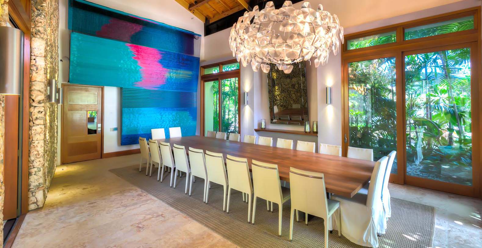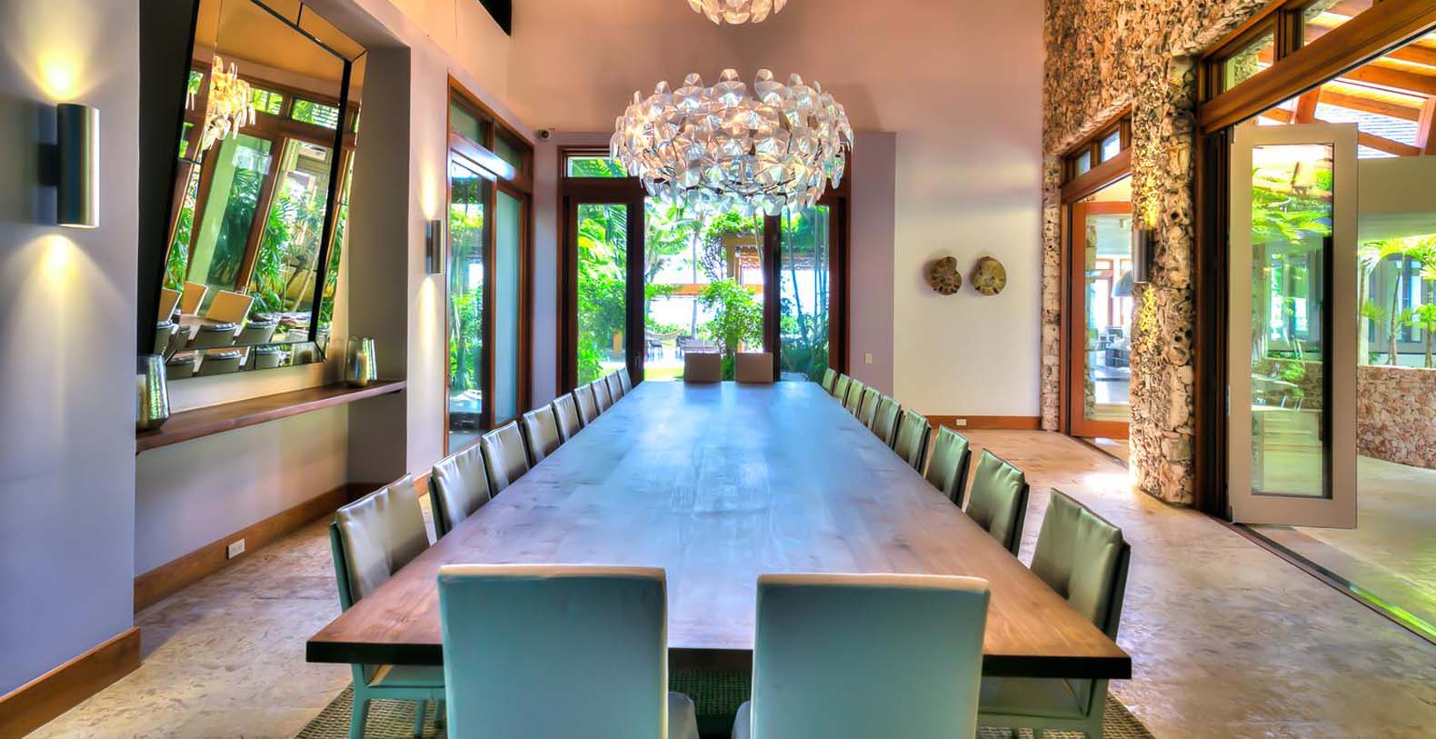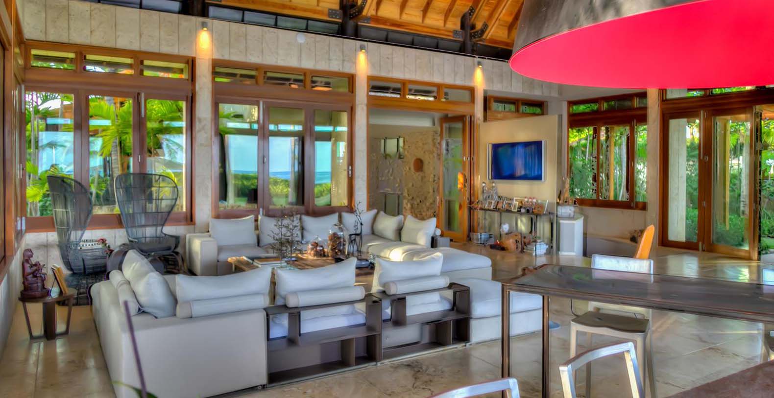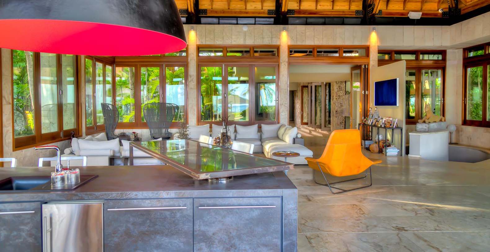 Carved in natural coraline stones and rectangular stone walls with a majestic blue ammonite shape, high-ceiled wooden the entrance will take all guests to one of the most envied and fabulous views of the Caribbean ocean. The way goes along a large aisle next to water mirrors with colorful fishes. To the left is the large and imposing dining room with a 22-seats table, modern art expressions and lighted up by a massive and genuine 3-levels chandelier. The fully-equipped kitchen with dual fridge, large kitchen island, breakfast bar, marble countertops, and dual sinks is always ready to get the most delicious local and international dishes from the high-skilled chef. The vast and ample living room is located at the end of the hall with sophisticated tapestry, high wooden apex ceilings, Italian design sofas, a wet bar, and access to the large garden, pool, and jacuzzi.