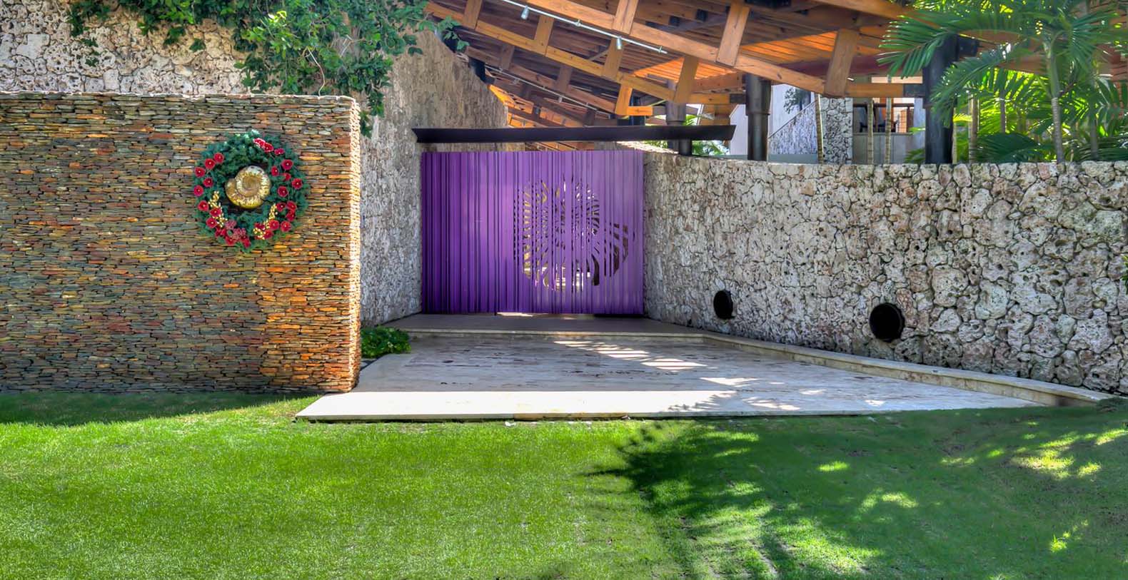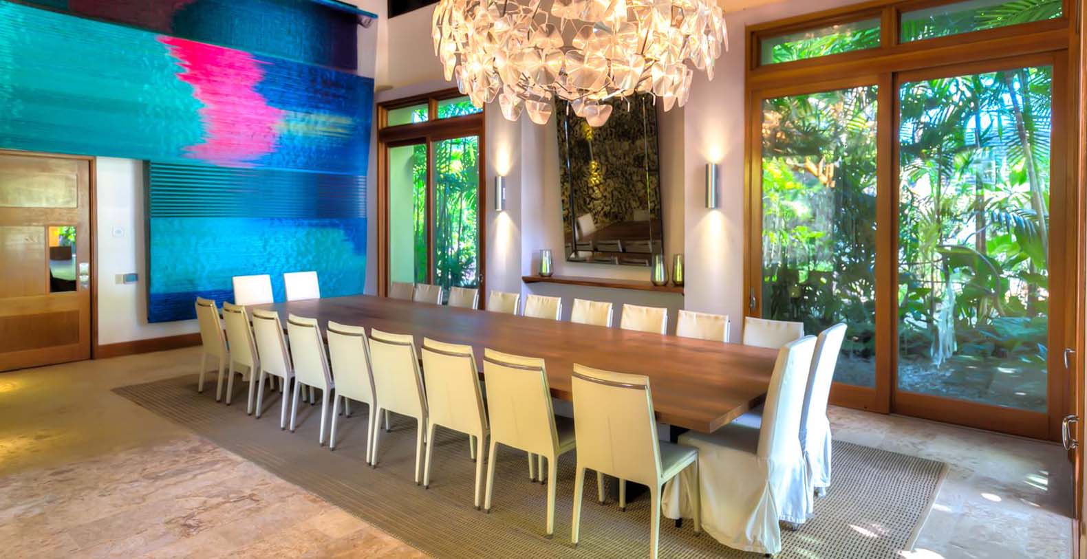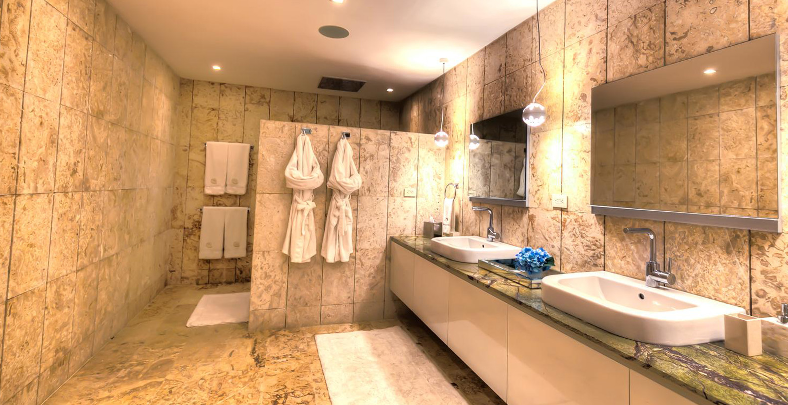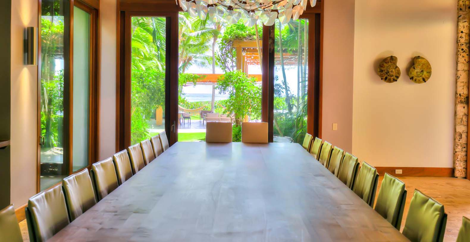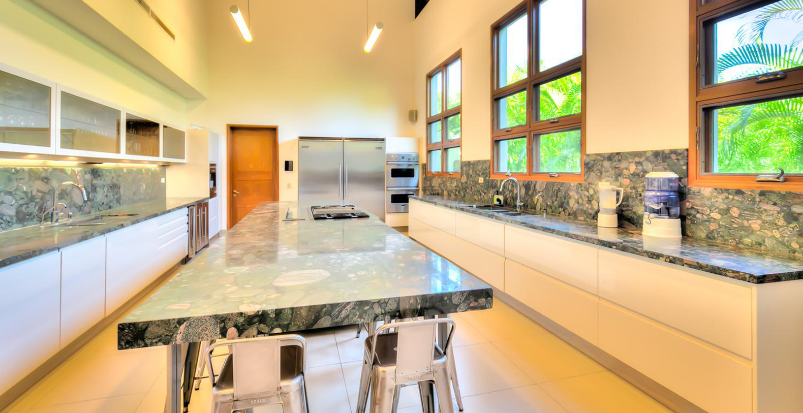 Carved in natural coraline stones and rectangular stone walls with a majestic blue ammonite shape, high-ceiled wooden the entrance will take all guests to one of the most envied and fabulous views of the Caribbean ocean. The way goes along a large aisle next to water mirrors with colorful fishes. To the left is the large and imposing dining room with a 22-seats table, modern art expressions and lighted up by a massive and genuine 3-levels chandelier. The fully-equipped kitchen with dual fridge, large kitchen island, breakfast bar, marble countertops, and dual sinks is always ready to get the most delicious local and international dishes from the high-skilled chef. The vast and ample living room is located at the end of the hall with sophisticated tapestry, high wooden apex ceilings, Italian design sofas, a wet bar, and access to the large garden, pool, and jacuzzi.
