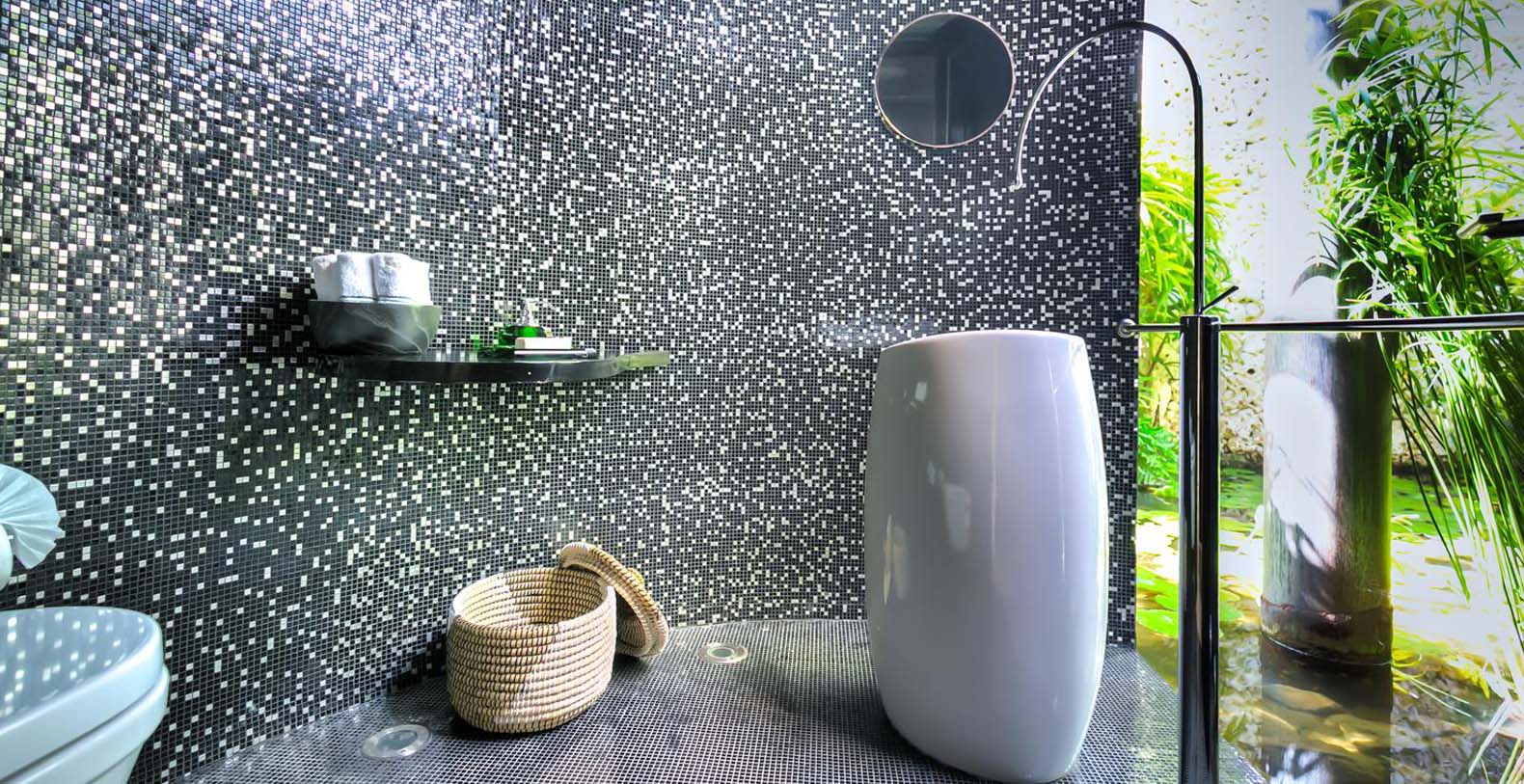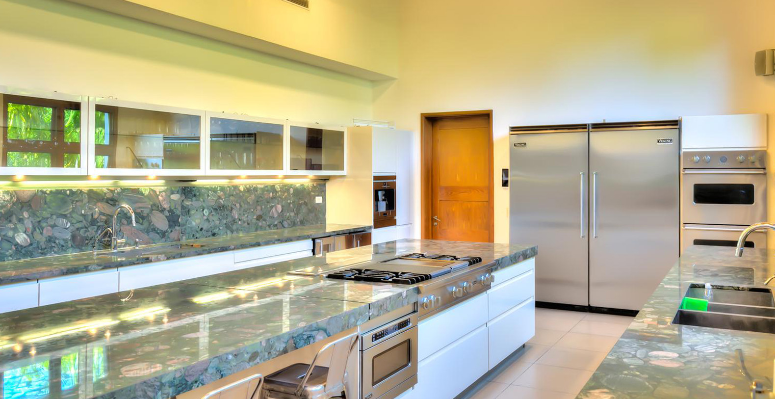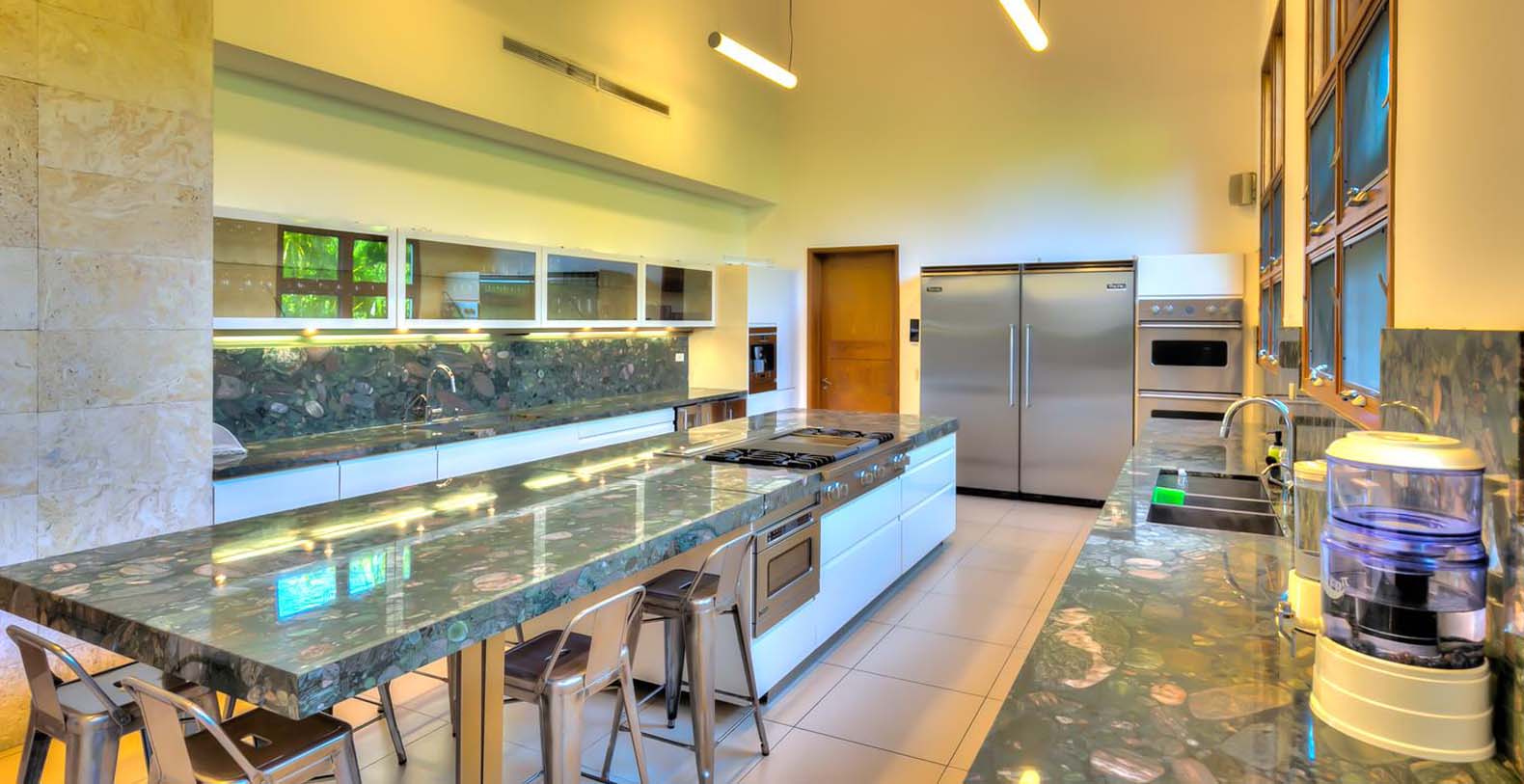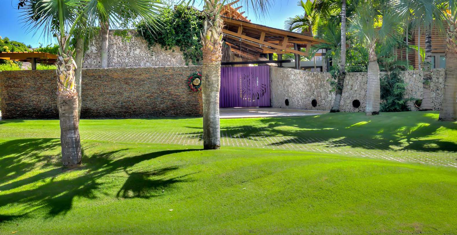 Carved in natural coraline stones and rectangular stone walls with a majestic blue ammonite shape, high-ceiled wooden the entrance will take all guests to one of the most envied and fabulous views of the Caribbean ocean. The way goes along a large aisle next to water mirrors with colorful fishes. To the left is the large and imposing dining room with a 22-seats table, modern art expressions and lighted up by a massive and genuine 3-levels chandelier. The fully-equipped kitchen with dual fridge, large kitchen island, breakfast bar, marble countertops, and dual sinks is always ready to get the most delicious local and international dishes from the high-skilled chef. The vast and ample living room is located at the end of the hall with sophisticated tapestry, high wooden apex ceilings, Italian design sofas, a wet bar, and access to the large garden, pool, and jacuzzi.