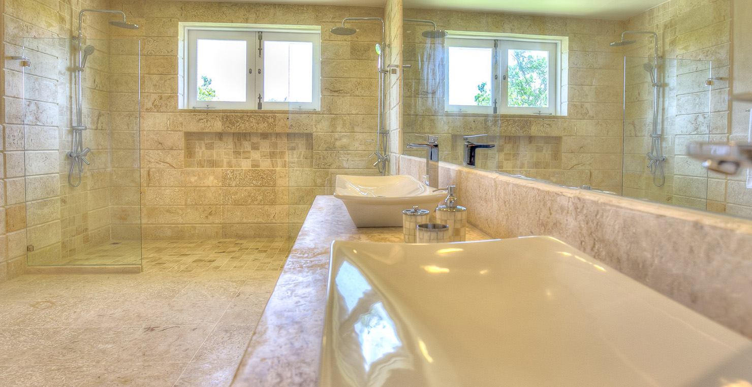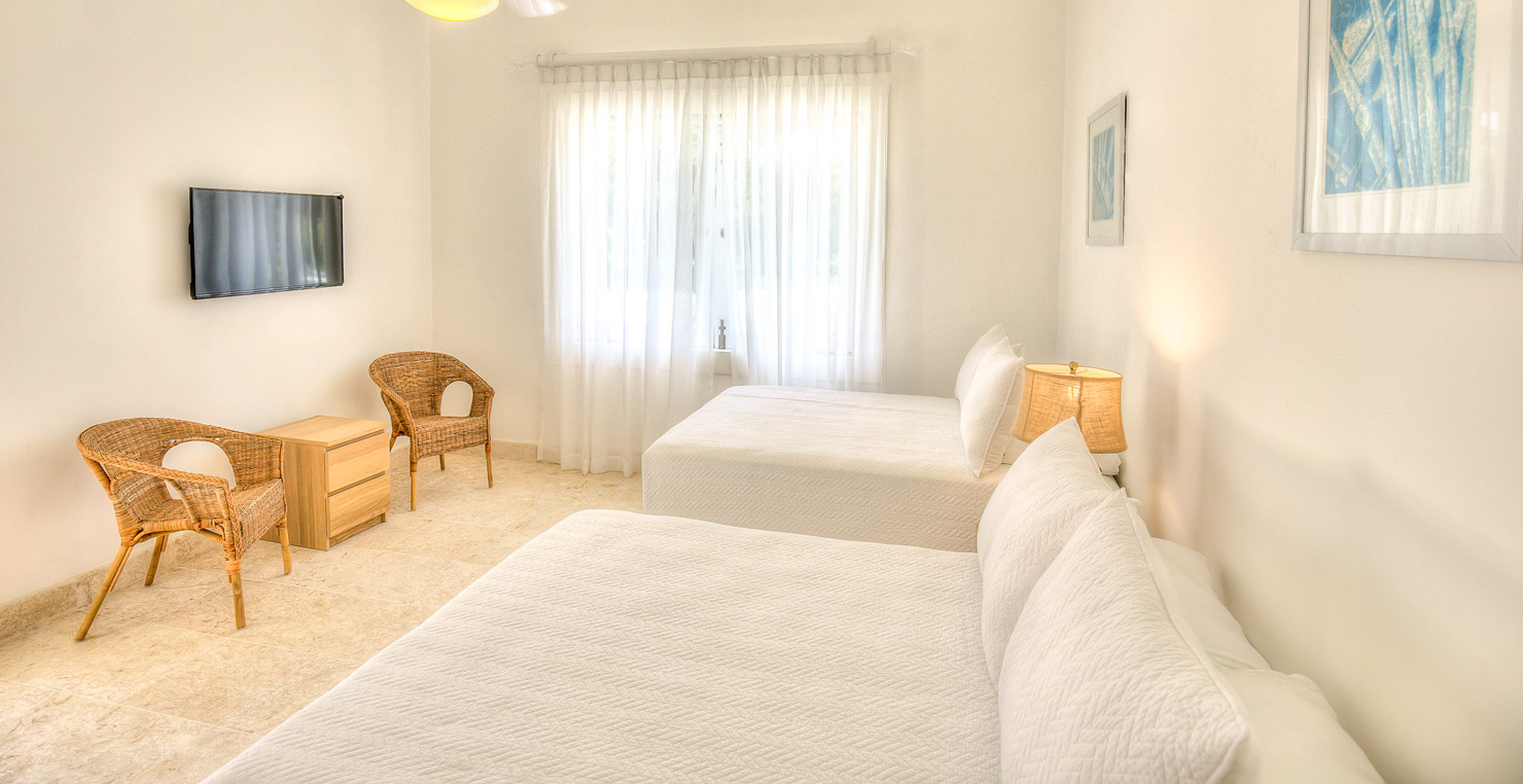 Surrounded by golf courses and green meadows this property offers a quality stay in any of its 5 bedrooms coupled each with its own ensuite bath. The master bedroom, located on the second floor has a king-size bed and on the same floor there are two other bedrooms with two queen size beds each. On the ground you will find two other bedrooms one with a king size bed and the other with 2 queen size beds. All rooms include air conditioning and TV's with international cable channels.