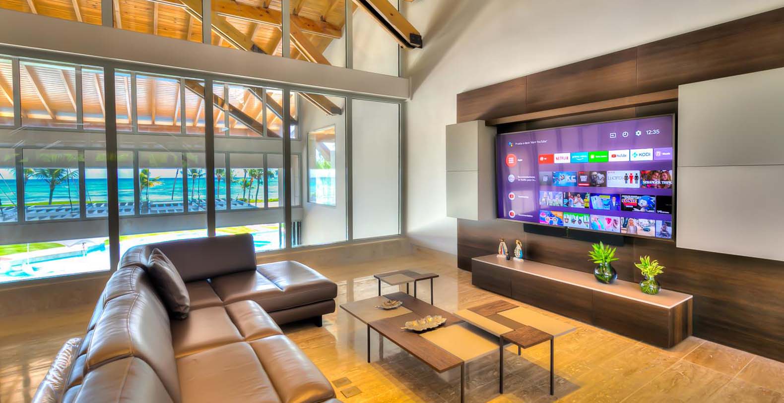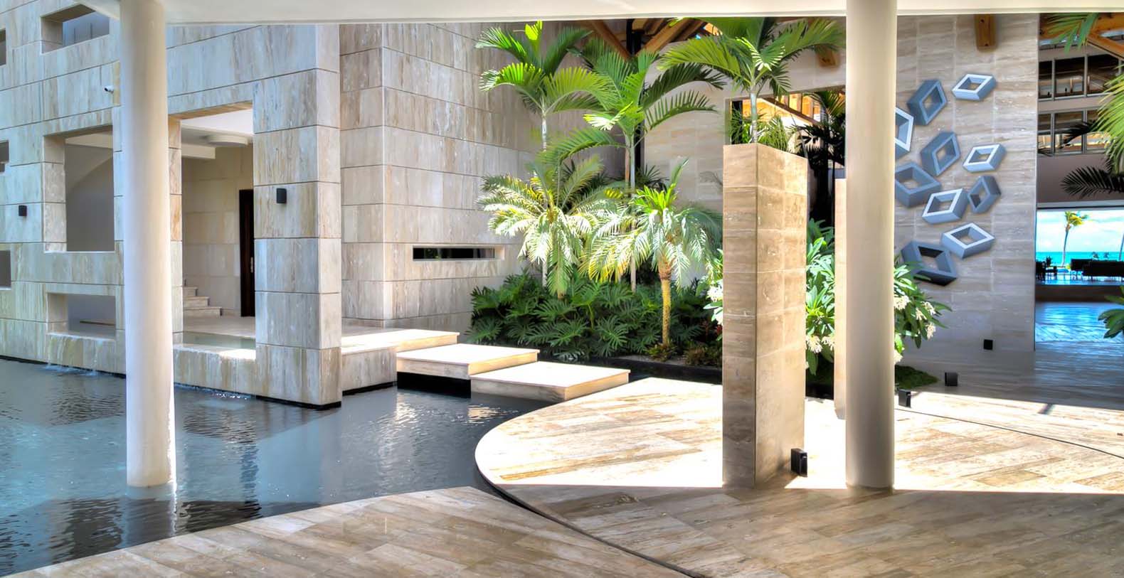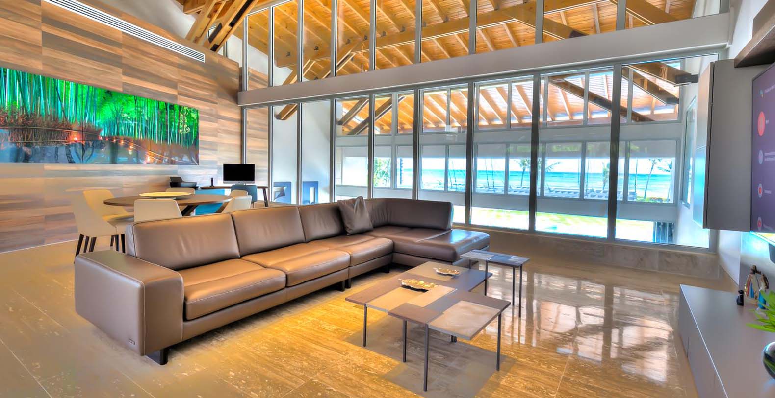 Like coming out of one of Picasso's masterpieces, the main entrance takes you through a long corridor next to a crystal-clear pond and rounded white columns while discovering the cubic facade that takes you to the main foyer of this splendid two-stories villa. The marble tiles on the floor and the coralina stones on the wall will guide you to the living room through a high ceiling with outstanding wooden beams and surrounded by evergreen palms and Caribbean vegetation. There, the breathtaking view of the blue-emerald ocean is perfectly balanced with the rattan chairs, couches and sitting places composing a smooth atmosphere. Stepping outside welcomes everyone to plunge into the large pool with a hot tub and to have a clean out-view to the endless Caribbean Sea. The diverse exterior living areas offer multiple options to enjoy the comfortable sea breeze.