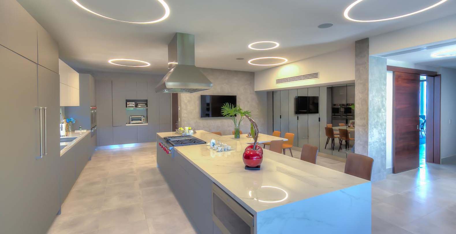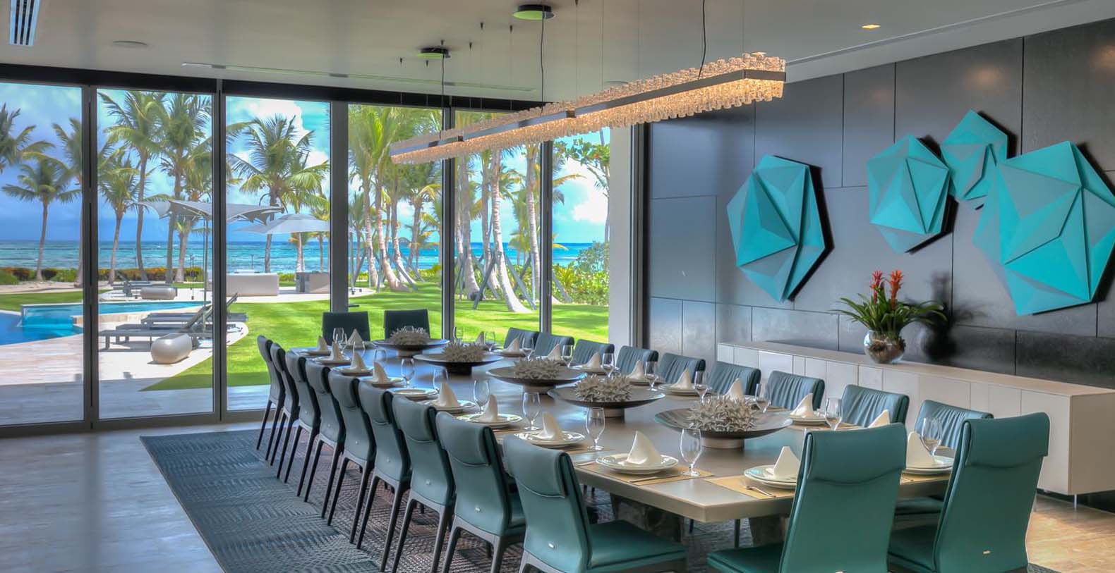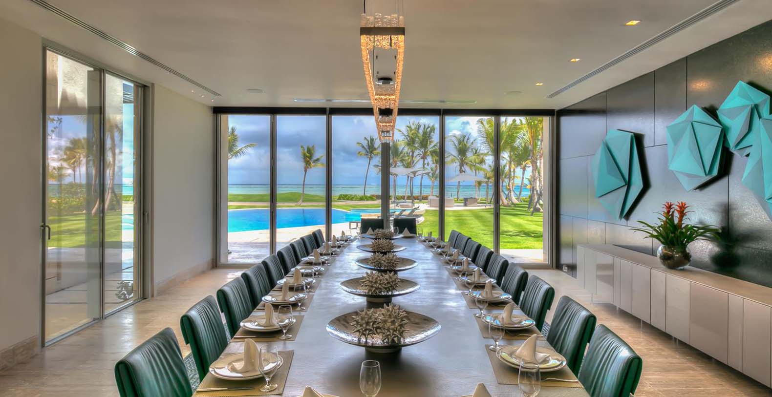 Next to the living room is the dining room with exquisite decor and a large table with enough space for 22 seated guests, The eyes are naturally led to the mesmerizing outdoor views and light is provided by a suspended rectangular and modern chandelier.