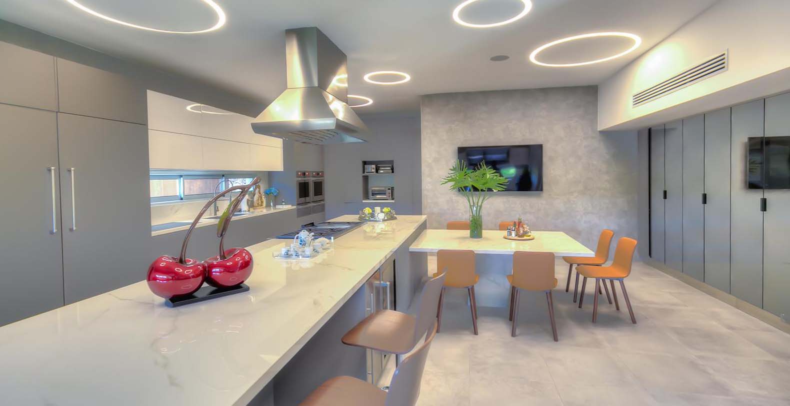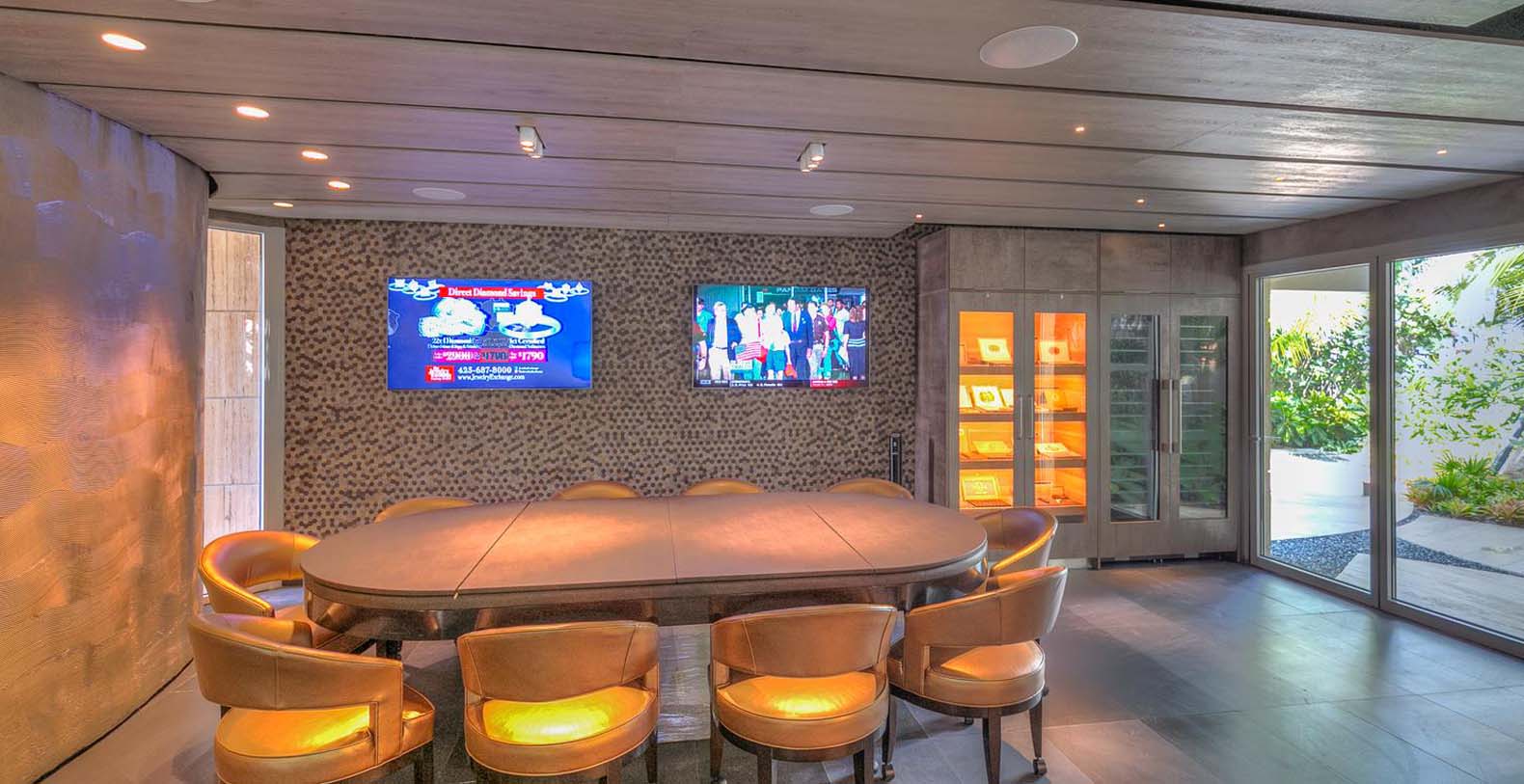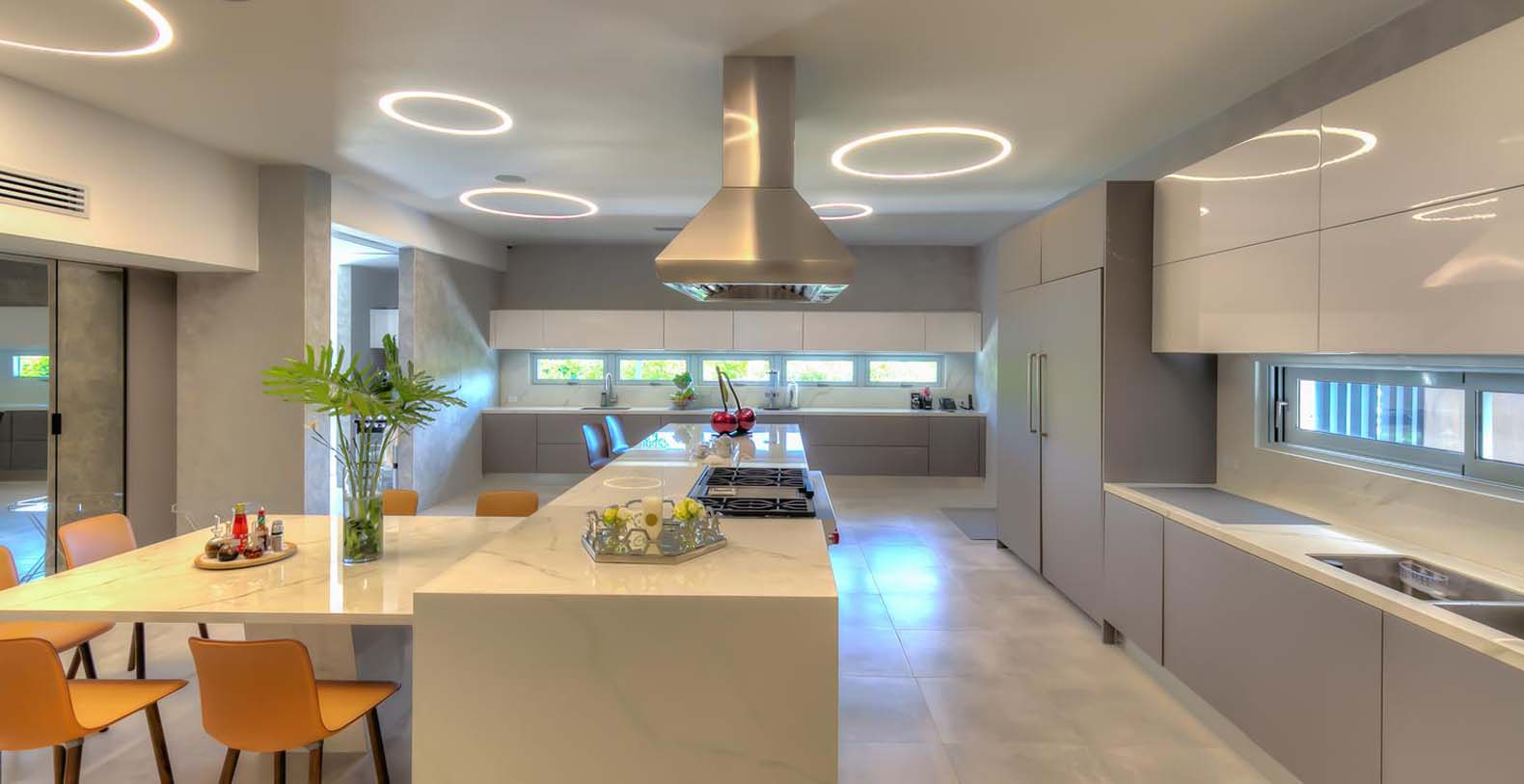 Next to the living room is the dining room with exquisite decor and a large table with enough space for 22 seated guests, The eyes are naturally led to the mesmerizing outdoor views and light is provided by a suspended rectangular and modern chandelier.