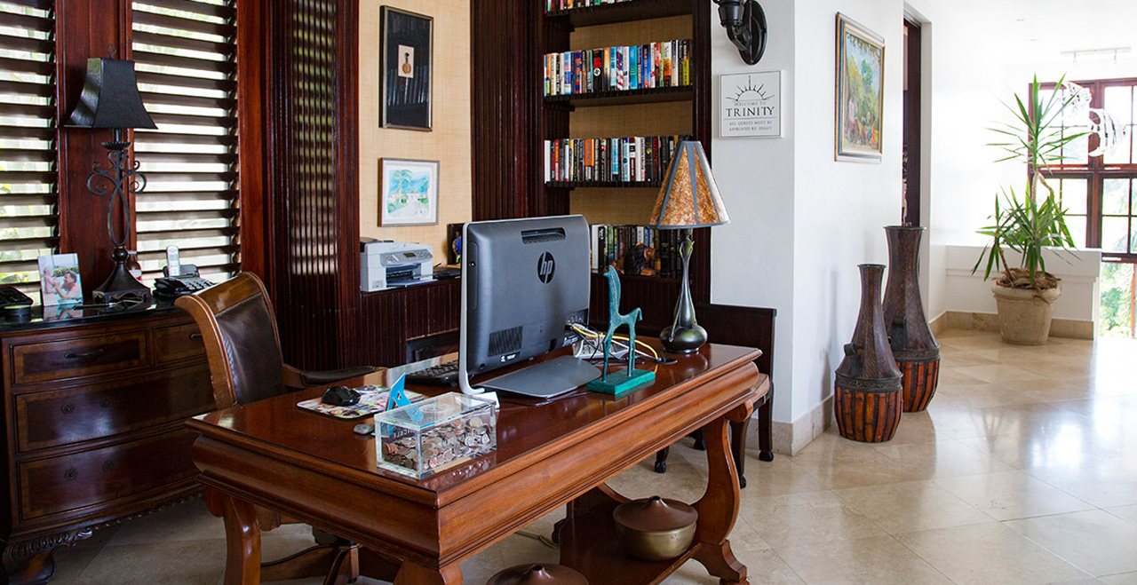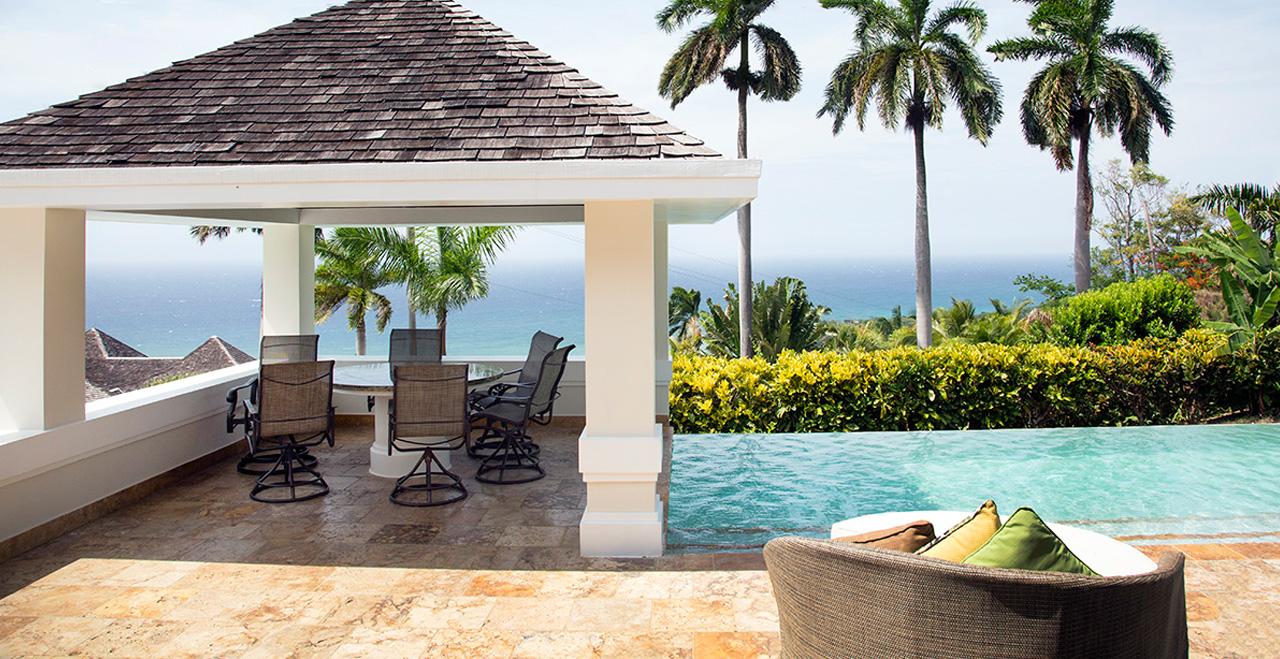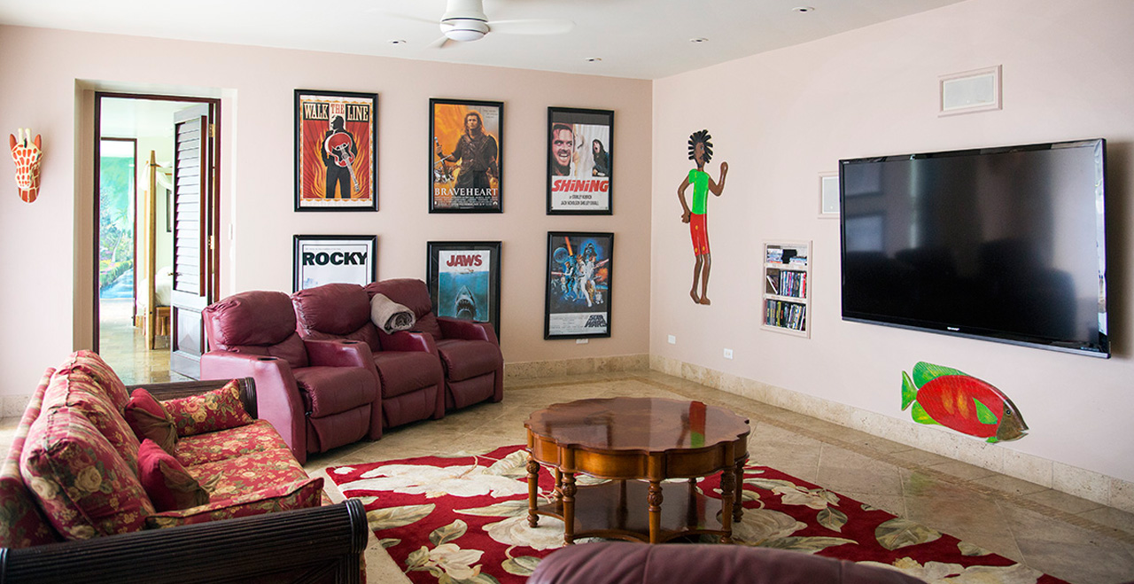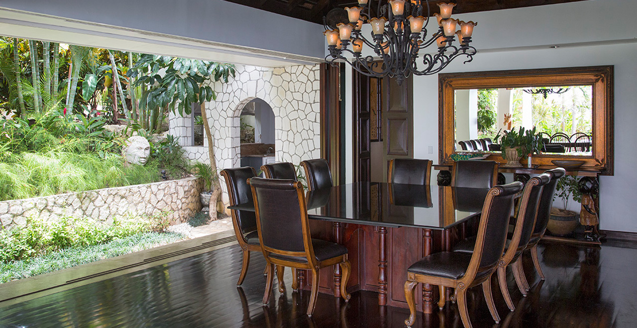 Trinity's exquisitely appointed great room opens out to the top patio area where the lap pool is located. There is a formal dining room for elegant candlelit dinners, complete with a beautiful custom made table. For more casual dining options, Trinity has a terrace dining table, as well as a covered gazebo that over looks the dramatic waterfalls. All of the public space rooms have wall size sliding glass doors allowing the magnificent views of the turquoise sea to be enjoyed at all times. The doors can be recessed into the walls, allowing for the enjoyment of the warm sea breezes and tropical air inside. Gorgeous Italian tile can be found throughout the villa, from the cigar room to the media room.