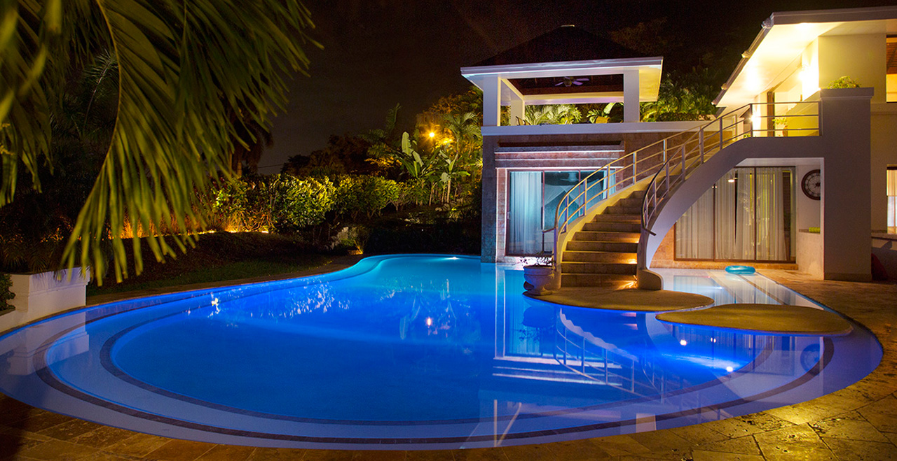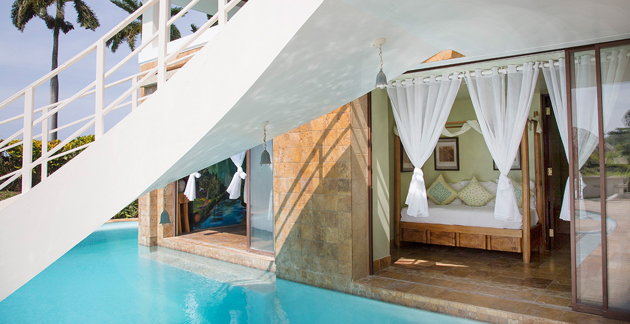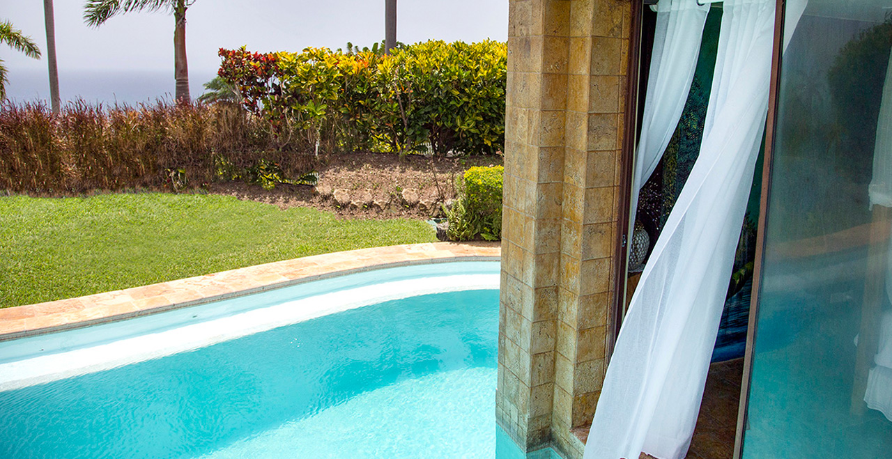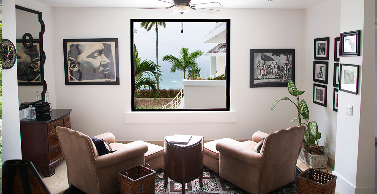 Trinity's exquisitely appointed great room opens out to the top patio area where the lap pool is located. There is a formal dining room for elegant candlelit dinners, complete with a beautiful custom made table. For more casual dining options, Trinity has a terrace dining table, as well as a covered gazebo that over looks the dramatic waterfalls. All of the public space rooms have wall size sliding glass doors allowing the magnificent views of the turquoise sea to be enjoyed at all times. The doors can be recessed into the walls, allowing for the enjoyment of the warm sea breezes and tropical air inside. Gorgeous Italian tile can be found throughout the villa, from the cigar room to the media room.