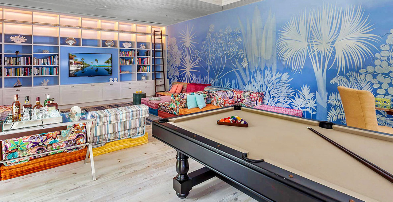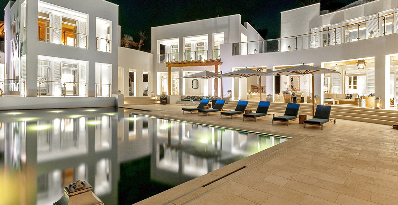 In addition to the seven bedrooms the 13,000 square feet of living space includes: two living rooms separated by a bar, one indoors with a spectacular vaulted ceiling and mosaics imported from Morocco, the other on a covered terrace with views of the pool and sea below, a dining room that seats 14, a television room that can also convert into an eighth bedroom, a powder room, and a gourmet kitchen.