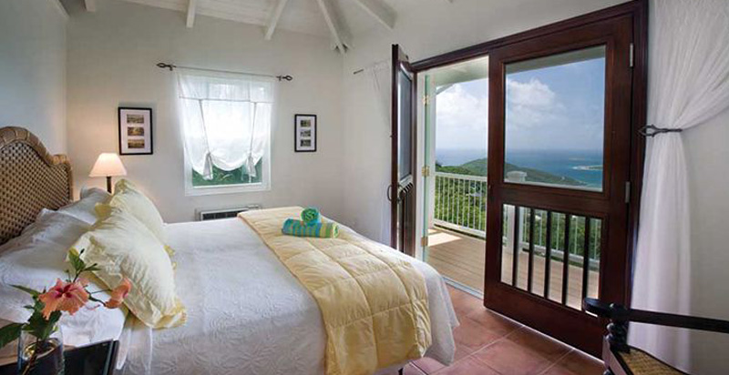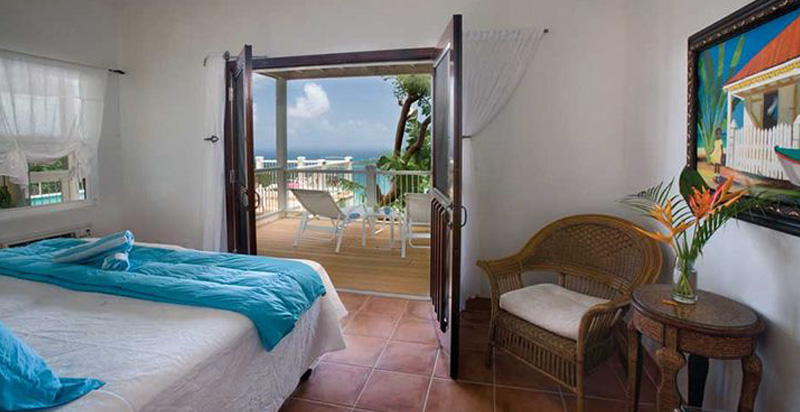 This alluring red-roofed villa features four air-conditioned bedrooms situated in two two-story pavilions, bisected by the cool pool in between. In the west pavilion, on Great Turtle's main level, are the elegant living and dining areas, the fully-equipped kitchen, laundry closet and a powder room. Screened mahogany french doors open out from the kitchen and living areas to a newly-extended covered verandah set for alfresco dining with a view, with table and chairs, a gas grill and comfortable wicker rocking chairs for reading, cocktails and conversation, or for enjoying the cool tradewinds and the mesmerizing wide-angled vistas of sky, sea and islands. This verandah connects to the main level's second pavilion, separated for excellent privacy by a large palm tree, and to its air-conditioned Yellow Suite, a high-ceilinged king bedroom/bath suite.