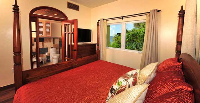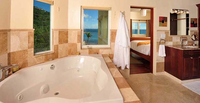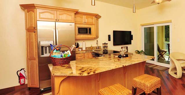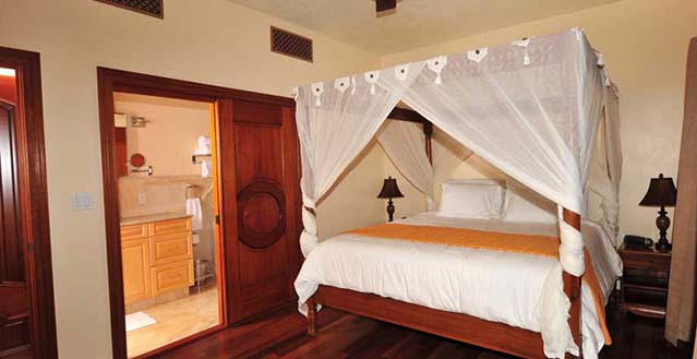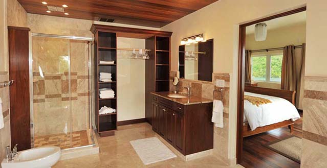 Situated side-by-side on Seashore Allure's main level are FOUR stylish ONE-BEDROOM VILLAS (Areola, Crumena, Drupe and Trochas), all with central air-conditioning and fabulous king bedroom/bath suites. Each king suite offers a canopied, sink-into four-poster king bed, and an ensuite bath, inviting romance and relaxation in luxe style. Each adjoining bath is beautifully laid out in travertine tile with a granite countertop. The bath offers a magnifying mirror and an ample shower with a Kohler rain shower inset into the ceiling and bodyspray shower on the side (the two one-bedroom end units also have a jacuzzi bathtub and a bidet!)