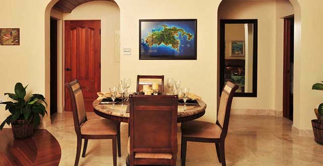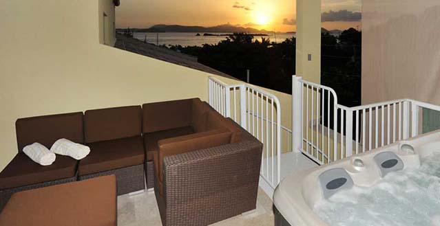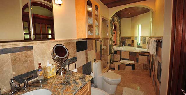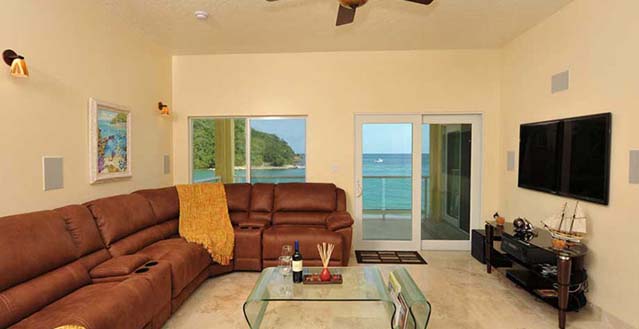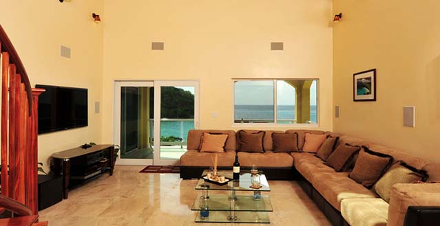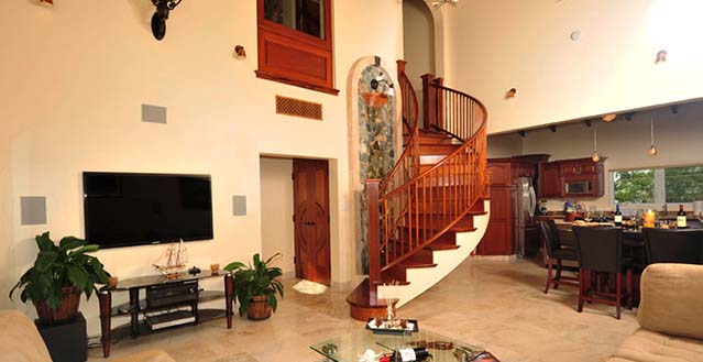 On the upper level are Seashore Allure's TWO fabulous THREE-BEDROOM VILLAS, Nautilus and Ramosus. These two bi-level villas each feature a living/dining area furnished with a large sectional leather sofa with electronic reclining seats for lounging in front of the 55-inch flat-screen HDTV. On these villas' main levels are two bedrooms, each with a king-sized bed and an ensuite bath, and beautifully decorated. All of these main-level baths feature a double vanity and a large walk-in shower of native bluebit stone and artistic tile work. In each villa, set against a dramatic, spotlighted waterfall which cascades down a natural stone wall, a graceful staircase curves up to an upper level where the penthouse king bedroom suite looks out to a dazzling, wide-angle ocean panorama from its own private verandah. Its adjoining bath is beautifully laid out in travertine tile with granite countertops, offering a glassed-in shower, jacuzzi bathtub for two and a bidet. From either the living area or from the upper penthouse suite, step outside to one of the private verandahs - you're at the top of the world.