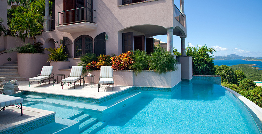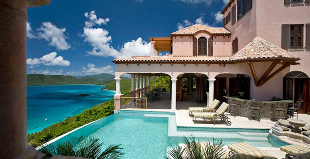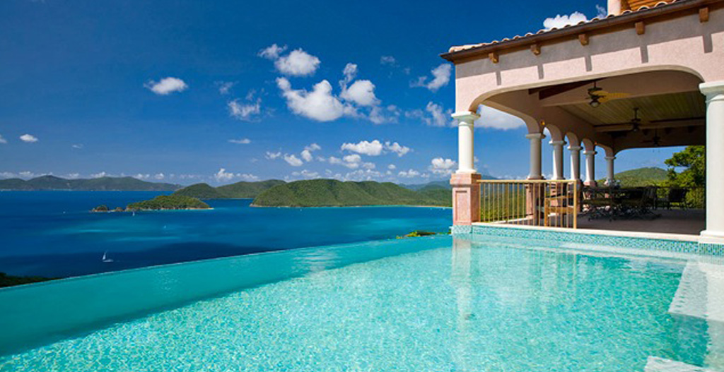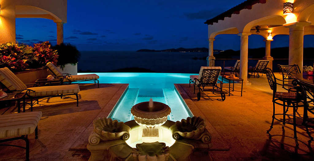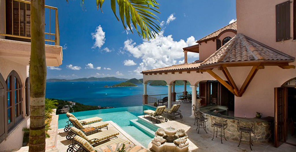Luxurious Villa Carlota offers five large air-conditioned bedroom/bath suites in three pavilions. Through an electronic gate and from the driveway courtyard, a native stone entryway welcomes you; a graceful coralstone staircase curves down to the expansive terrace where an Italian baroque lion's head fountain spouts a bubbling welcome. A second Italian marble fountain gurgles at the pool's edge, a large infinity-edge pool which blends into the magnificent 180-degree view of Peter Bay below and the Caribbean Sea beyond, a vista dotted with the islets and cays of the U.S. and British Virgin Islands. All of the perfect National Park beaches, such as Trunk and Cinnamon Bays, are less than a 10-minute easy drive from Villa Carlota.