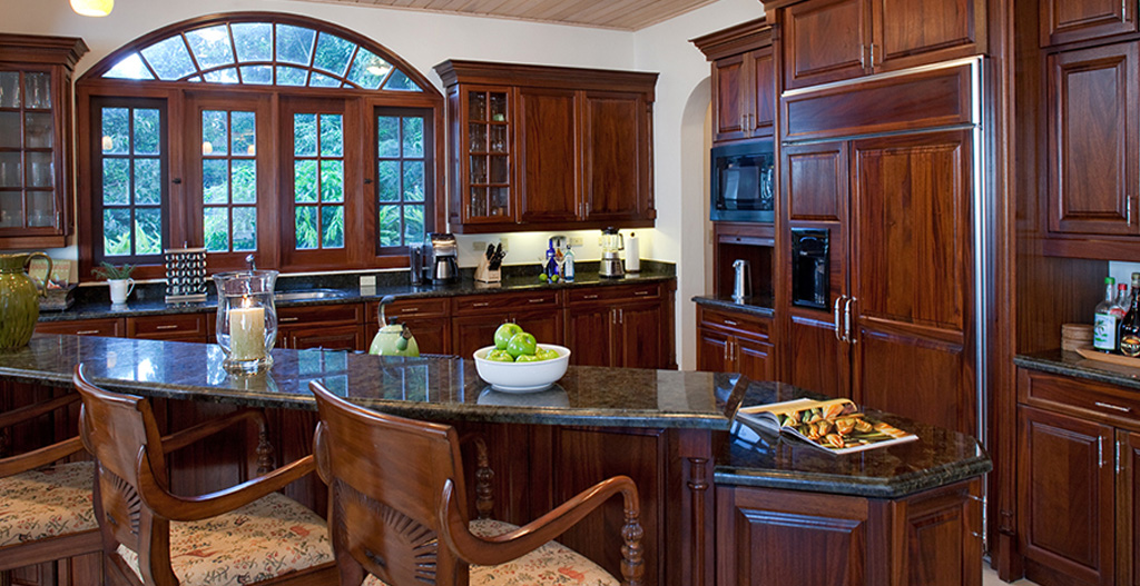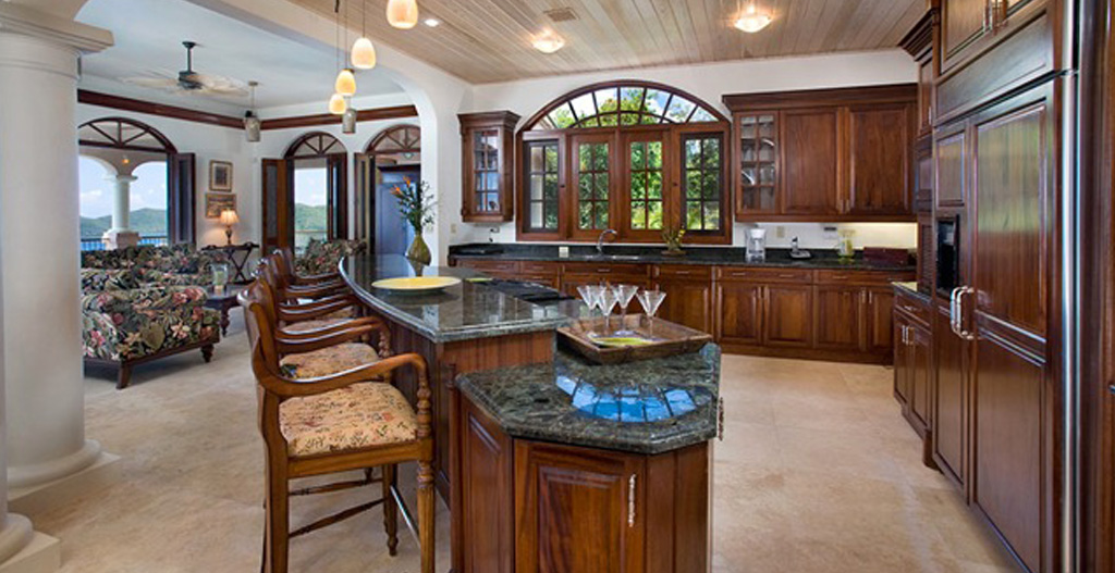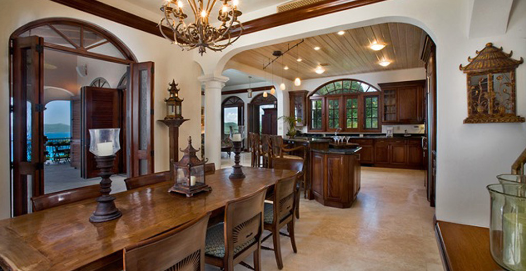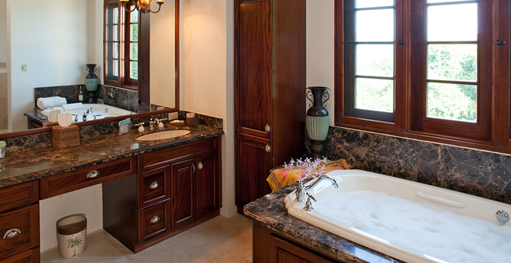 The villa's main pavilion, centrally air-conditioned with adjustable controls, features a spacious Great Room (the "India Room") which incorporates a large gourmet kitchen done with a cypress ceiling, Brazilian granite, custom mahogany cabinetry, and bordered by a long countertop with stools. Adjacent is the dining area where an 18th-century Balinese teak monastery door serves as the dining table; a convenient powder room is right around the corner. On the other side of the Great Room is the living area, set with comfortable sofas, chairs and a media center with a 50-inch flat-screen satellite TV, a Bose sound system, and extensive movie and music collections for your enjoyment. Louvered and screened mahogany doors open from the living area to the dramatic sweep of the deep covered verandah which overlooks the majesty of turquoise ocean views, emerald islands and blue sky. A large table on this verandah and artful lighting invite alfresco dining with a view.