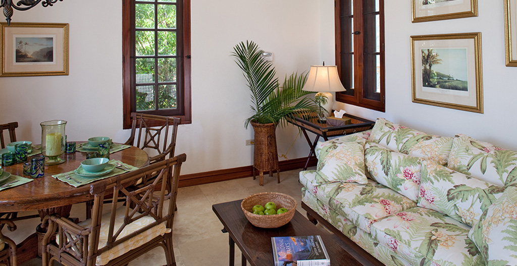 The driveway courtyard has ample parking and turning space for three cars, and an outside shower for after-beach rinse-offs. Across this courtyard is the charming Cottage Suite, nicely secluded from the rest of the property. The air-conditioned Cottage Suite is distinguished by cool travertine tile, a living area with a balcony overlooking the main villa, a full bath, a small kitchen with a covered patio for alfresco meals, and on its upper level, a king (or two-twin) bedroom with a full bath, a large verandah off to its side, a step-out balcony in front, and an ensuite bath.