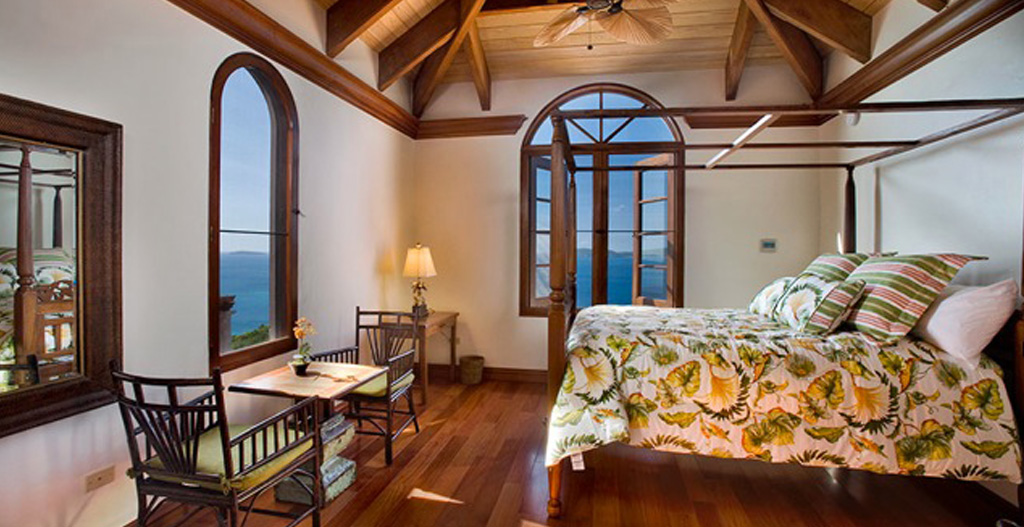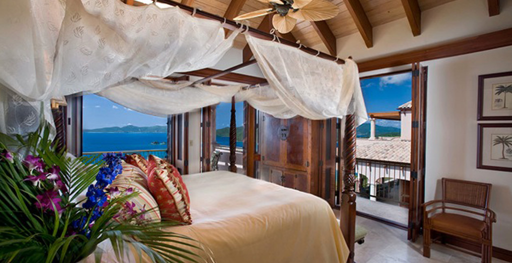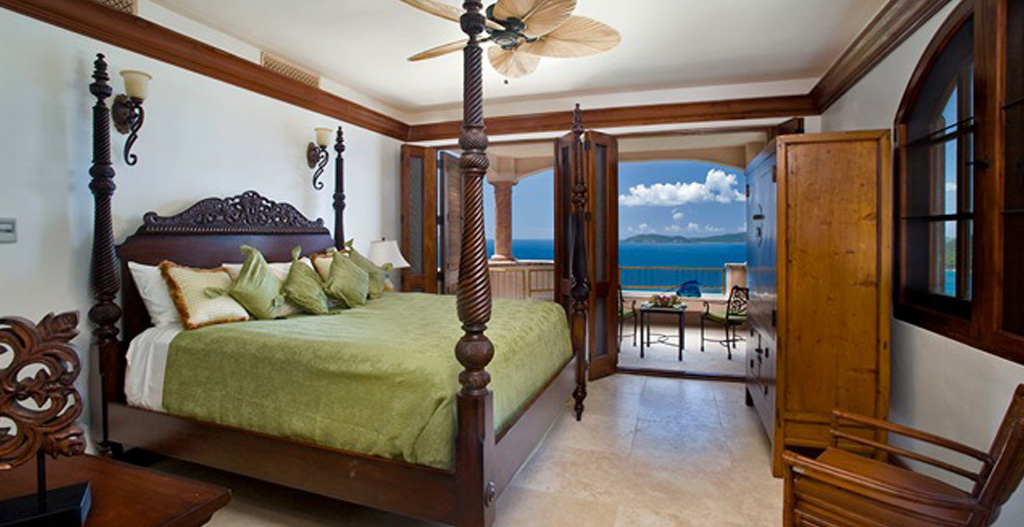 Continuing up the winding staircase from the master suite level to Villa Carlota's third level, a second bedroom/bath suite, this one with a four-poster queen bed awaits; the views from this suite's windows are spectacular.