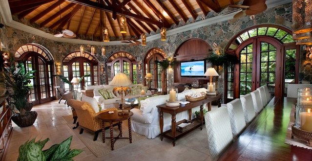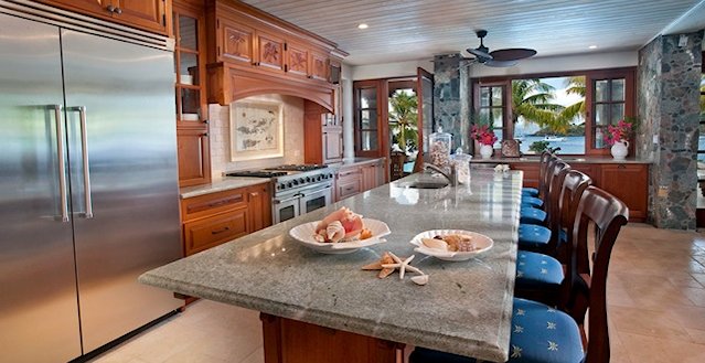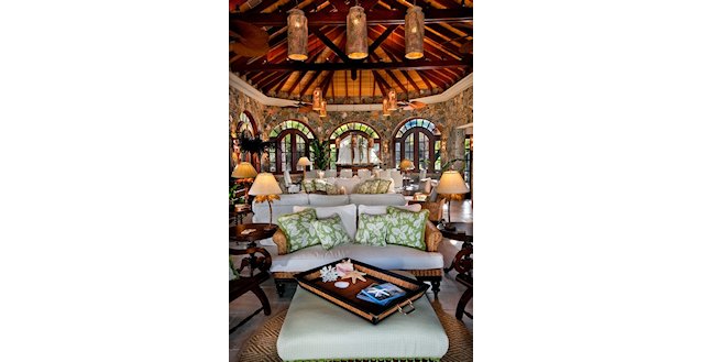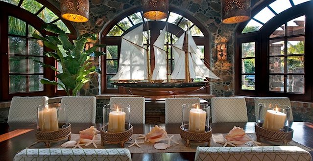 Within the sun-kissed world of A La Mer, the Main Villa takes center stage, embraced by the aquamarine pool and the pool cabana, and bordered by a faux white-sand beach set with chaise lounges and a fire pit brazier. The expansive fully air-conditioned two-story Main Villa features seven bedroom/bath suites and a beautifully-proportioned Great Room graced with high arched windows and artistic stonework crafted in the classic St. John style. White slipcovered sink-into sofas and chairs are grouped around the Great Room to accommodate a large party, and a mahogany dining table for 14 is flanked by a stunning model yacht in full sail. Adjoining the Great Room, on the other side of the tiled entry foyer, is the large gourmet kitchen with a Viking range, a center island, lots of countertop space for several cooks, and a convenient pass-through window to the outdoor poolside dining area. The kitchen area also offers a wet bar with a beverage cooler and ice machine; behind that is a powder room looking into a walled garden.
